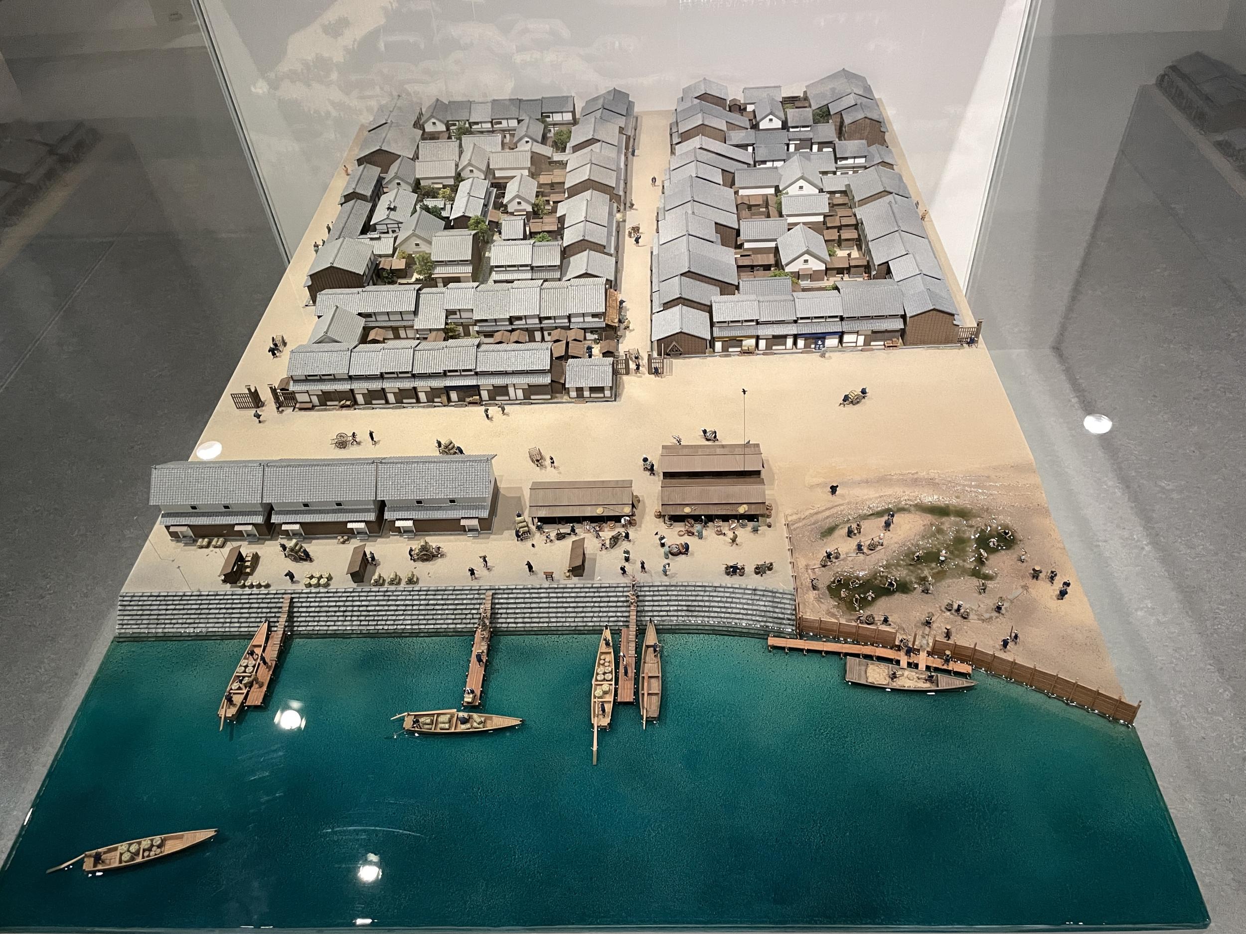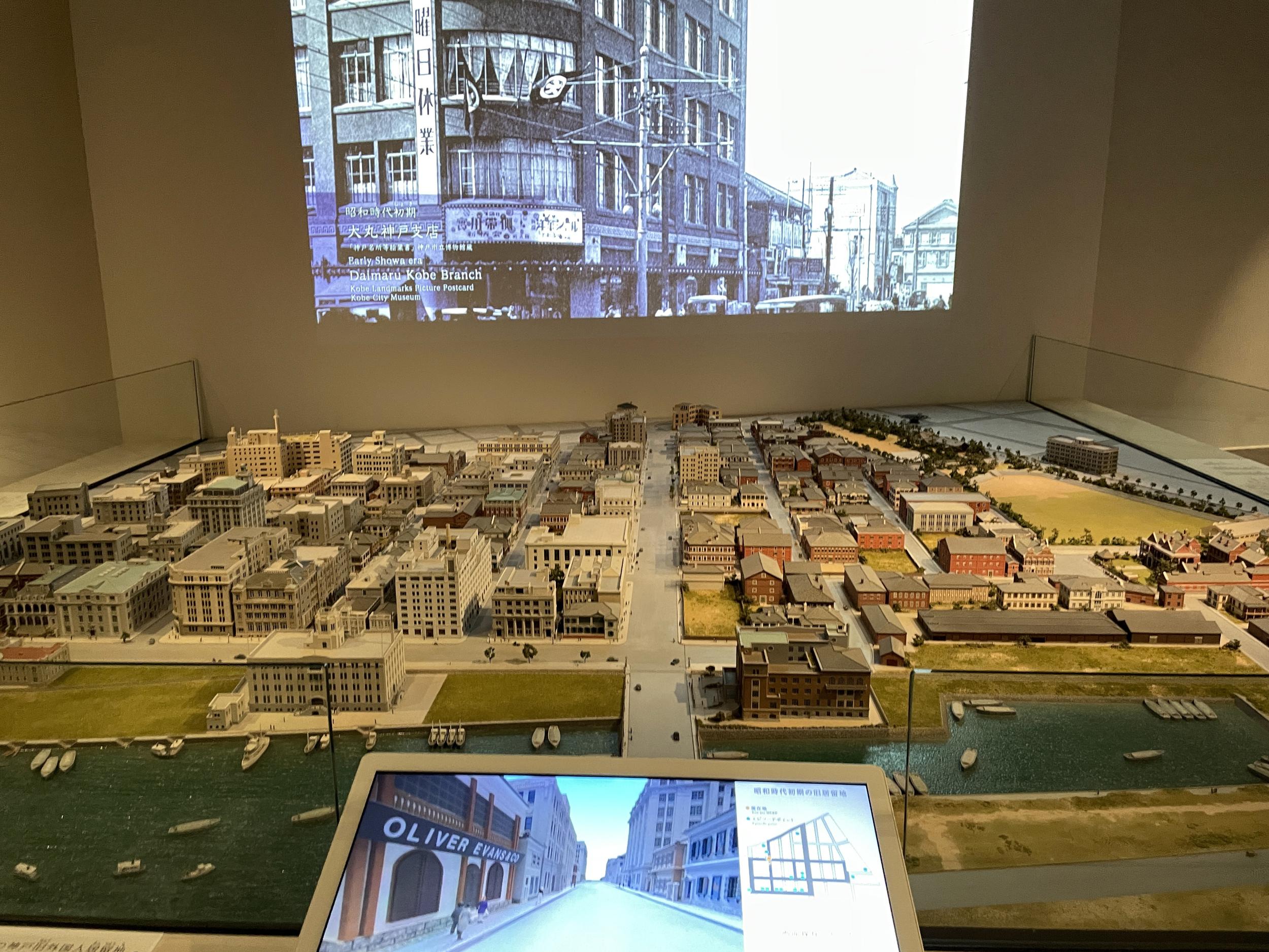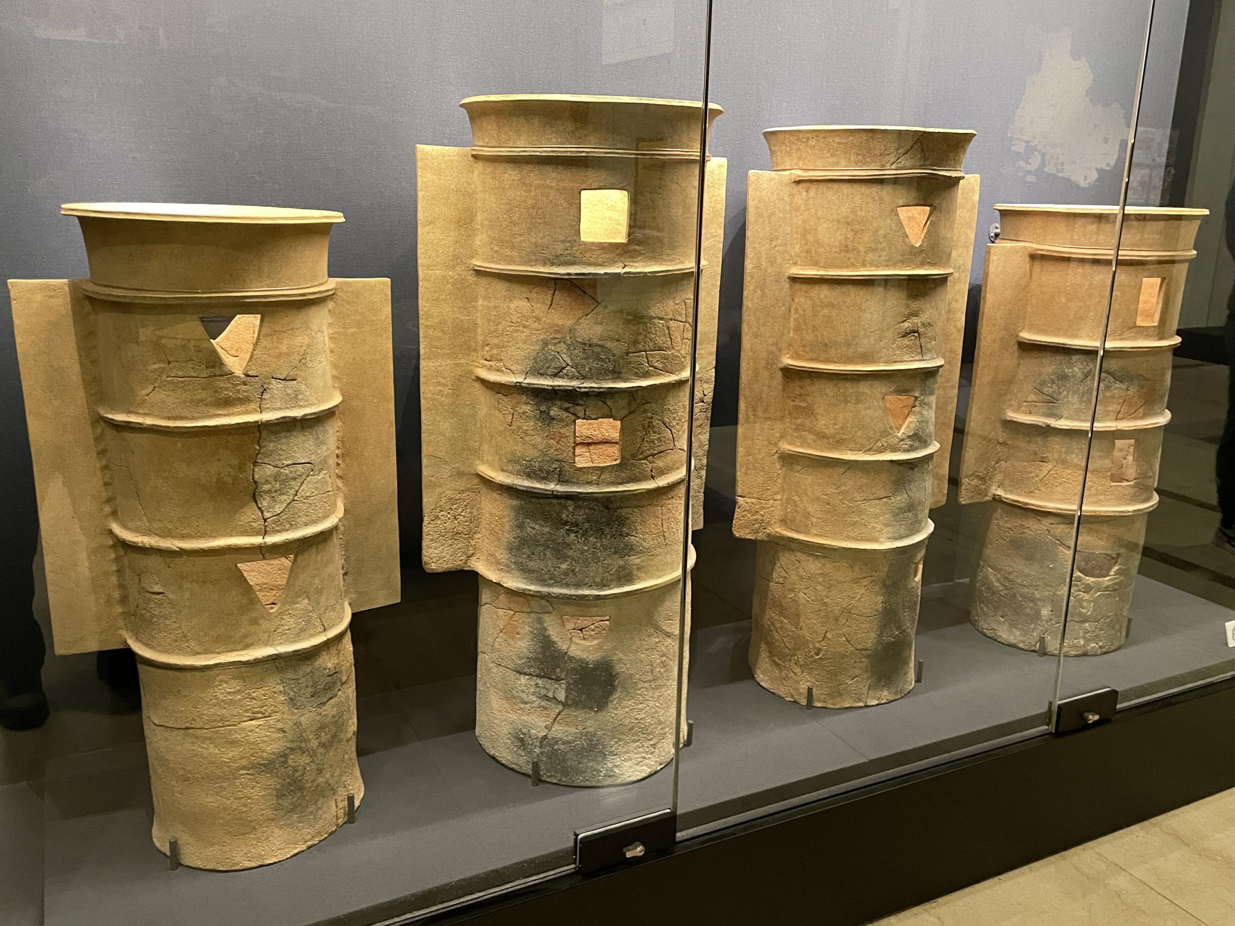無料で見学できる1階の神戸の歴史展示室に入ると、訪ねたことのある五色塚古墳のジオラマ。ショーケースに並べられた円筒埴輪は現地にびっしり並べられていたレプリカの実物のようです。