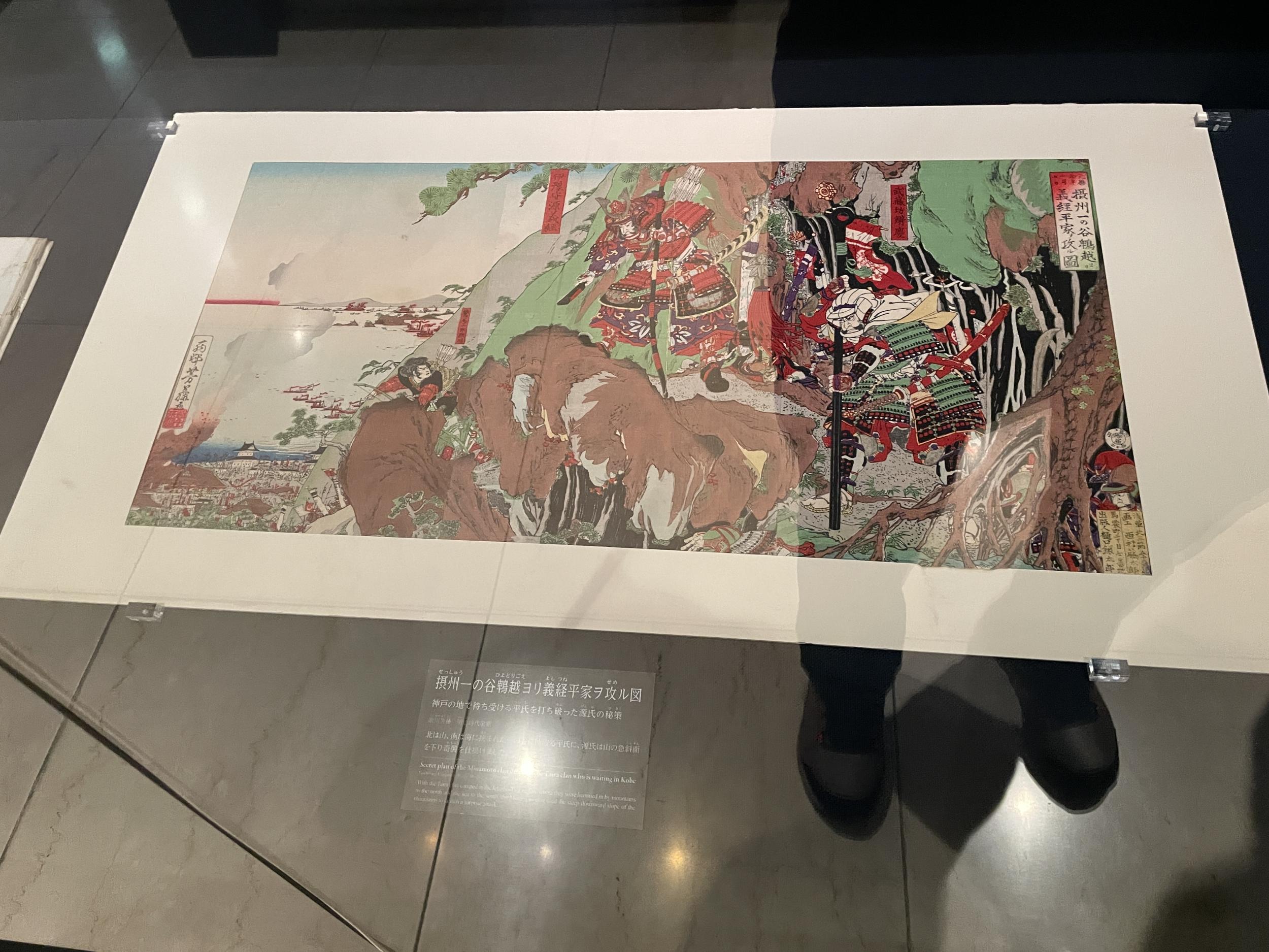 摂州一の谷鵯越ヨリ義経平家ヲ攻ル図、弁慶の前に自分の足が写り込んでしまっていますが歌川芳藤の錦絵です。電車やバスの中で平安鎌倉紀行を読み進み、宮脇センセイは新幹線の新富士を通過する辺りで水鳥の飛び立つ音に驚いて敗走した平家の大軍を偲び、「木曾殿と背中合わせの寒さかな」と句碑のある義仲と芭蕉の墓の並ぶ膳所を訪ねた後、神戸三宮へ。鉄拐山か鉢伏山あたりのハイキングコースを歩いて鵯越の逆落としを体感するには寒すぎるので一の谷へ直行、鉢伏山をロープウェイで往復して、須磨浦公園で敦盛と熊谷直実を偲んでいます。この辺のくだりは自分も地図を参照しつつ吉川英治の新・平家物語をじっくり読んだのでしっかり頭に入っています。
