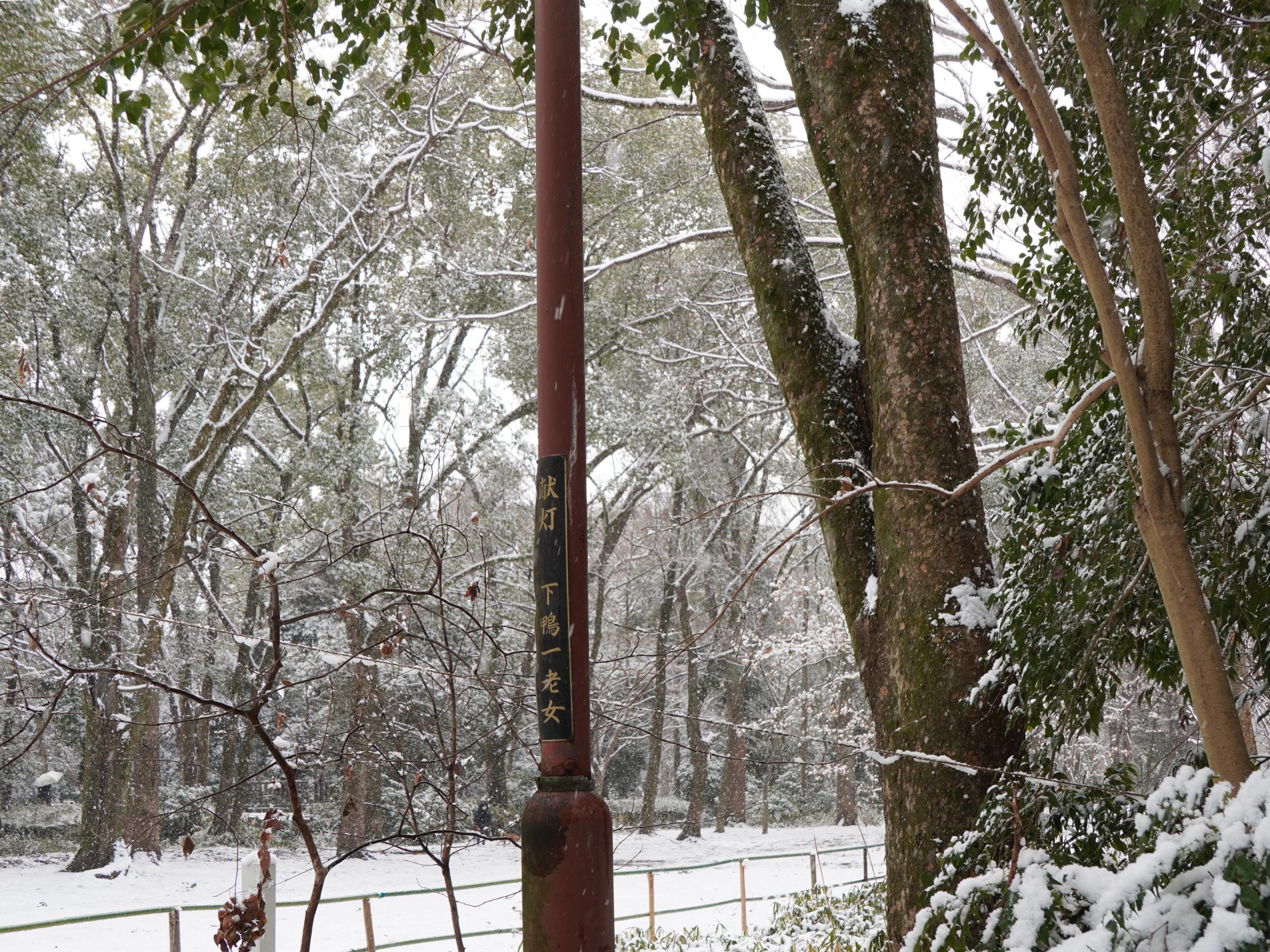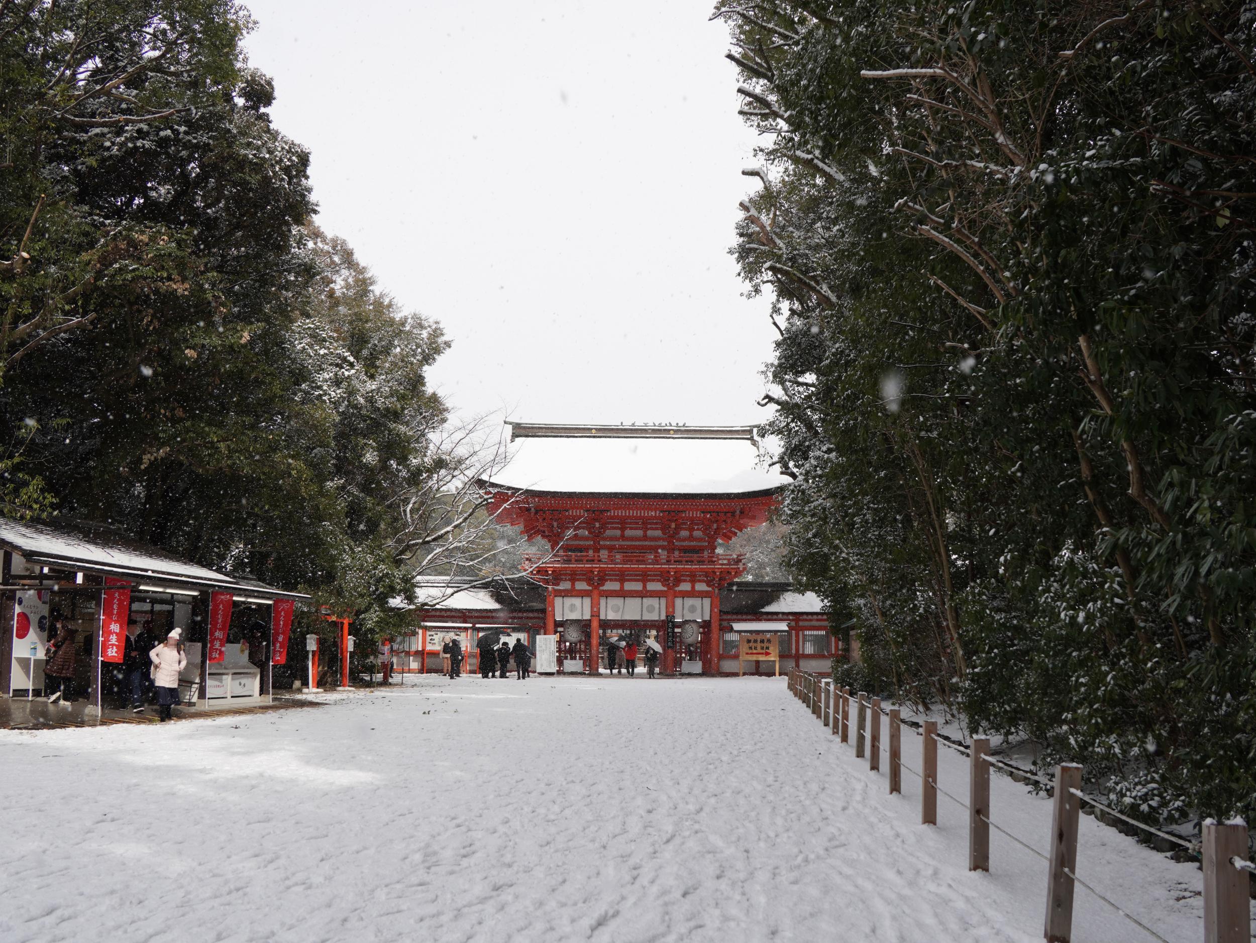 下鴨神社の楼門です。雪が降っていても結構賑わっています。