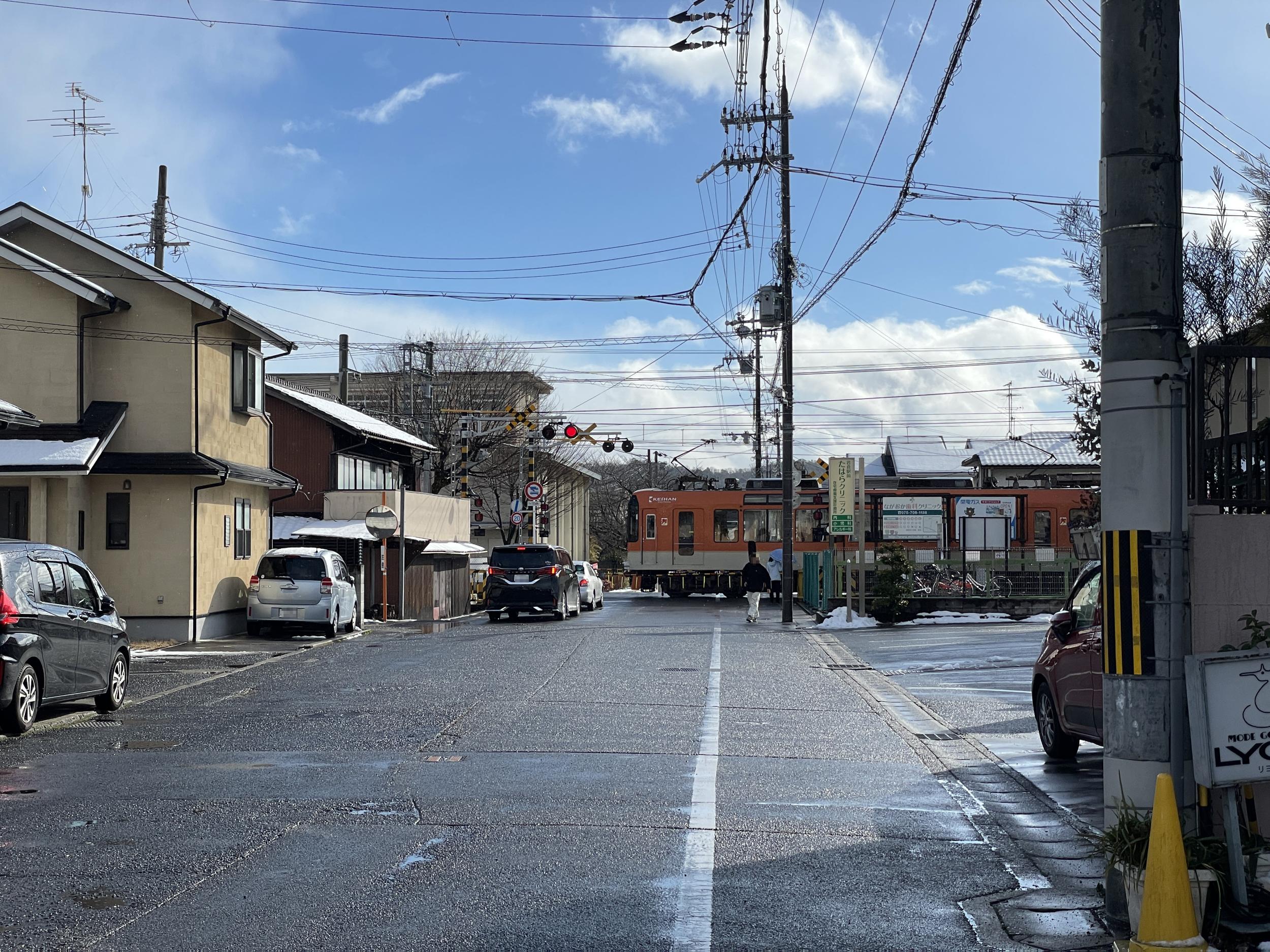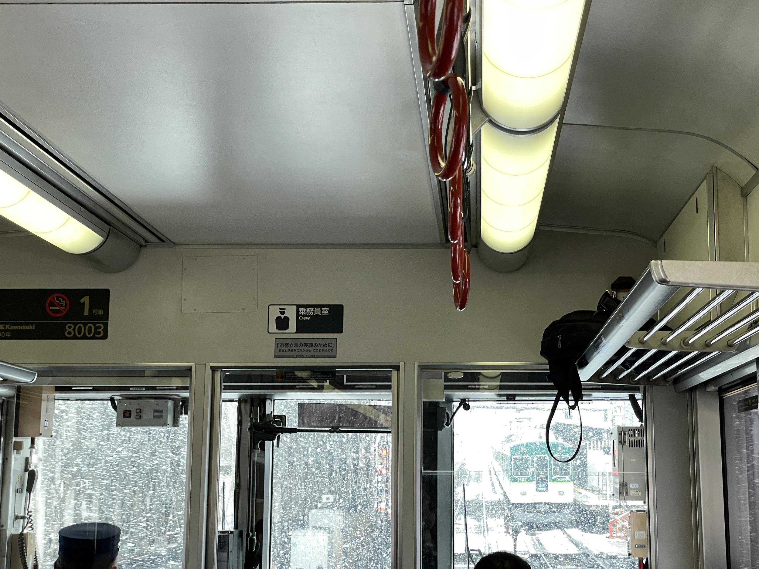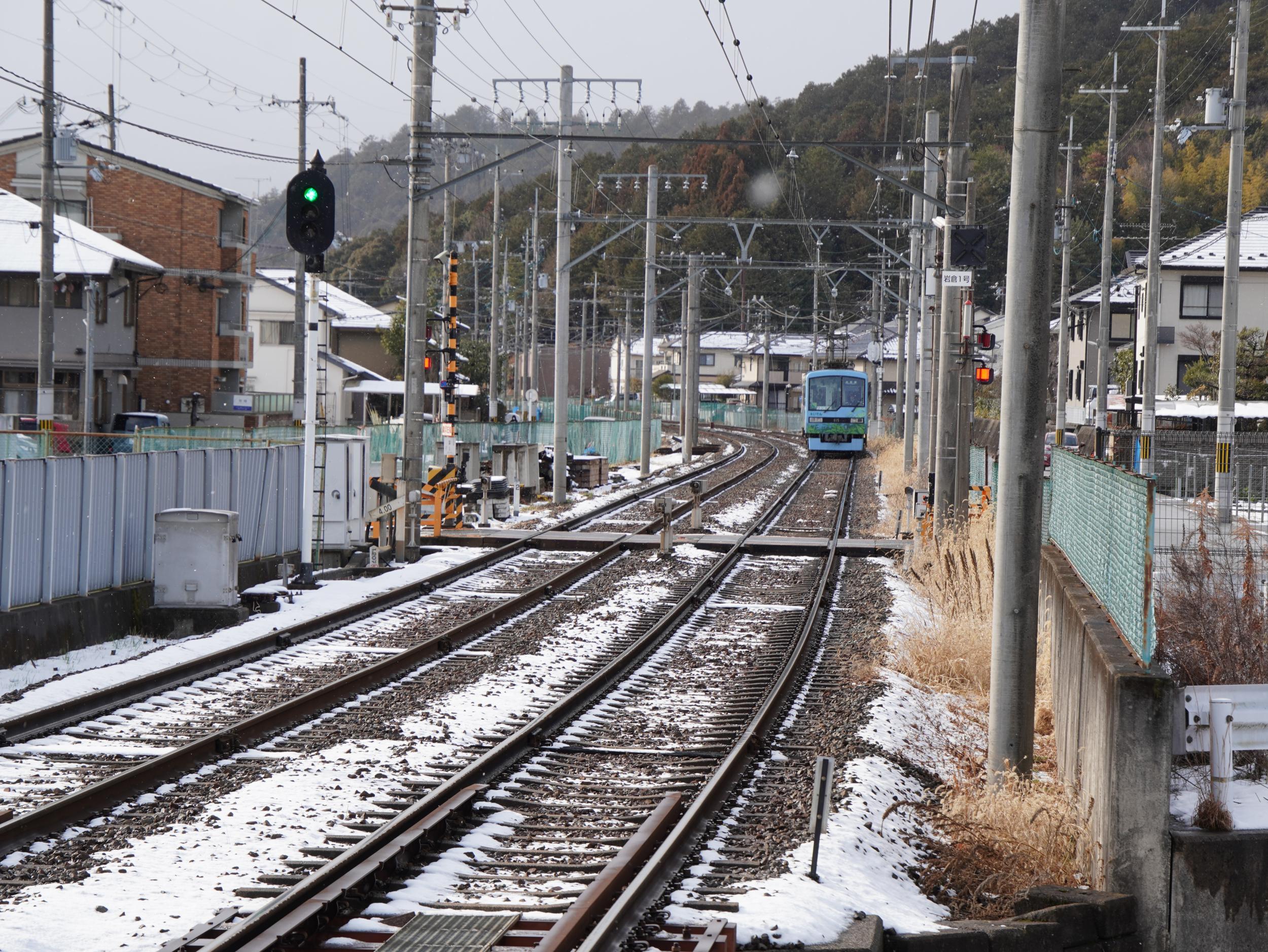 中書島駅のホーム端に撮り鉄さんがビッシリ。何が来るのかと思いきやほどなくして復刻塗装の2200系とすれ違いました。雪景色の復刻塗装狙いだったようです。東福寺付近から雪が激しくなってきました。