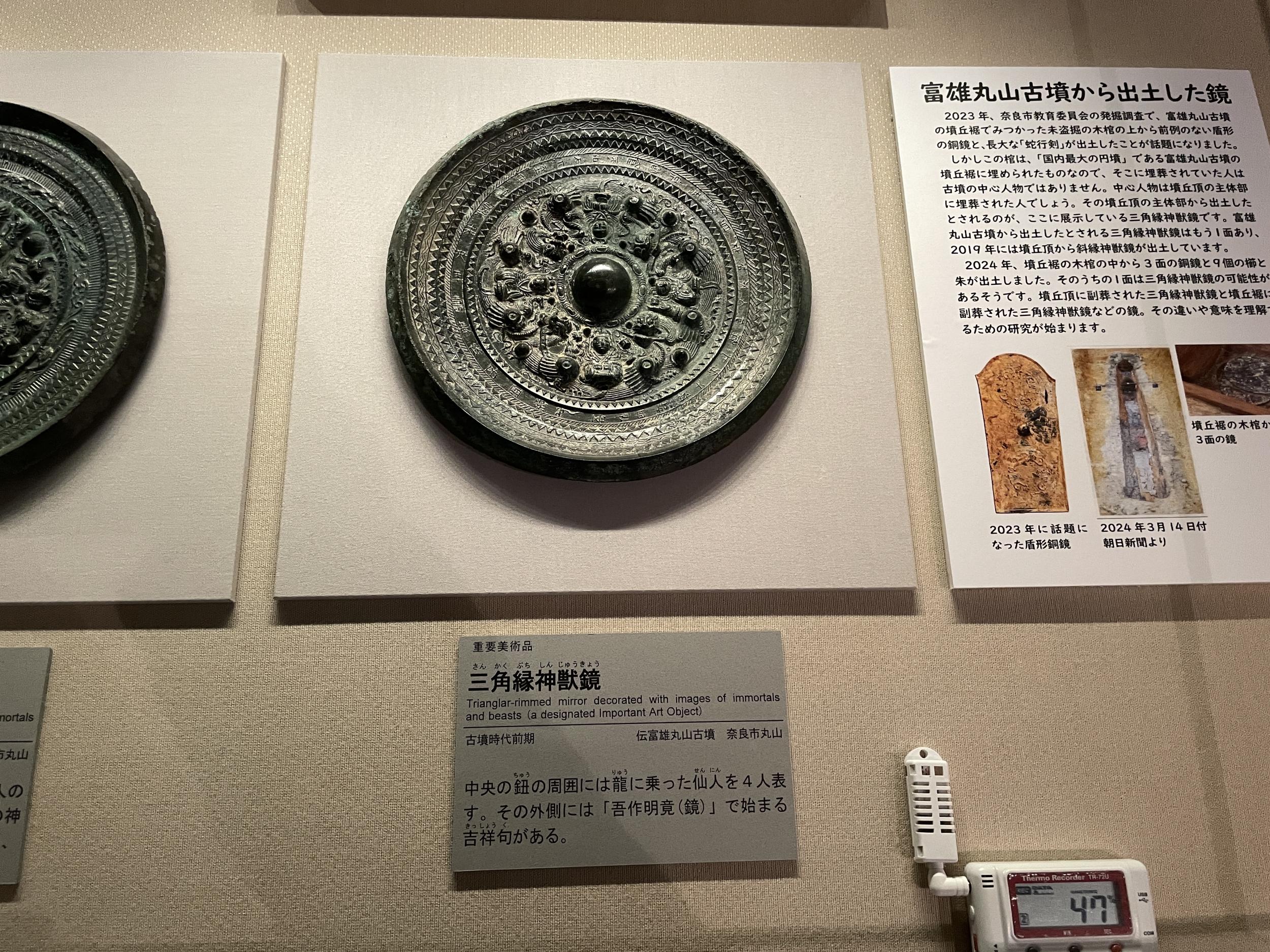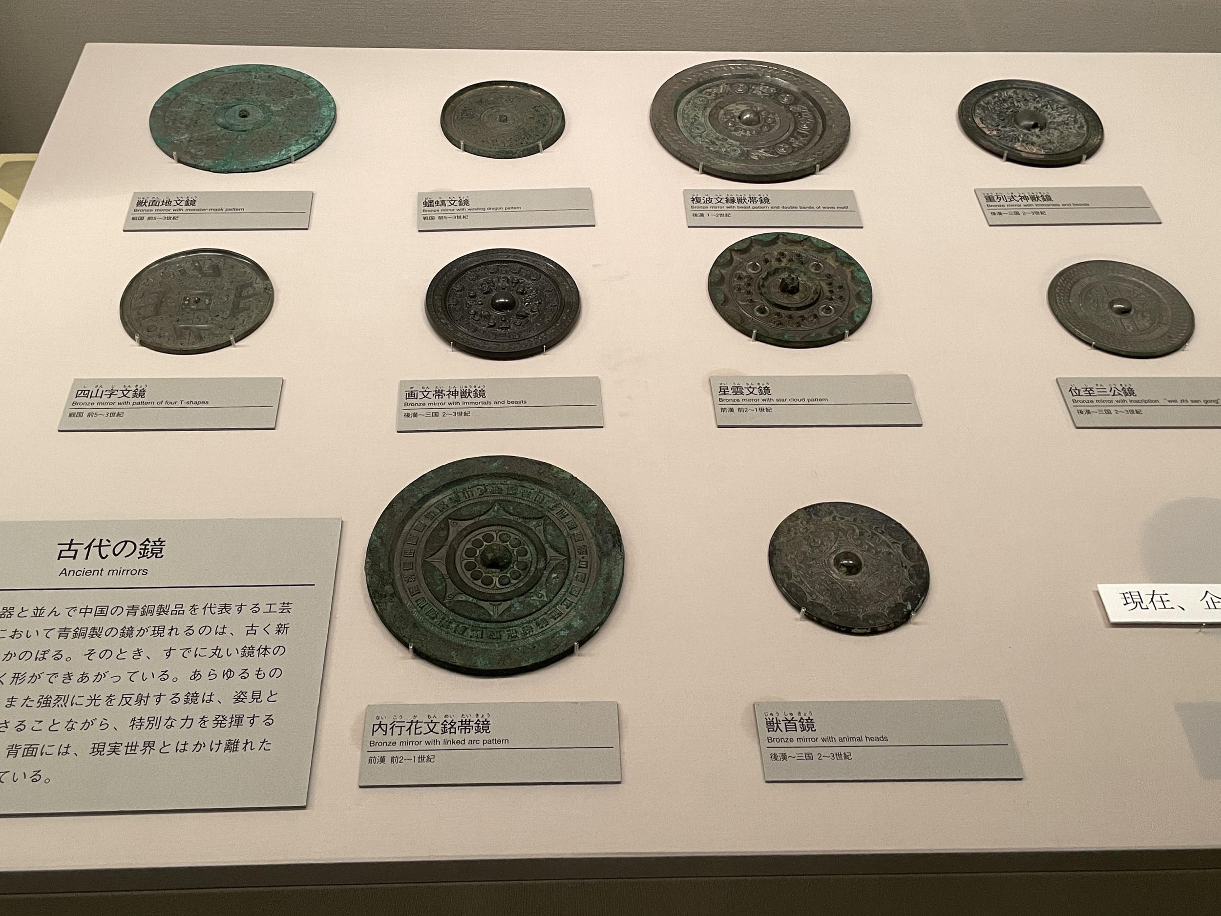 前漢後漢の銅鏡が並べられています。黒塚古墳に1枚だけ大切に埋葬されていた画文帯神獣鏡も。逆に黒塚古墳から33枚も出土した三角縁神獣鏡はここに含まれていないことがミソです。