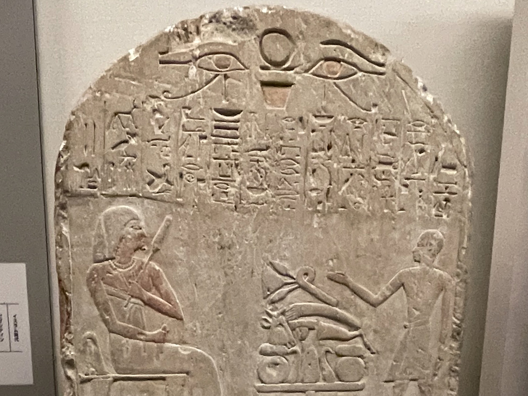 展示品は多くないもののエジプトのコーナーも。第18王朝(前1550~前1295年頃)のファラオ、トトメス4世(たぶん)の供養碑。その象形文字を拡大してみました。