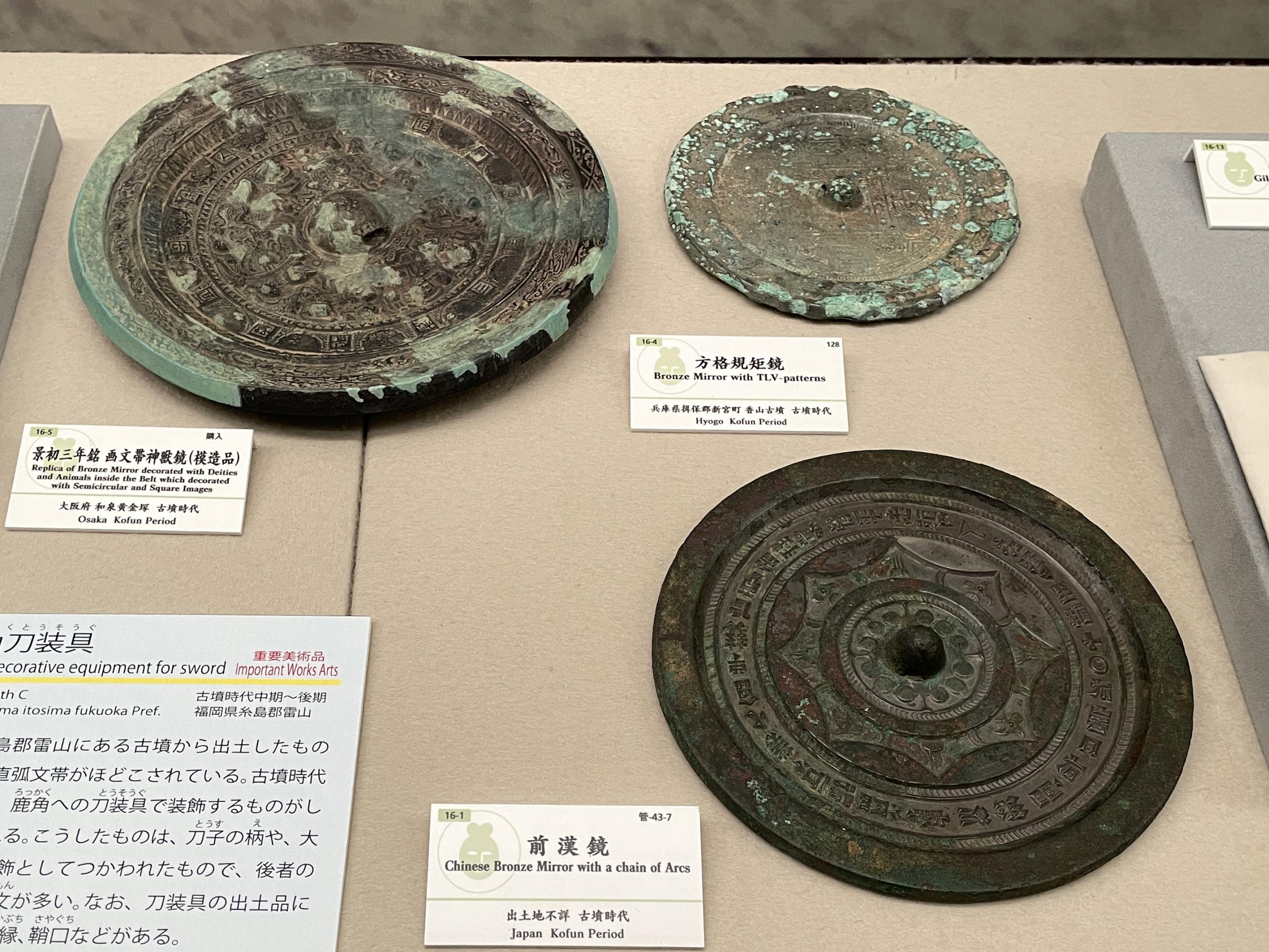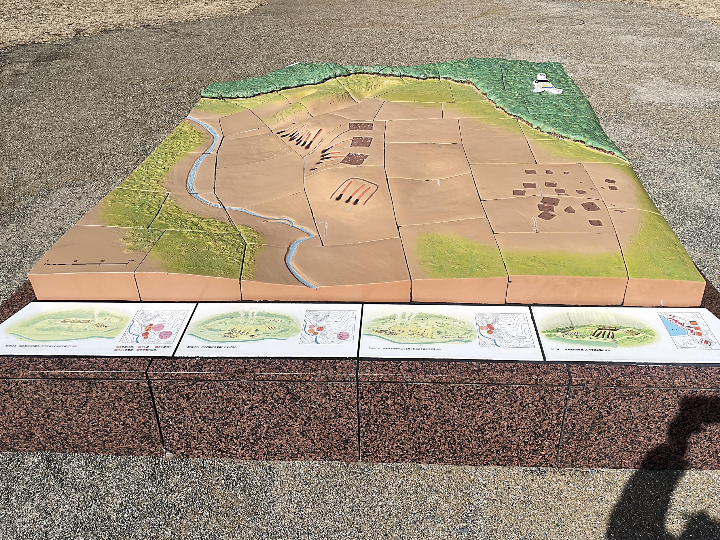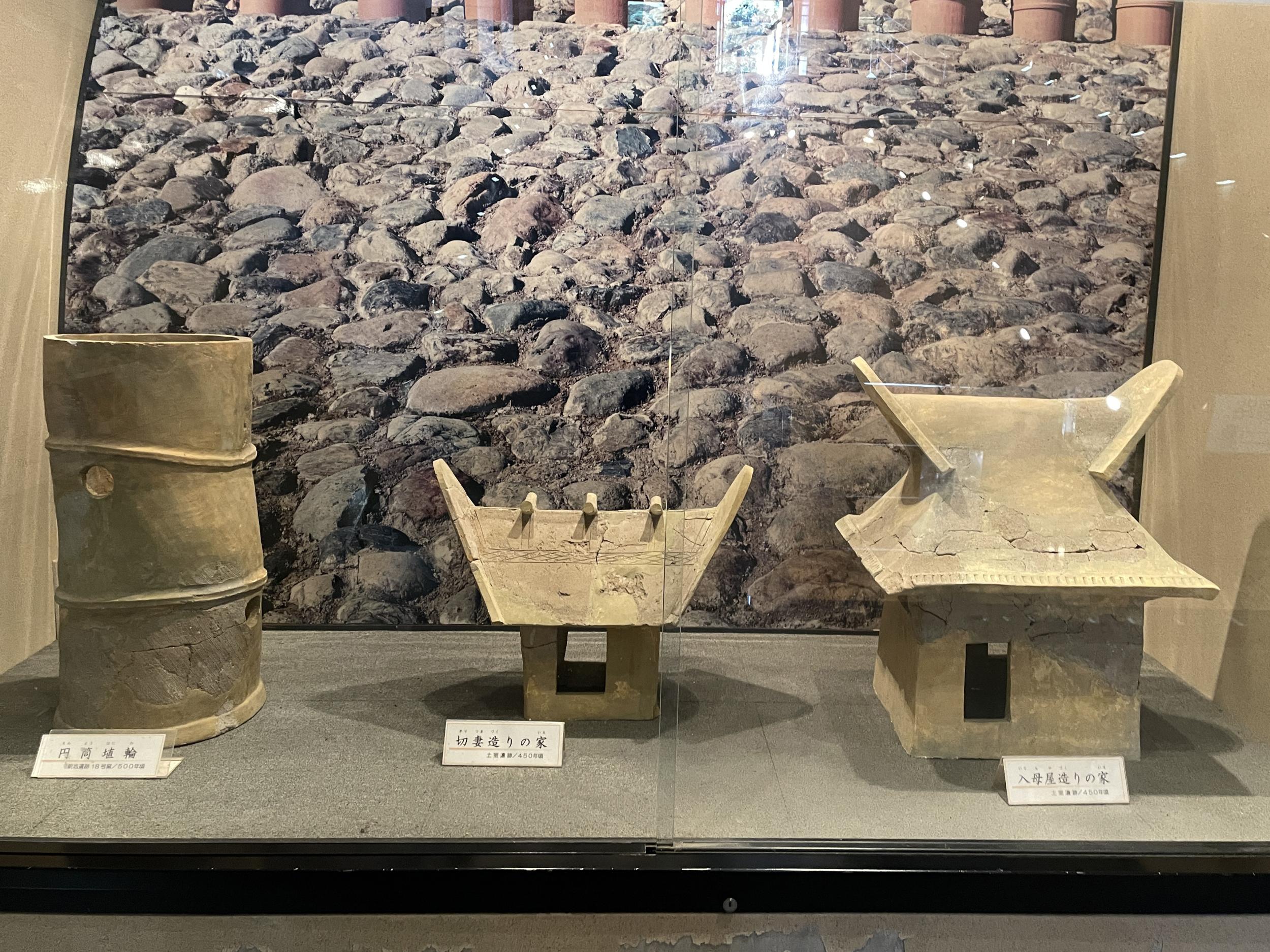 武人、家形、蓋形ハニワのレプリカ、一群のレプリカごとに陶板に描かれたマンガの開設。