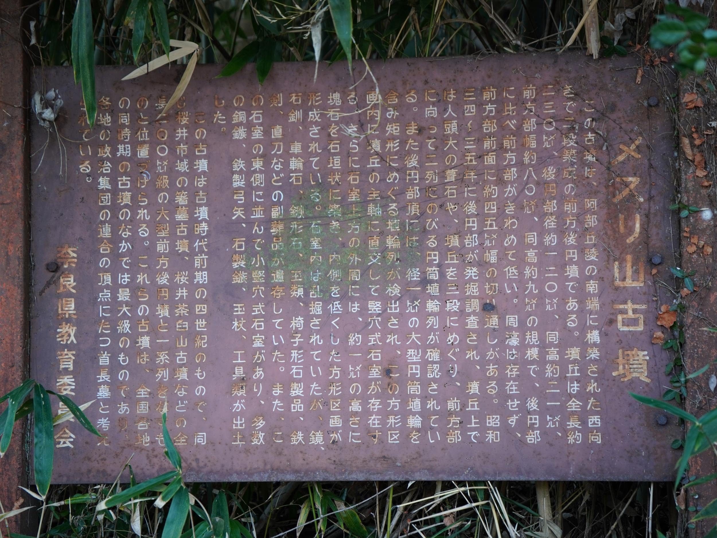 錆色の説明板には桜井茶臼山古墳同様に玉杖も出土とあります。初期ヤマト王権の大王墓と見られる大型前方後円墳はいずれも3世紀後半頃、箸墓→西殿塚→桜井茶臼山→メスリ山の順の築かれたようです。
