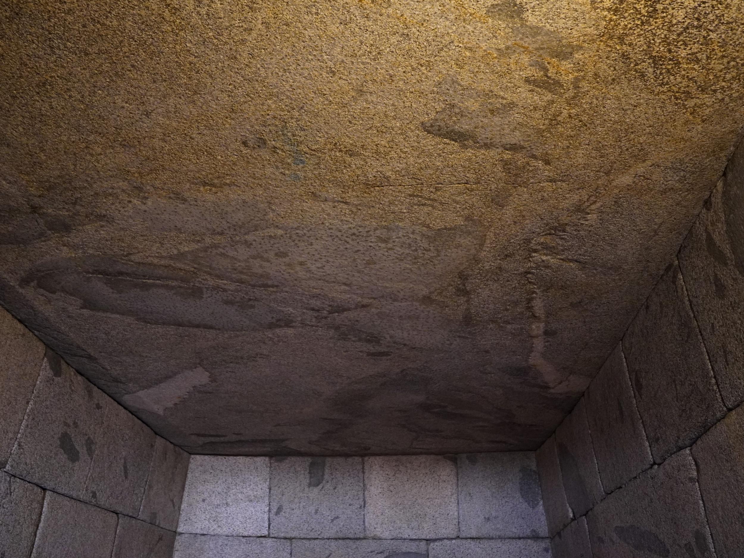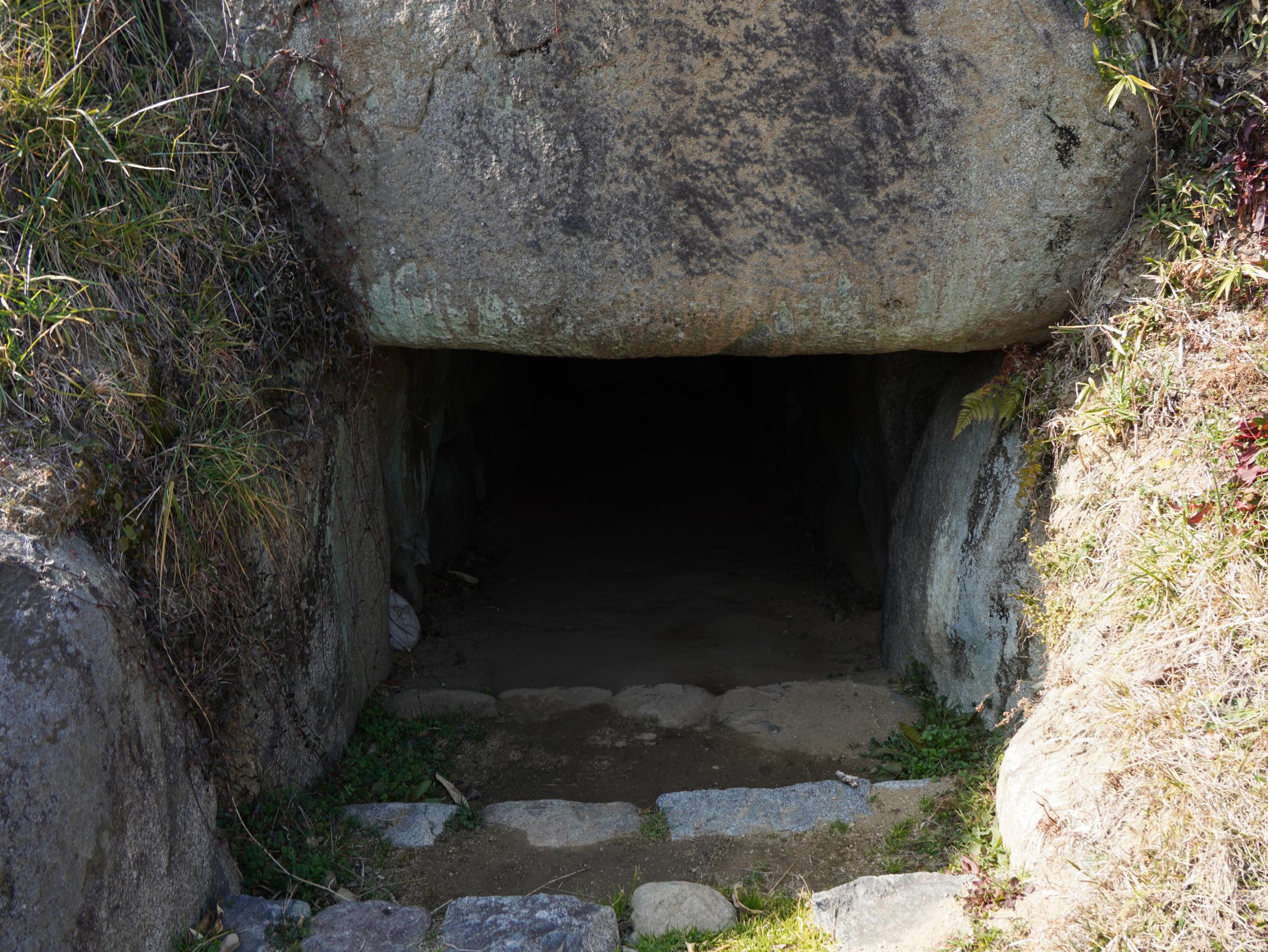 円筒埴輪に囲まれていた石室の8石の天井石は後円部墳丘に登ると確認できるらしい。さっき前方部から後円部へは進めなかったものの、後円部東側から藪漕ぎすれば登れそうな道があるようです。
