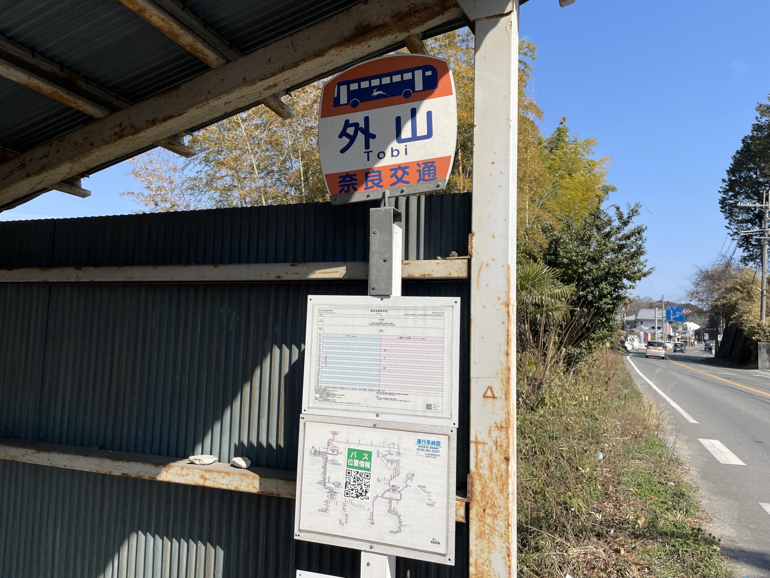 前方部から国道165号を東へ100mほどのところに外山バス停、Tobiとローマ字表記されていて、1日3〜4本大宇陀行が運行されているものの次は16:39の最終です。桜井茶臼山は外山茶臼山とも呼ばれていて、磐余同様に曰く有りげな地名です。能や猿楽に関連するとまでは分かったものの古代史との関連はよく分かりませんでした。