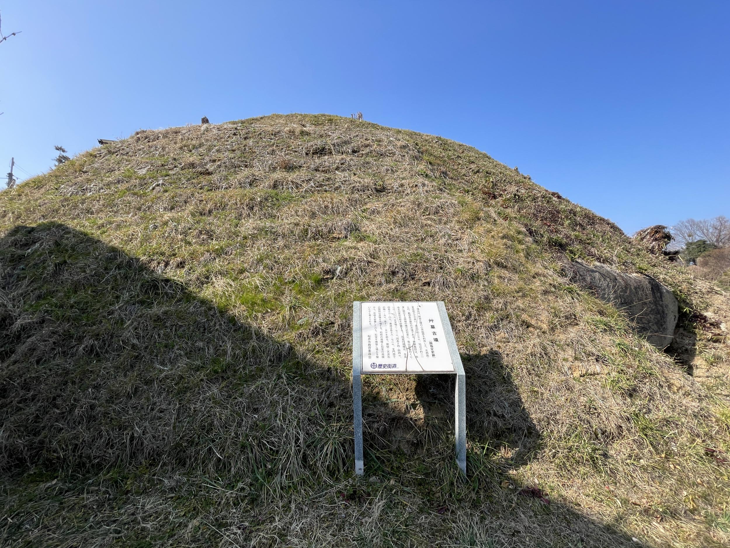 前方部に出ると奈良県教育委員会の説明板、後円部の説明板より詳しく、王様の象徴のような玉杖も出土しているとのこと。検索すると王杖は橿考研じゃなくて国立歴史民俗博物館蔵らしい、万博公園のみんぱくかと思いきや千葉県佐倉市です。橿考研ではここから出土の木棺が付属博物館中庭に面したところに展示されていたのを見た記憶があるものの写真を撮っていませんでした。