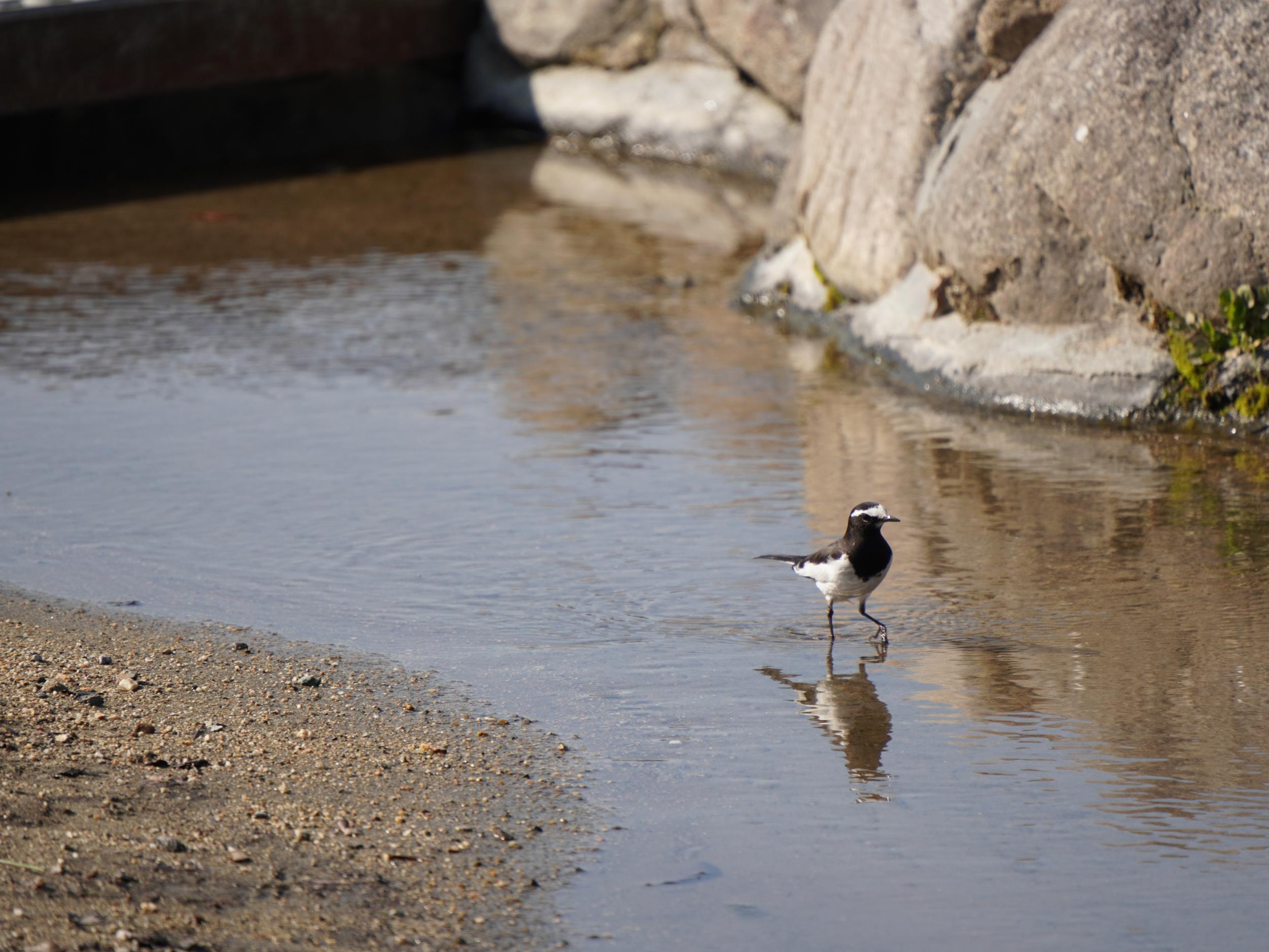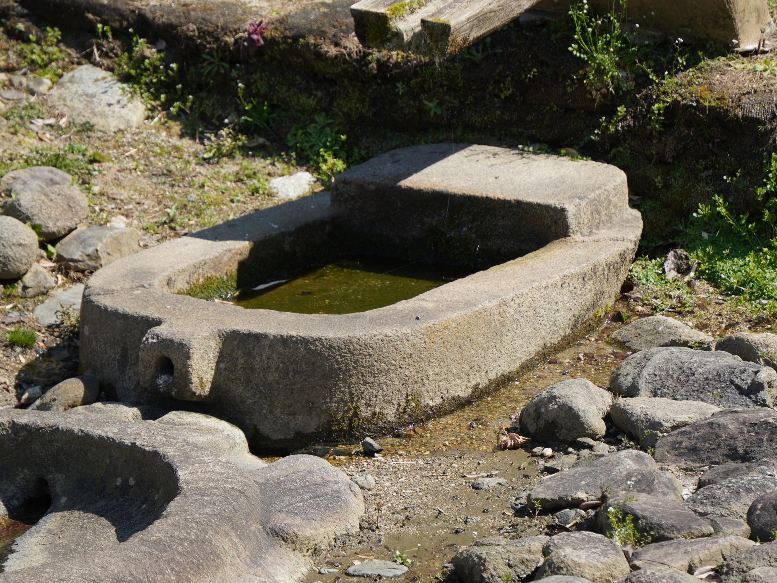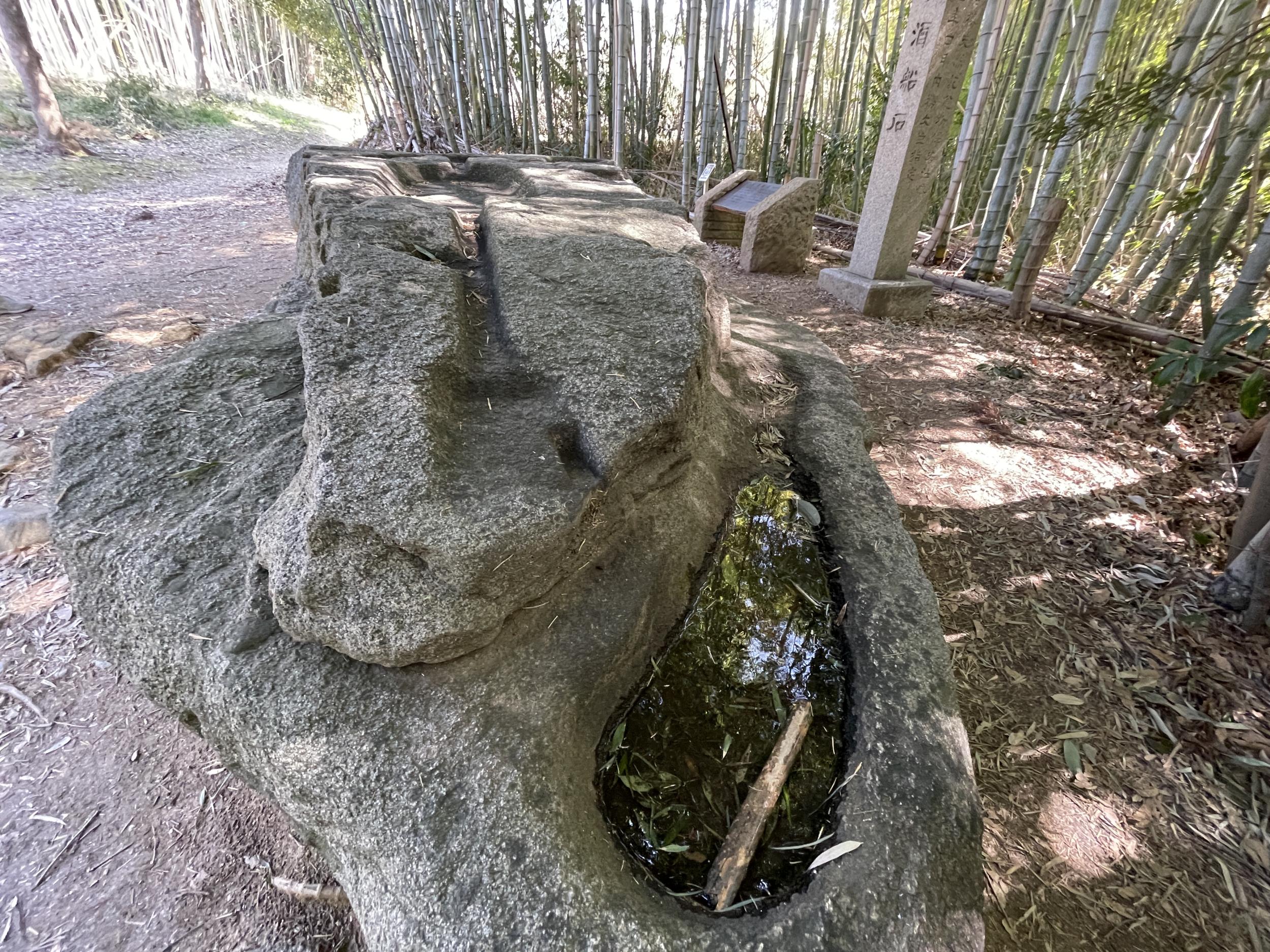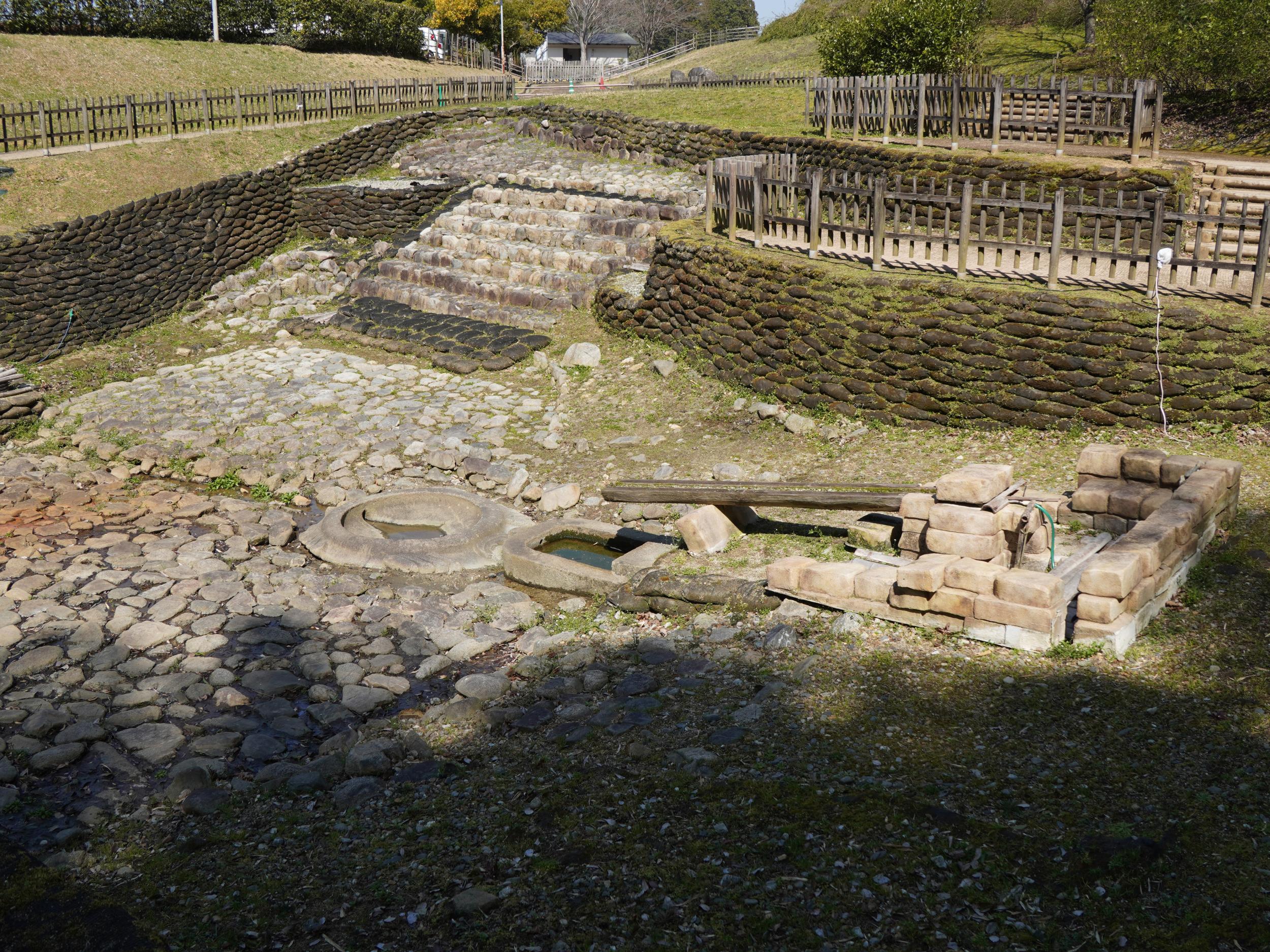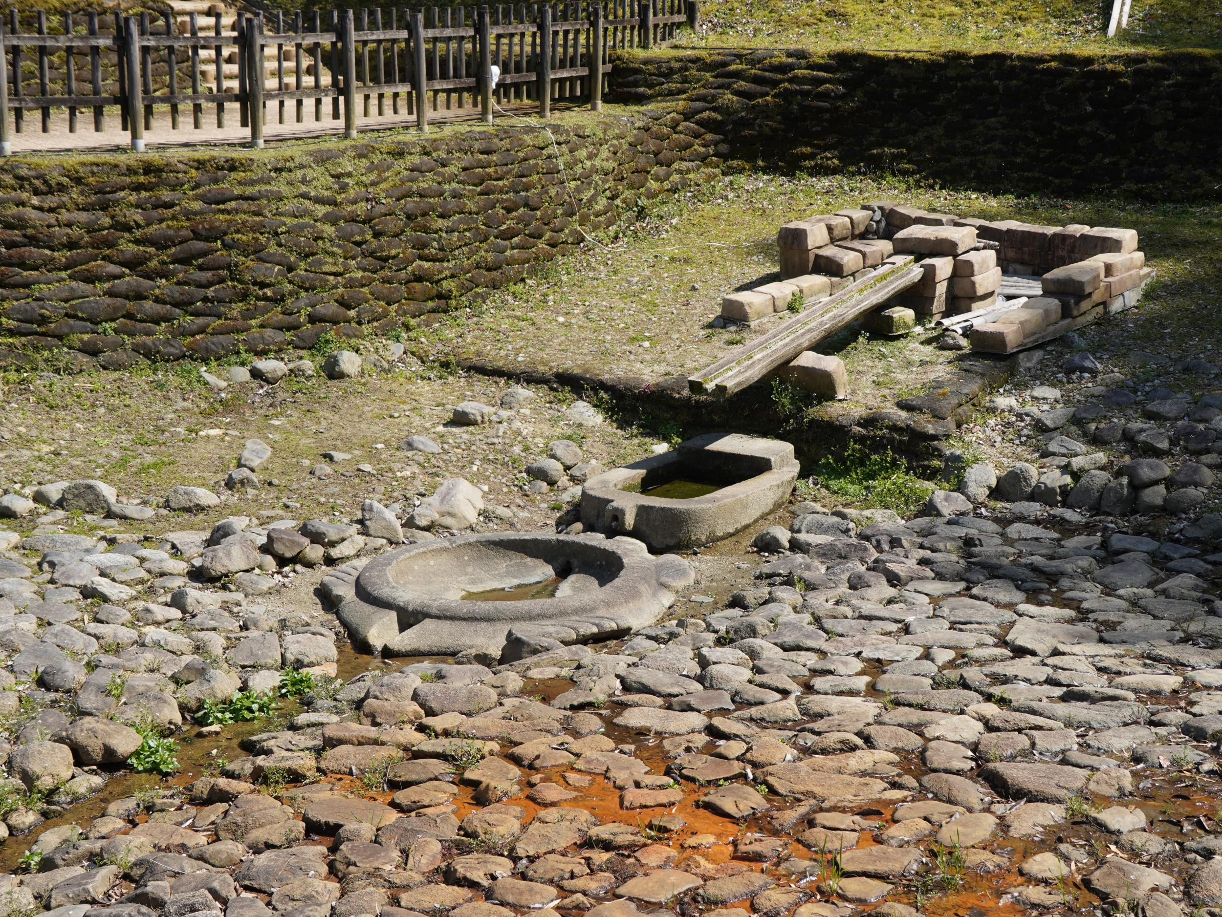 筧に水は流れていないものの、小判型と亀形石造物には水が溜まっていて、石造物の周囲には水がチョロチョロ流れています。近くにいたボランティガイドさんに訊ね、水道水じゃなくて湧水であることを確認。
