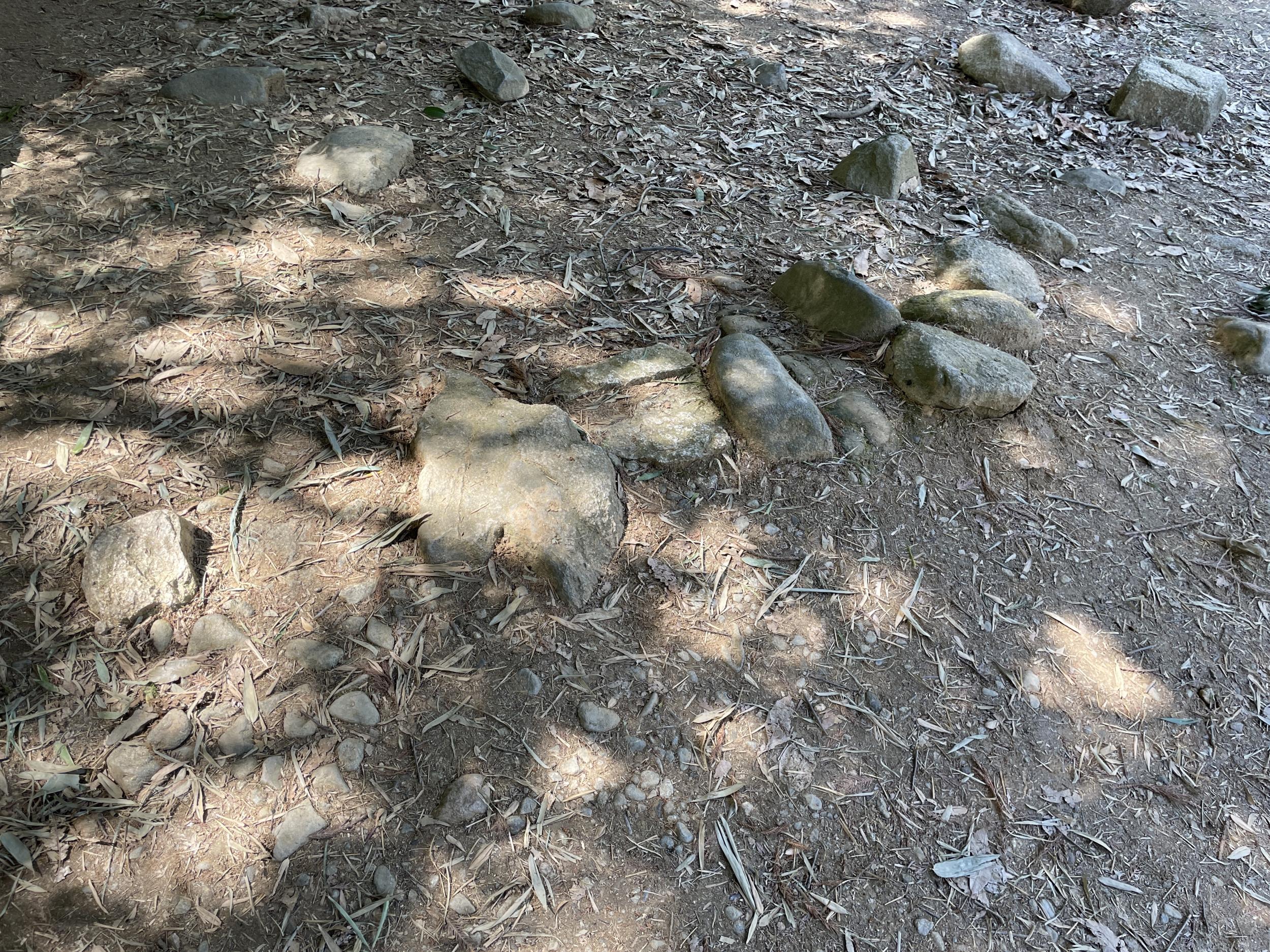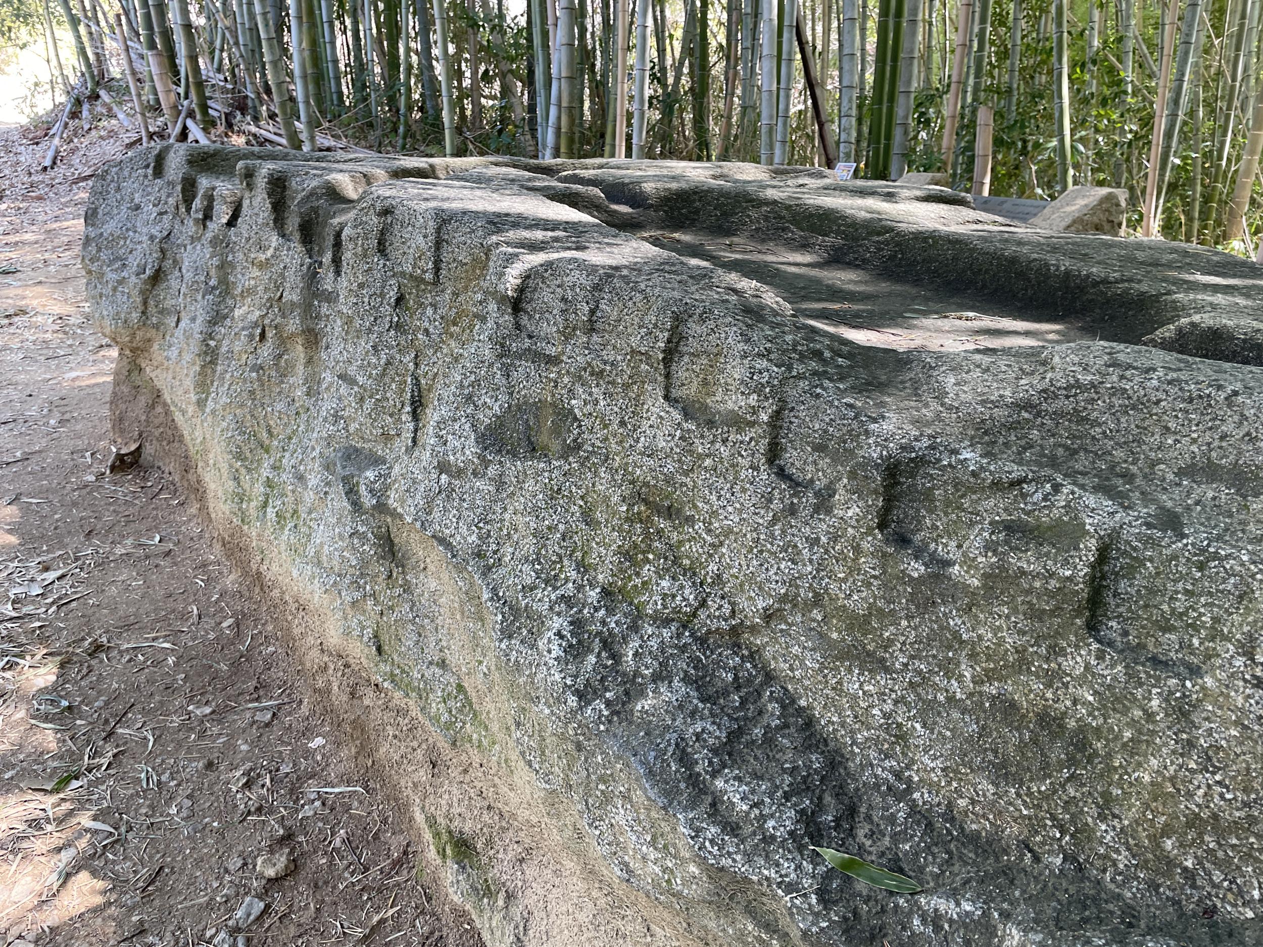 酒船石北側地面に石の列、若一調査隊によると、この石の列は斉明天皇の時代に作られた運河で天理から運ばれてきた砂岩で、さっき建屋で見た石垣もその一部らしく、酒船石の置かれた丘全体が人工物と分かったそうです。