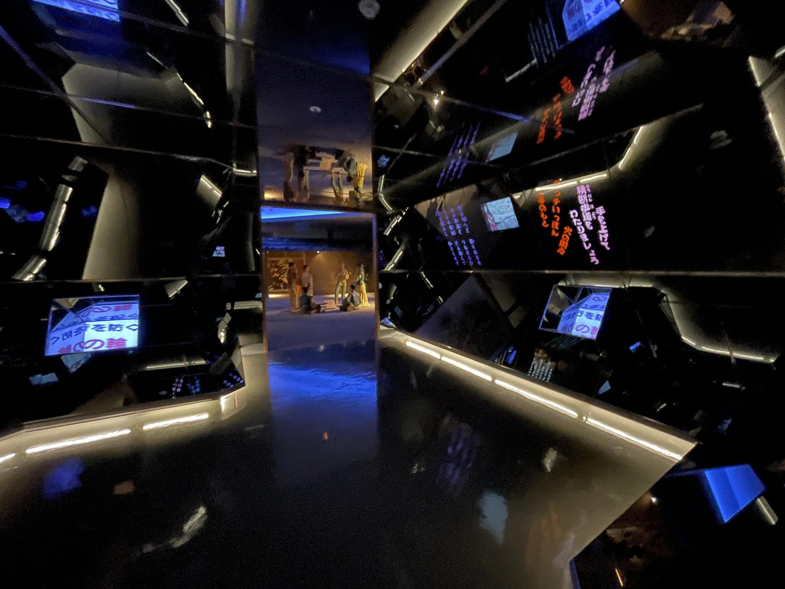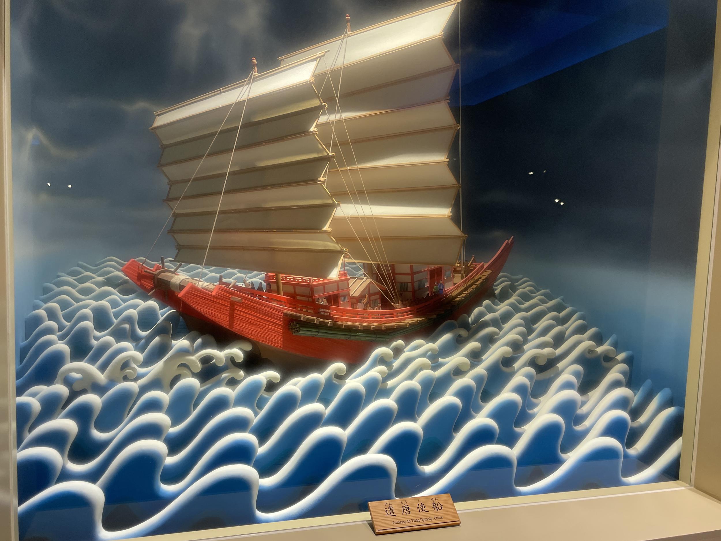 網代帆を開き荒波を越える遣唐使船のジオラマ、平城宮跡の復原遣唐使船と同じ形で、こうやって見ると150人は乗れそうです。