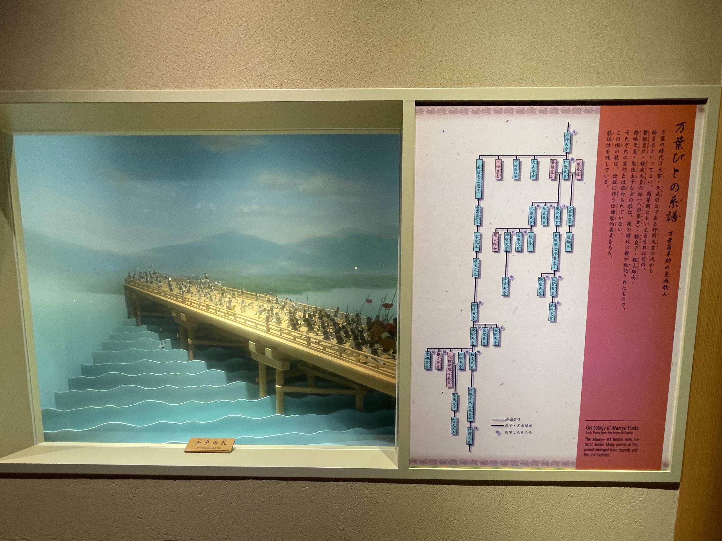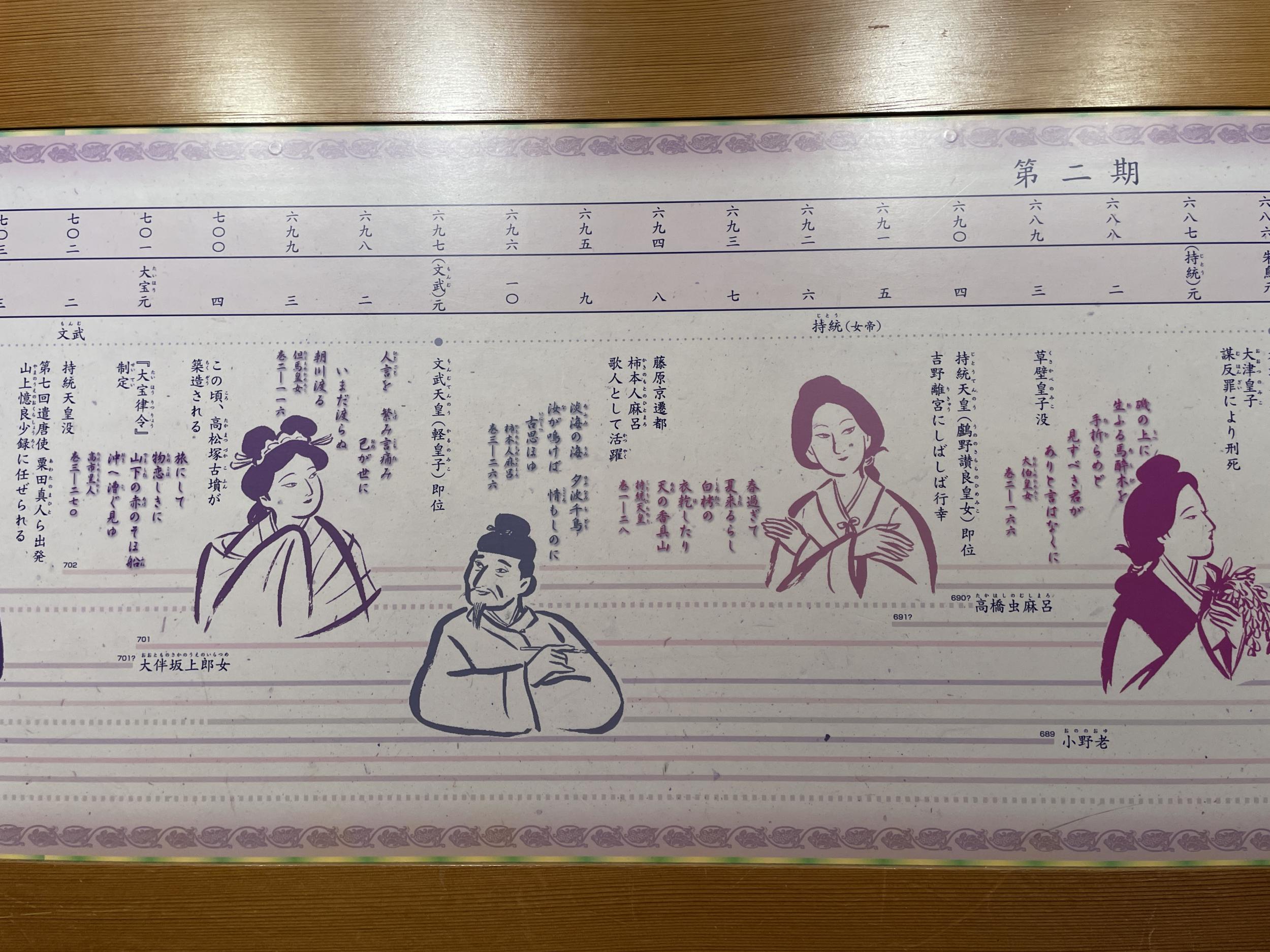 横に長い万葉集年表のパネル、大伯皇女(おおしのひめみこ)、持統天皇、柿本人麻呂、但馬皇女の部分です。