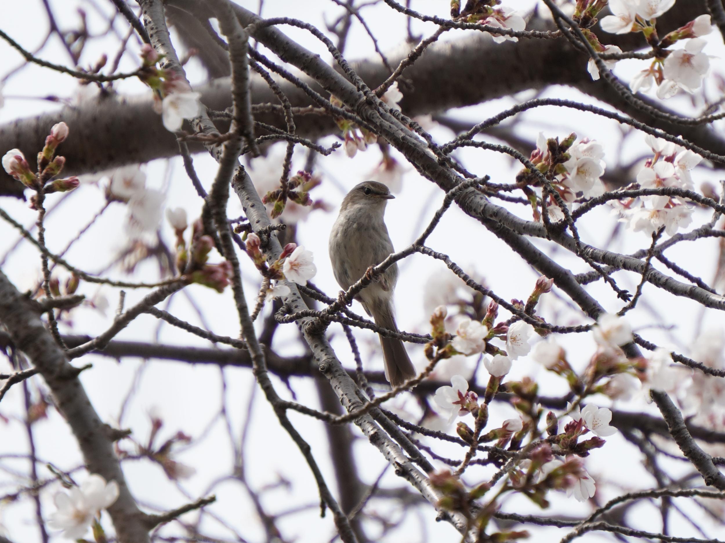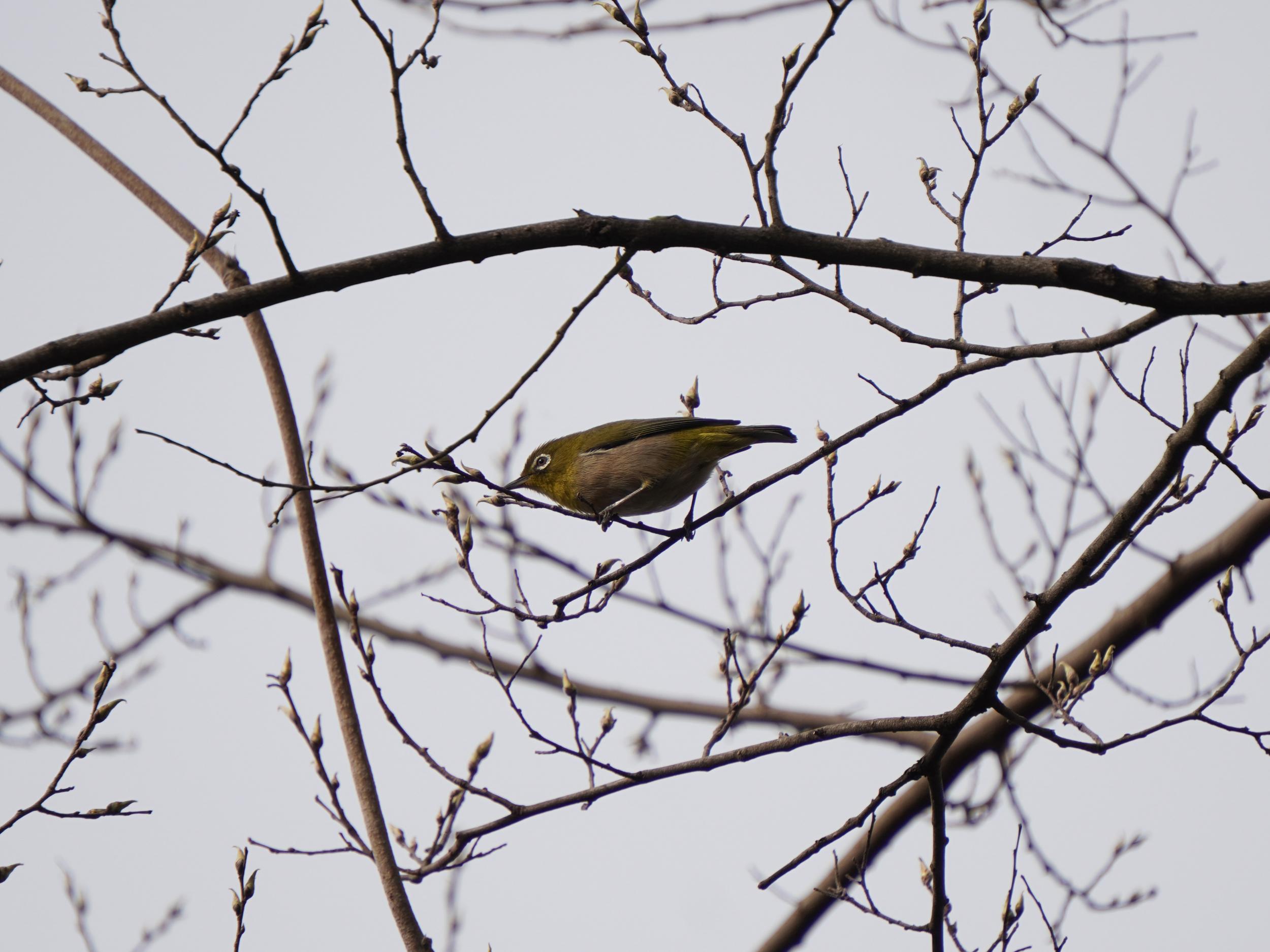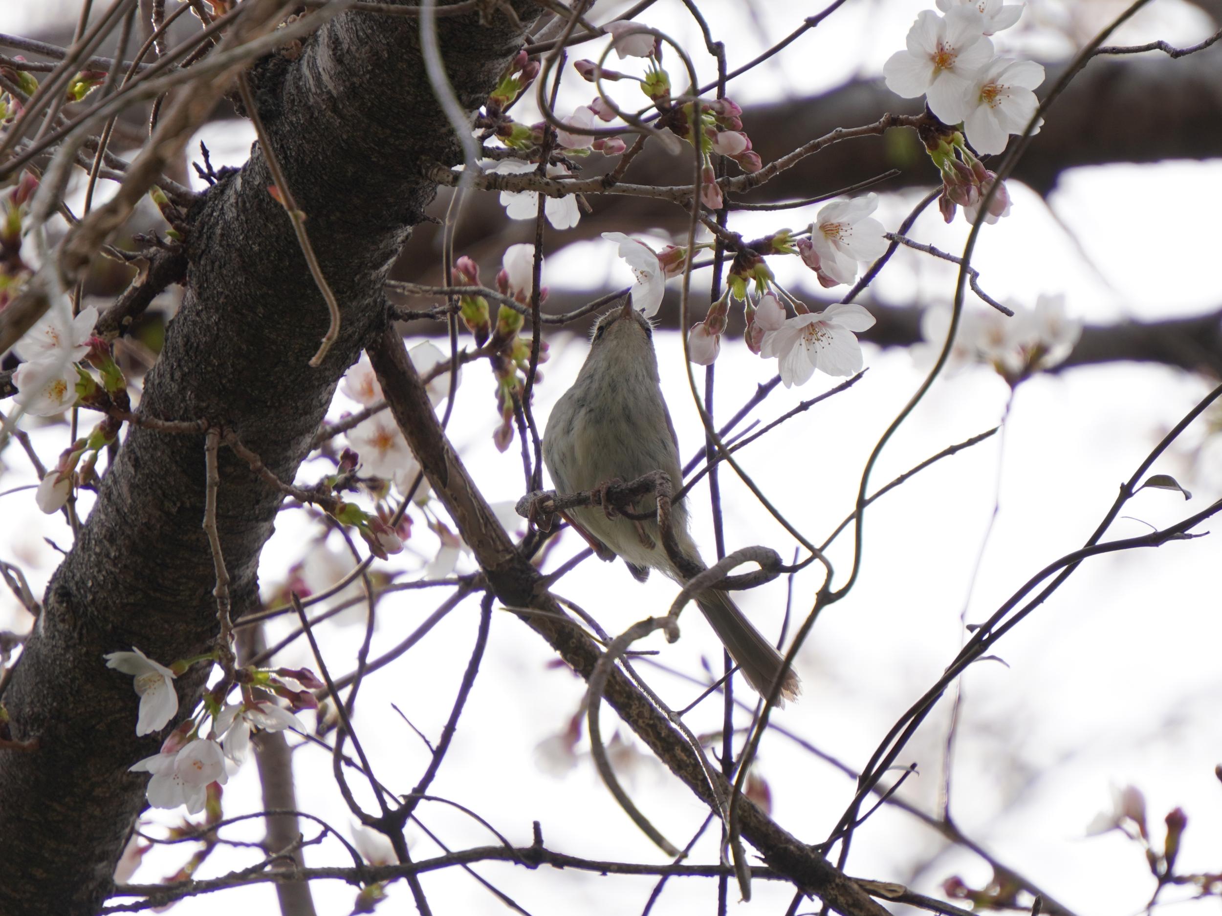 ホーホケキョと聞こえてきてがんばって探して撮れたのは、たぶん鳴いていたのとは別のウグイス。メジロのように花の蜜を吸っているようにも見えますが、虫を探しているんだと思います。いつもながら鳴き声から見つかるととても嬉しいウグイスです。