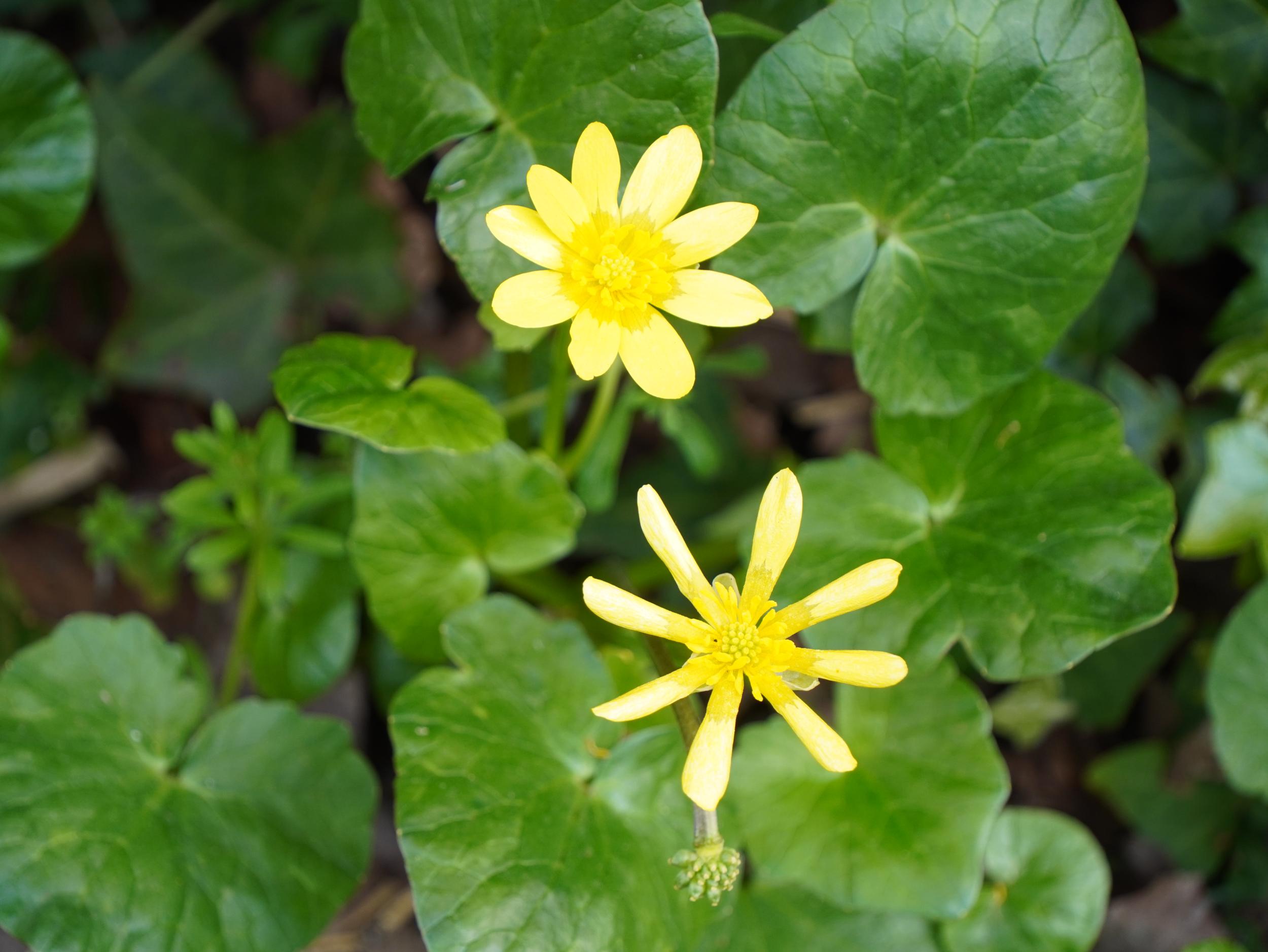 ムスカリとヒメリュウキンカ。丸いヒメリュウキンカと細長いヒメリュウキンカ。