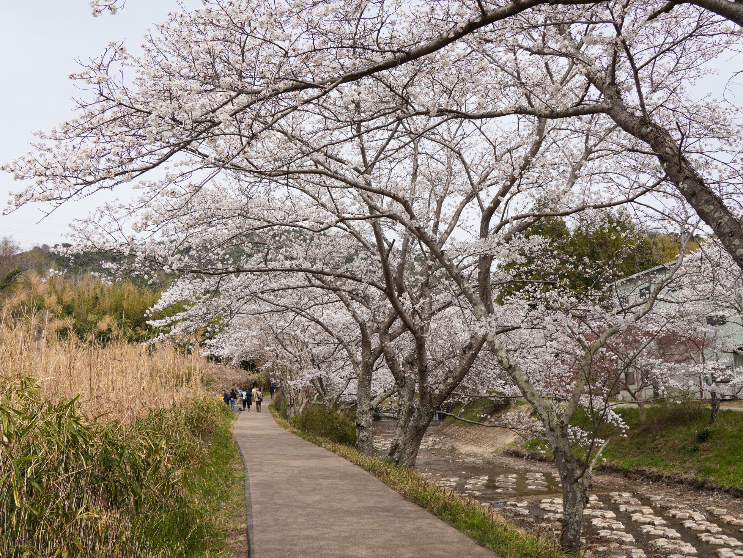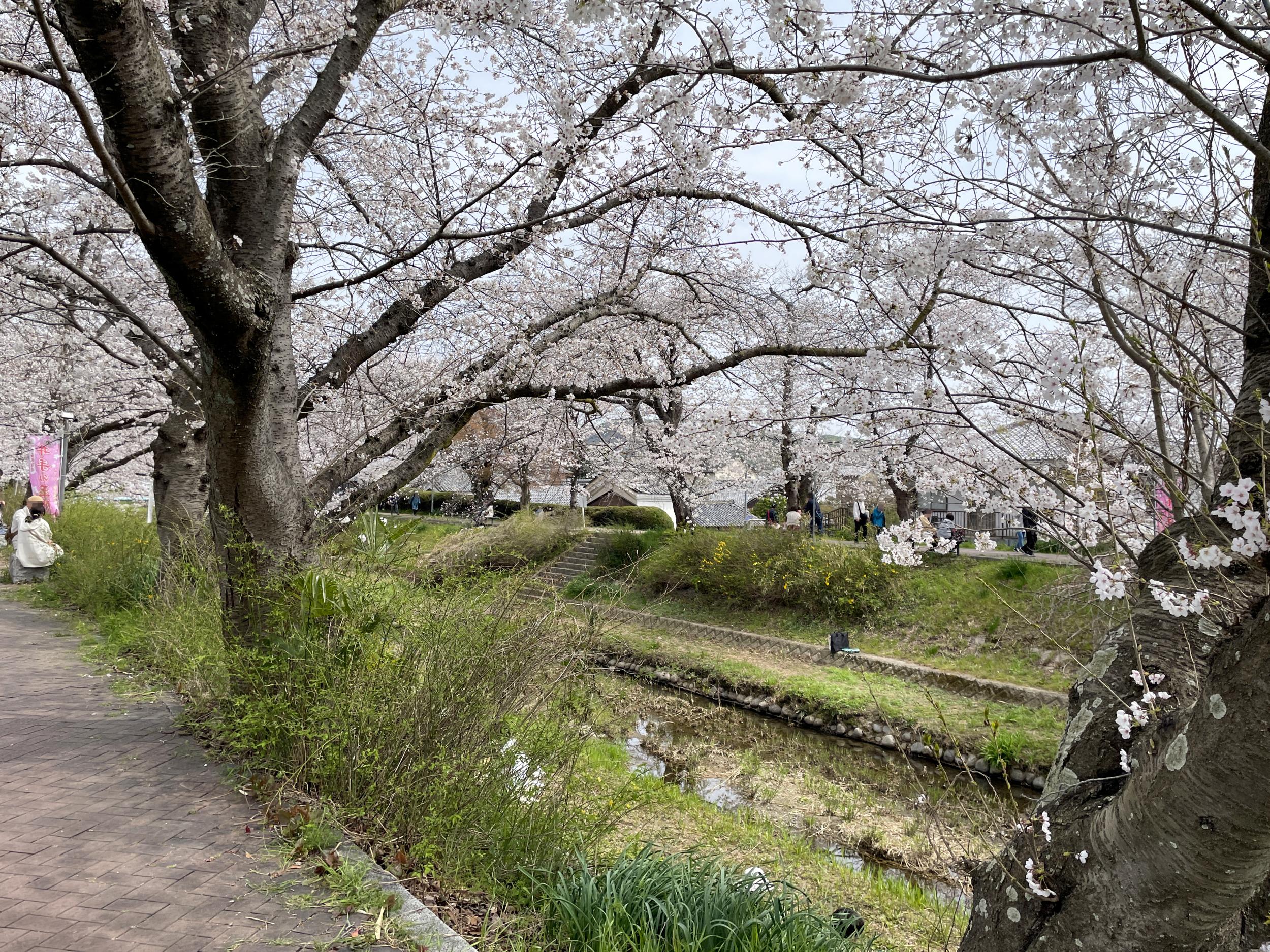 井手の玉水のソメイヨシノです。人が少ないところを撮っており、土手を散策する人たちや、河原でビニールシートを広げたファミリーで混雜というほどではないものの賑わっています。特筆すべきは外国人観光客が殆ど見当たらないこと。