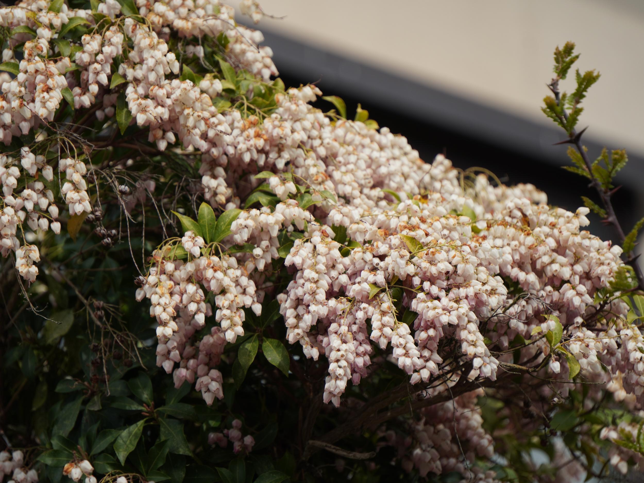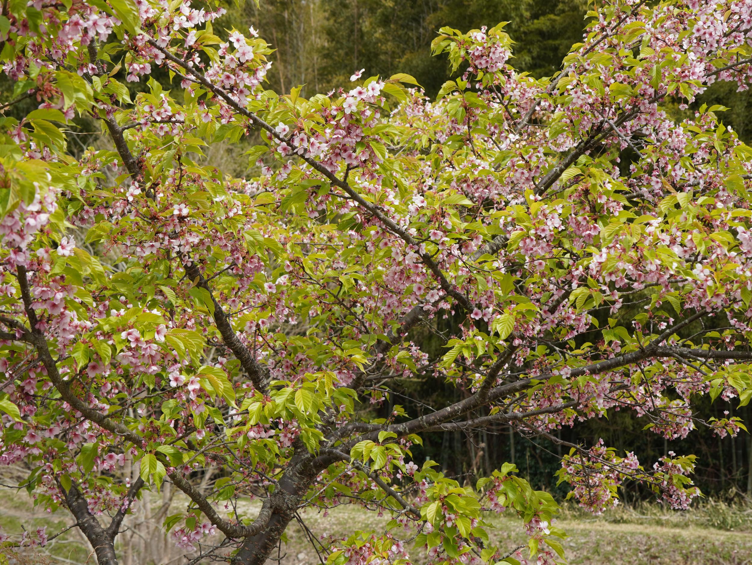 玉津岡神社裏参道を下りつつシダレザクラ、もう葉っぱが増えてきています。ツブツブの花はアセビ。
