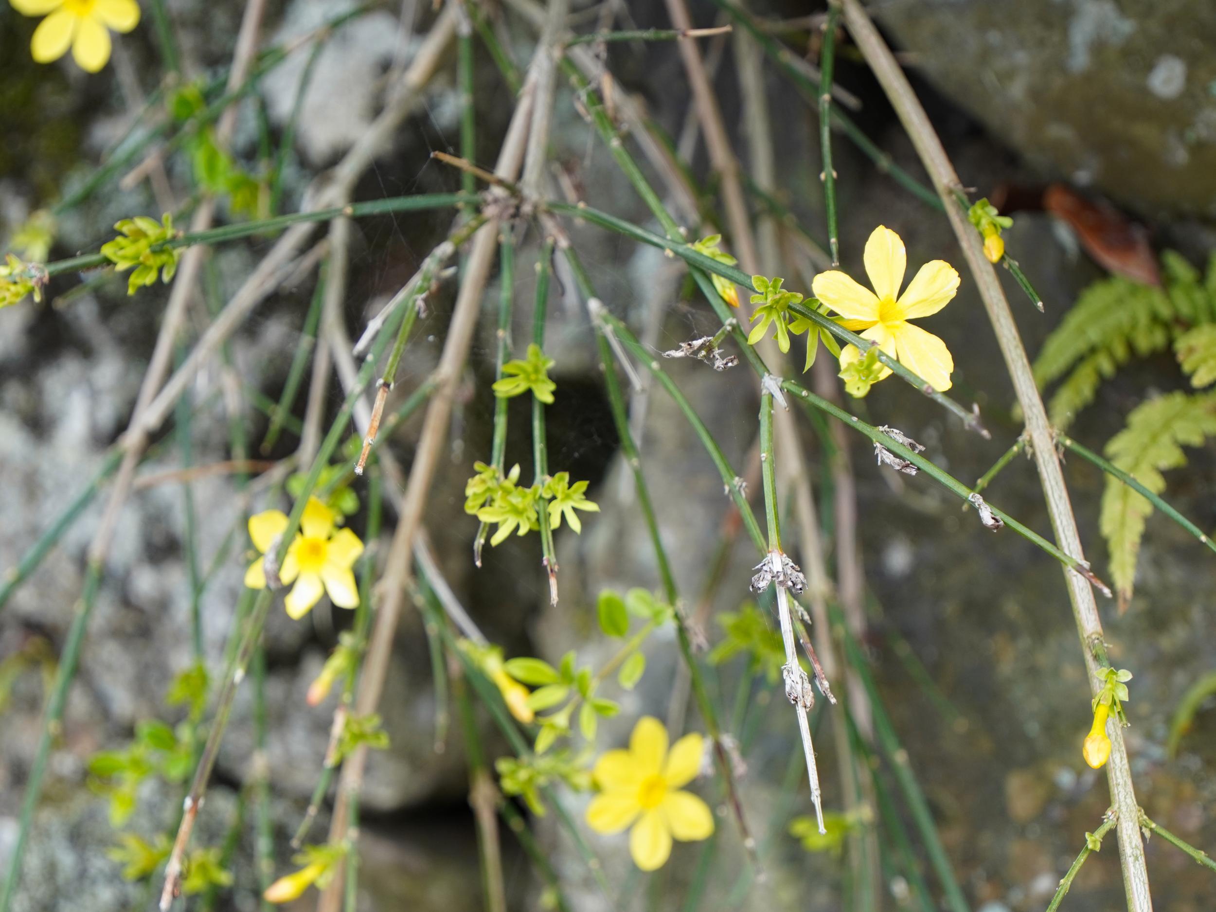 和菓子のような紫の花はアケビ。低木の黄色い花はオウバイ。