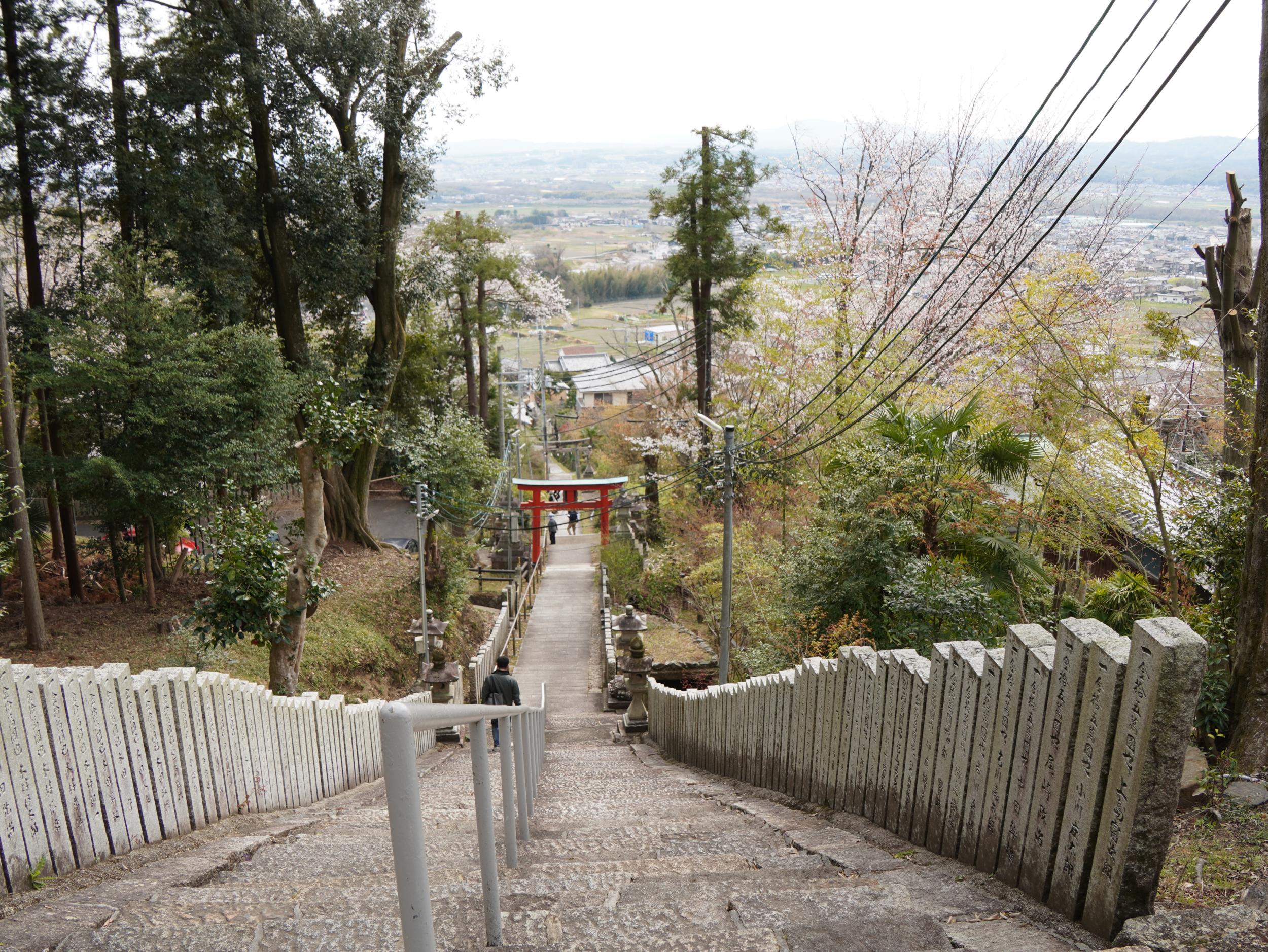 鳥居の手前で振り返ったところです。正面に生駒山、その手前の森はけいはんな学研都市辺り。