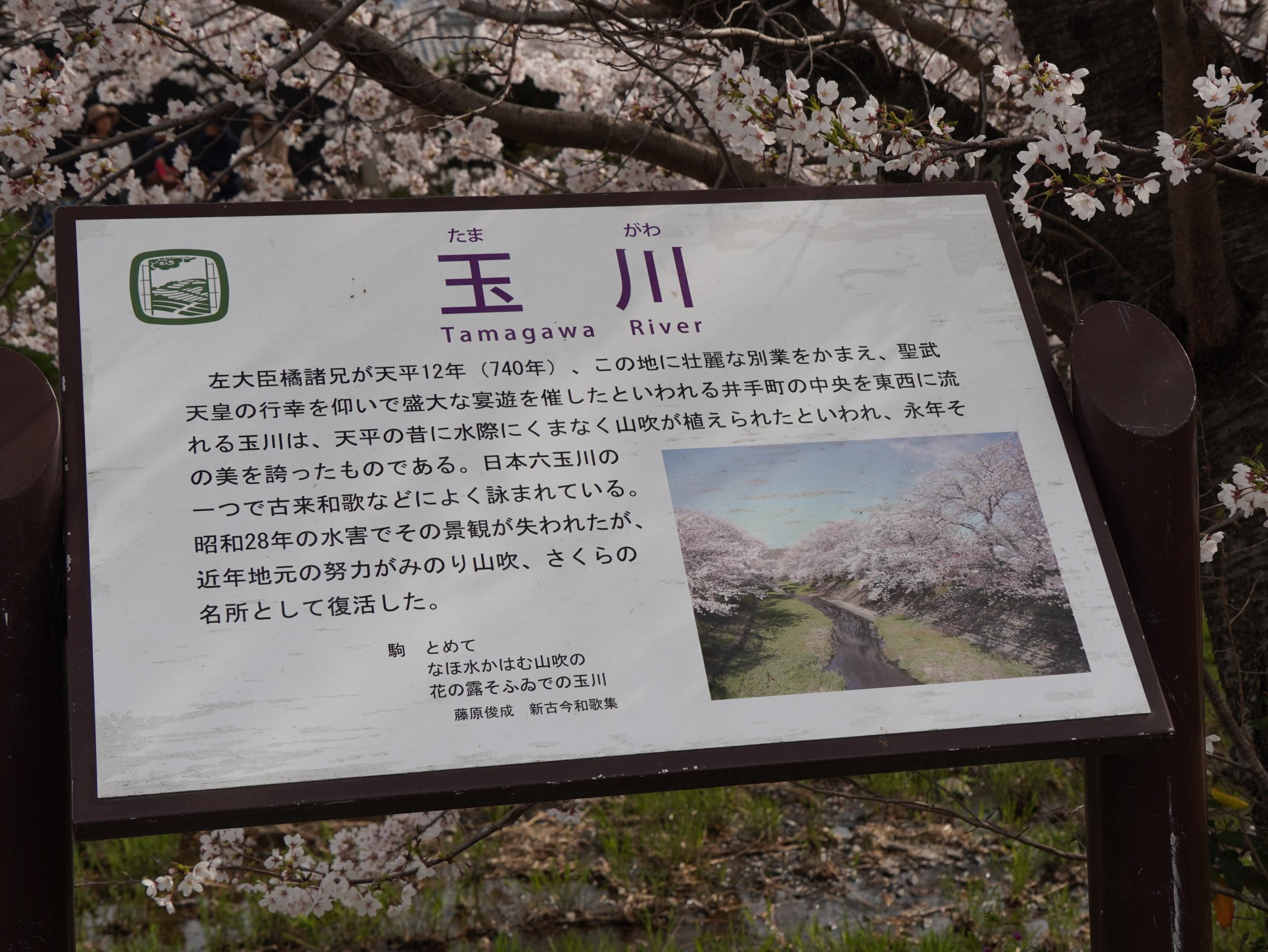 玉川の説明板によると聖武天皇の行幸で宴が催された玉川には天平の頃から水際にくまなく山吹が植えられていたらしい。南山城水害でその景観が失われたものの近年地元の努力で山吹、さくらの名所として復活したそうです。