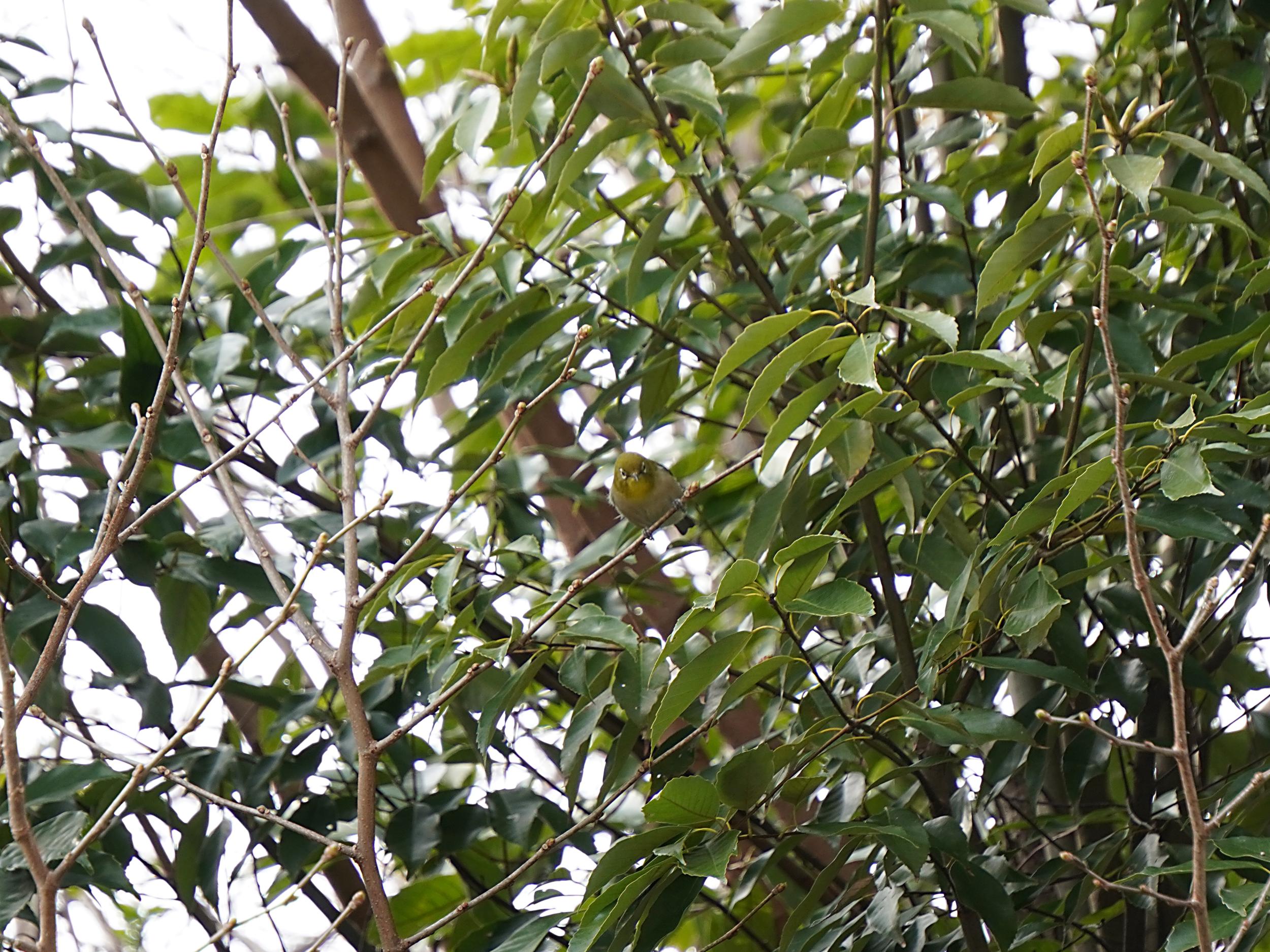 7年前にイカルをいっぱい見た駅近くのツバキの生垣をチェックするとイカルは不在もメジロ。