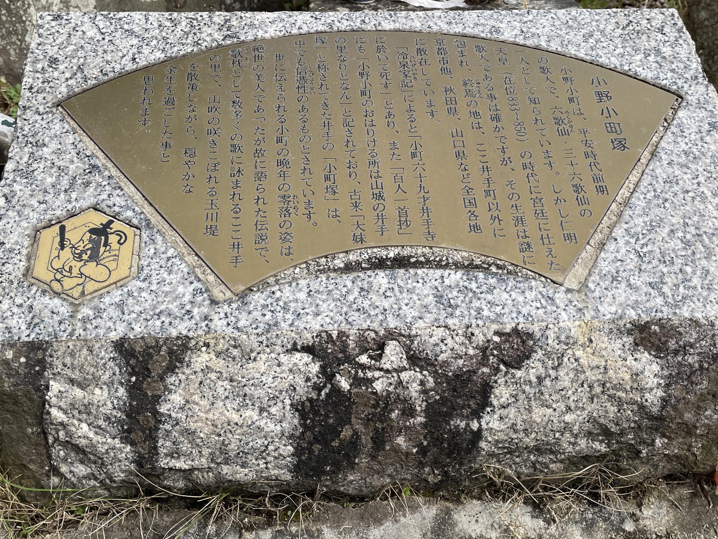 扇形の説明板で小町晩年の姿が語られています。山科の随心院奥書院襖絵に描かれた庭掃除をしている晩年の小野小町の姿は写真NGだったものの記憶に残っています。説明板のキャラクターのモデルはたぶん橘諸兄。