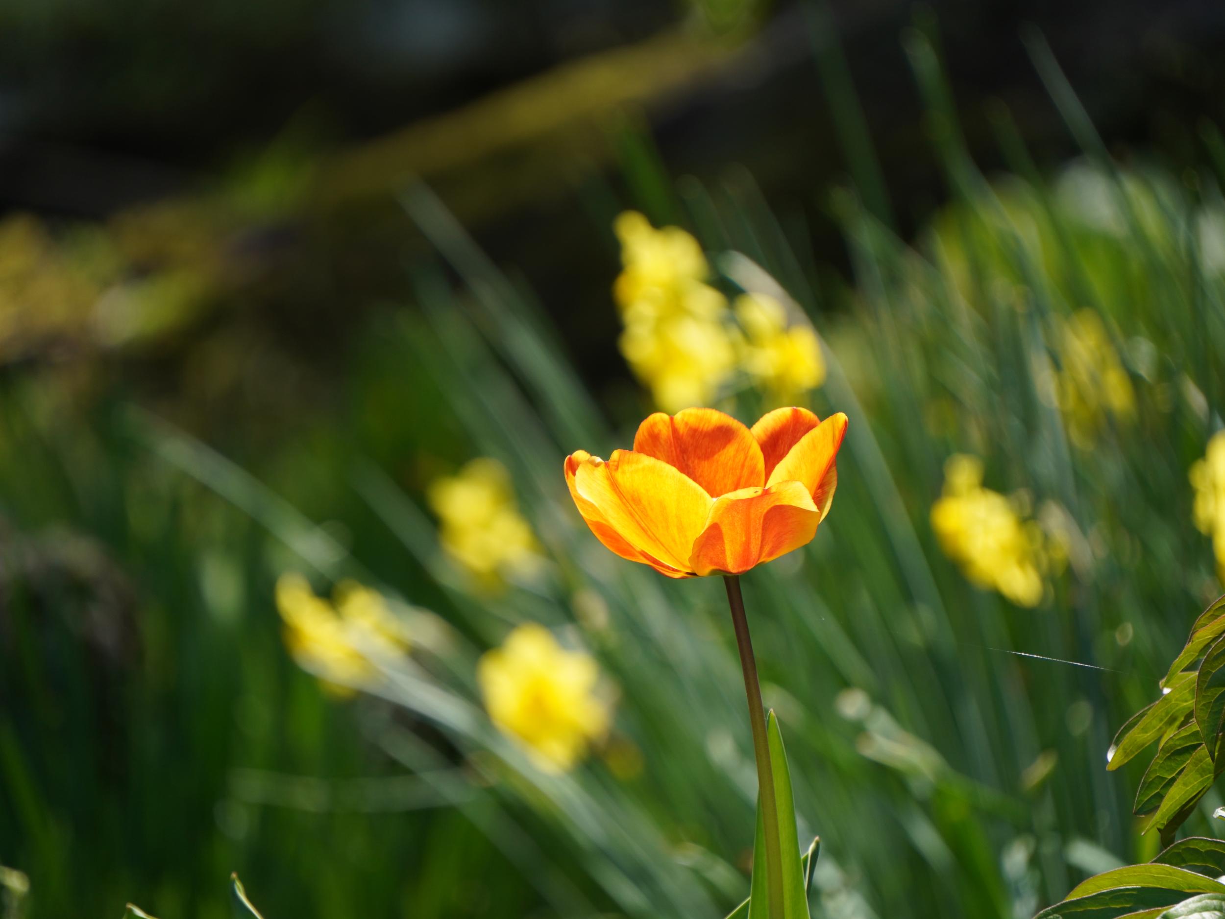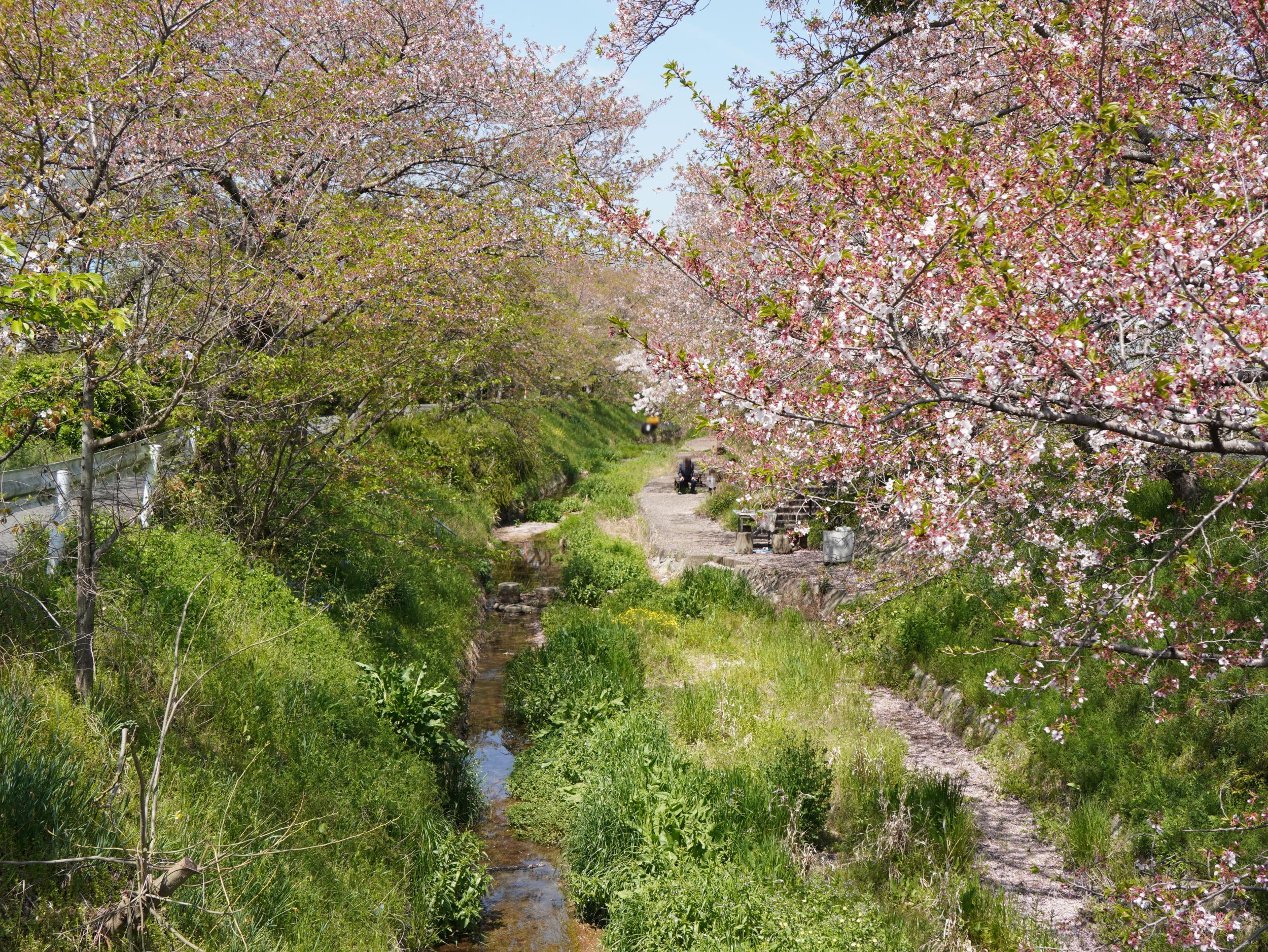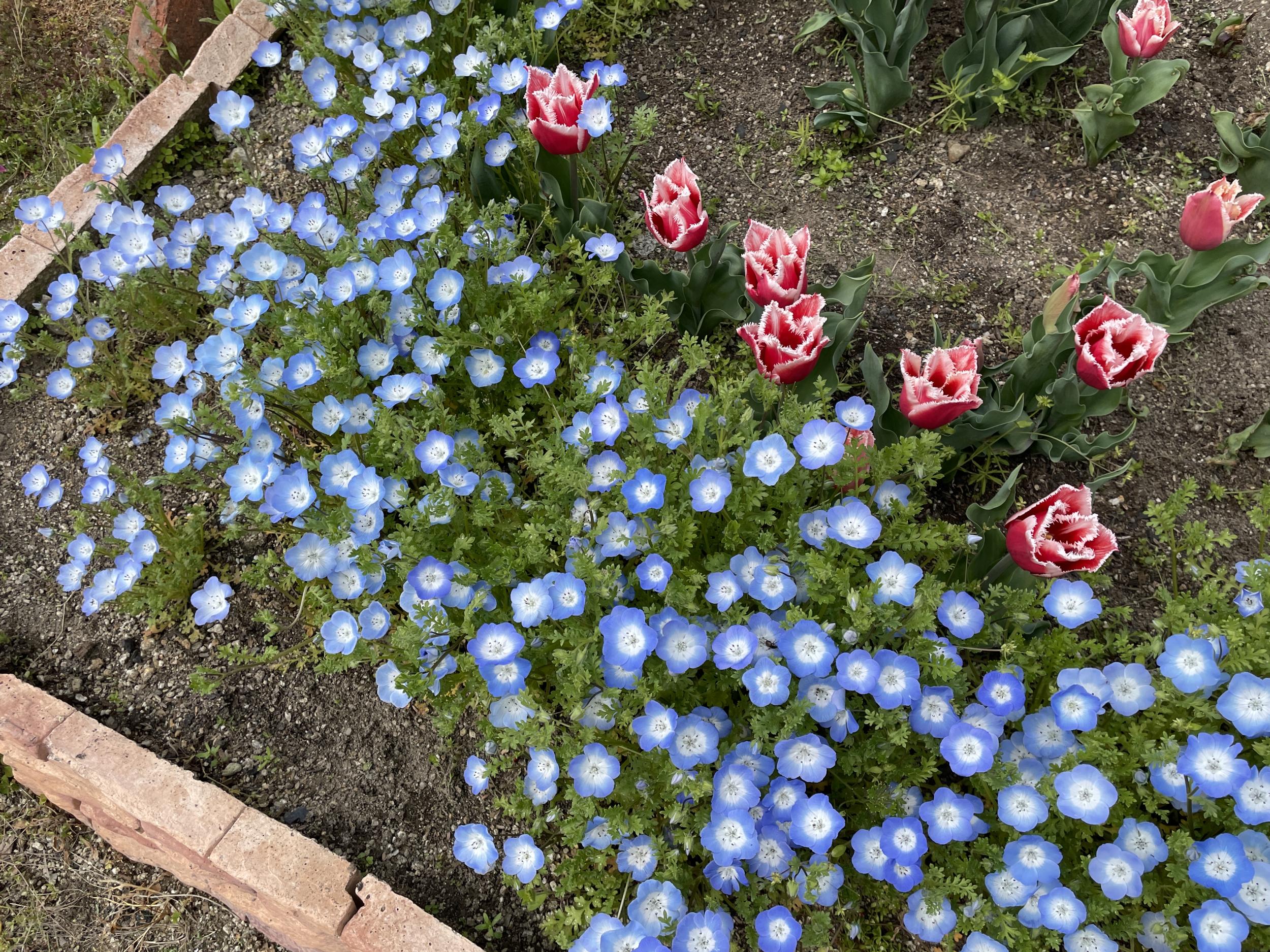 和菓子屋さんに自転車を返却して近鉄御所駅に戻ると電車が行ったばかりで30分待ち、駅前のWelcome Gardenにネモフィラとチューリップ。
