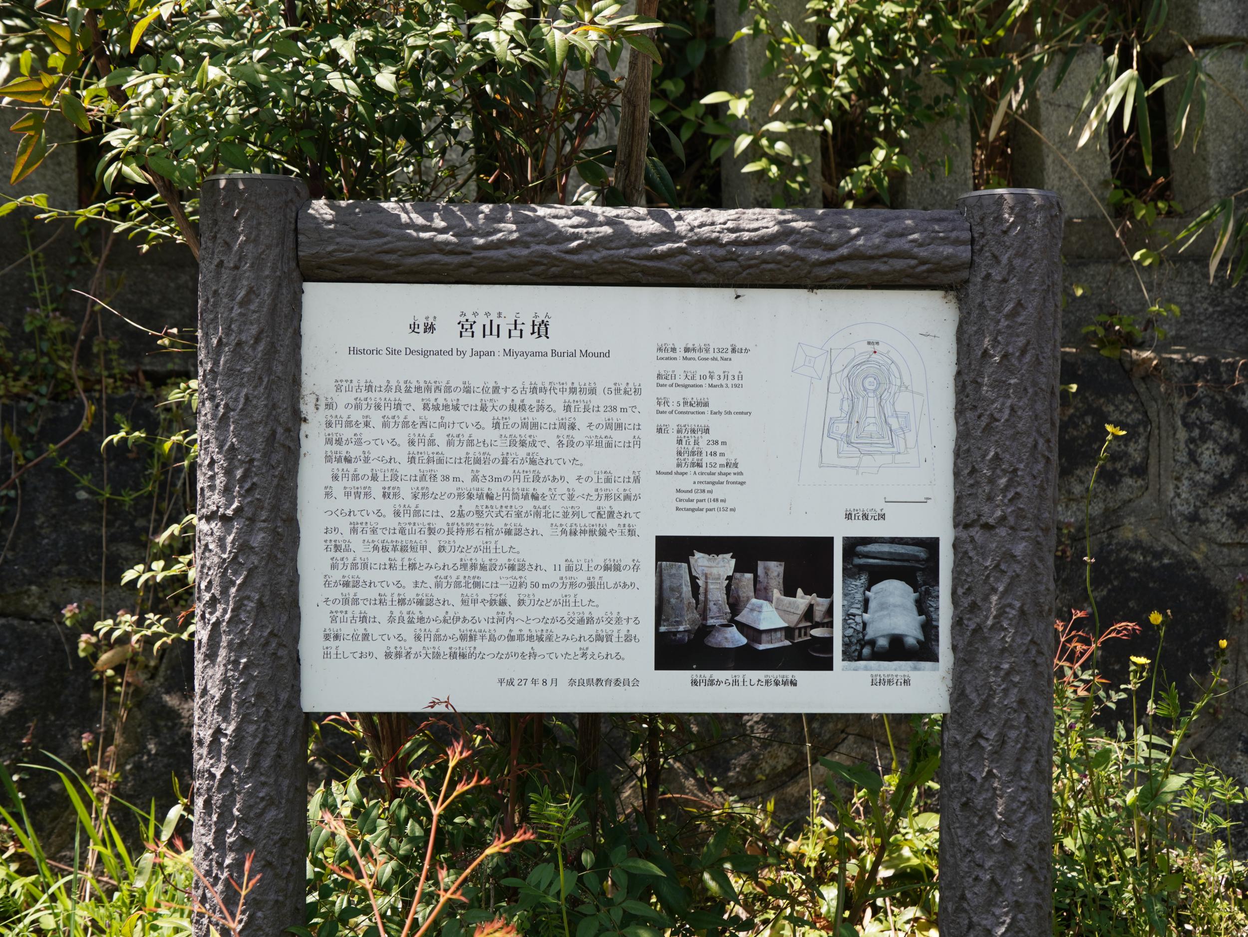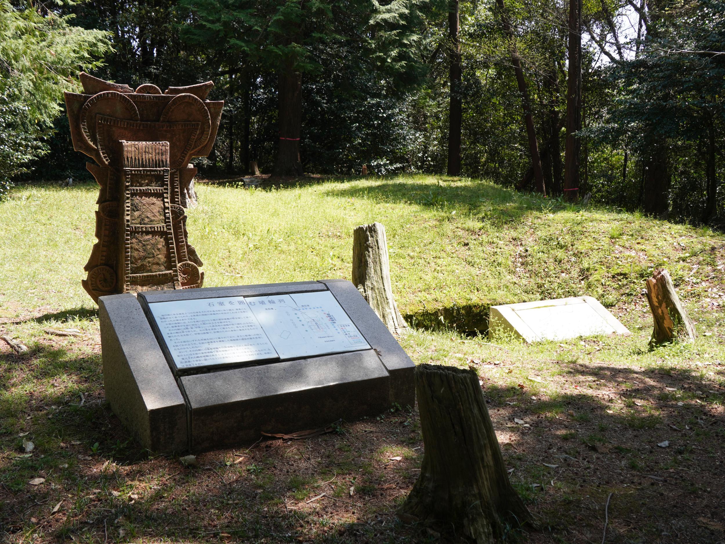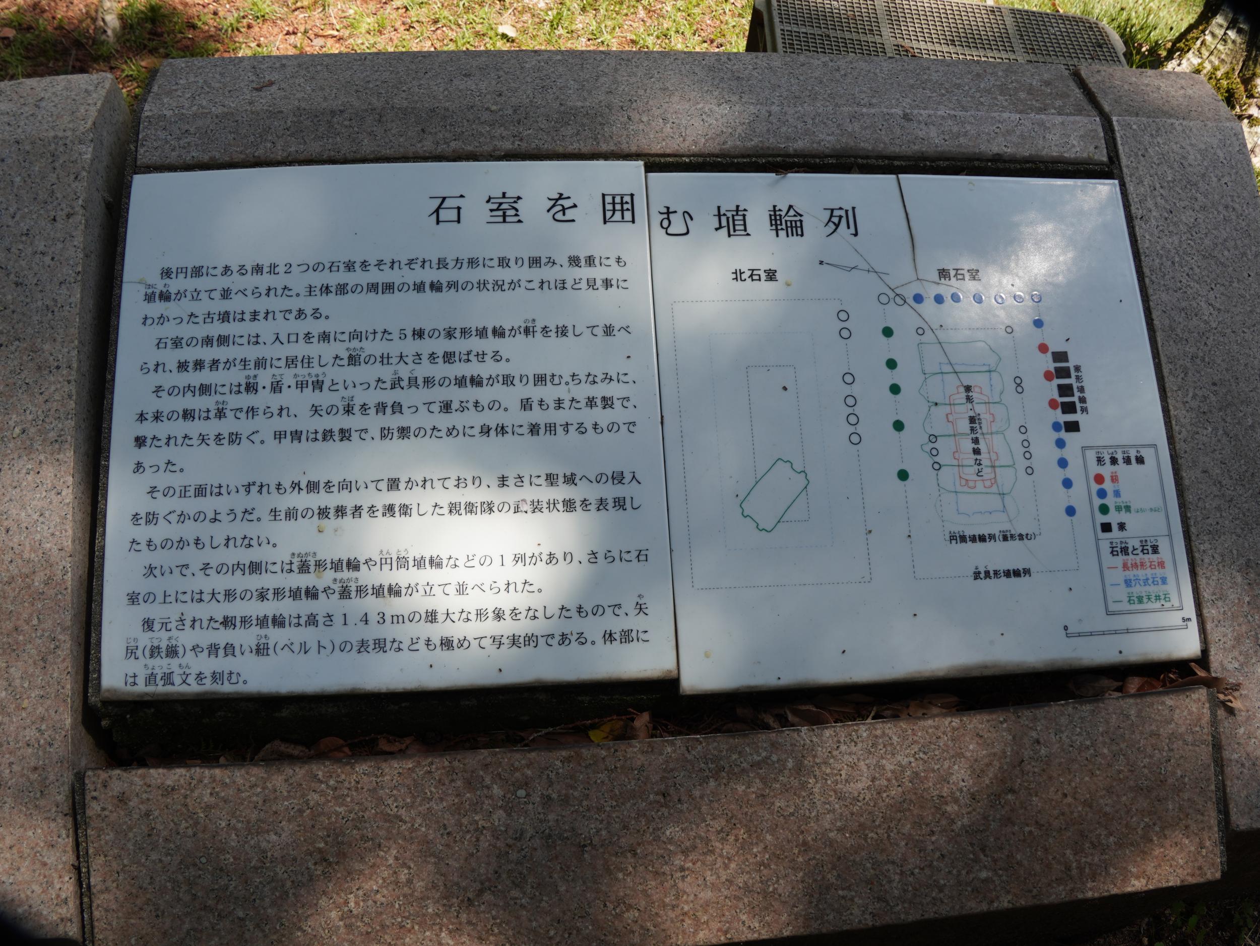 説明板に南石室の周りには靫形や家型、盾形、甲冑形の埴輪の発掘時の配置が示されています。これらの発掘品実物は橿原考古学研究所に展示されています。
