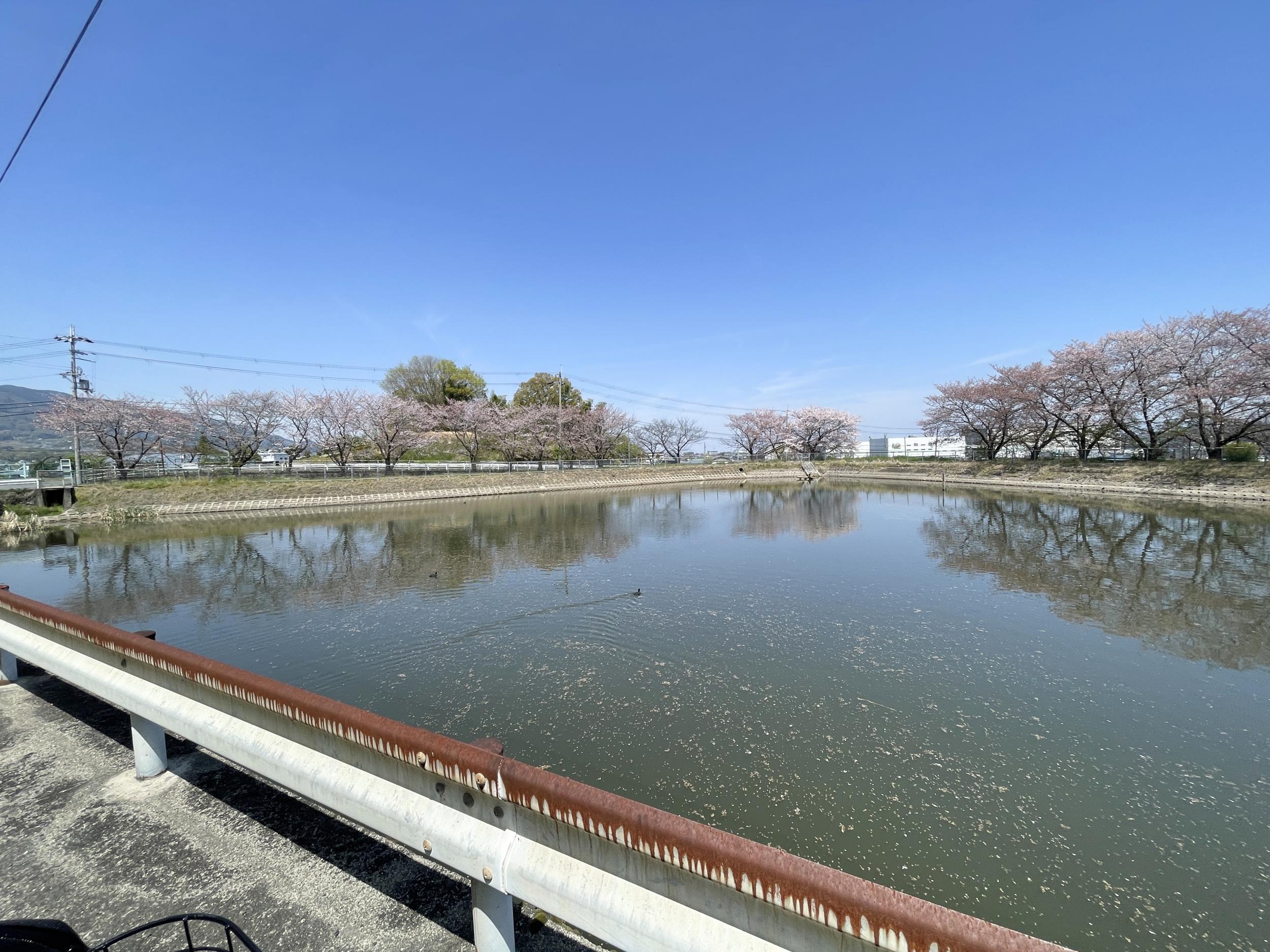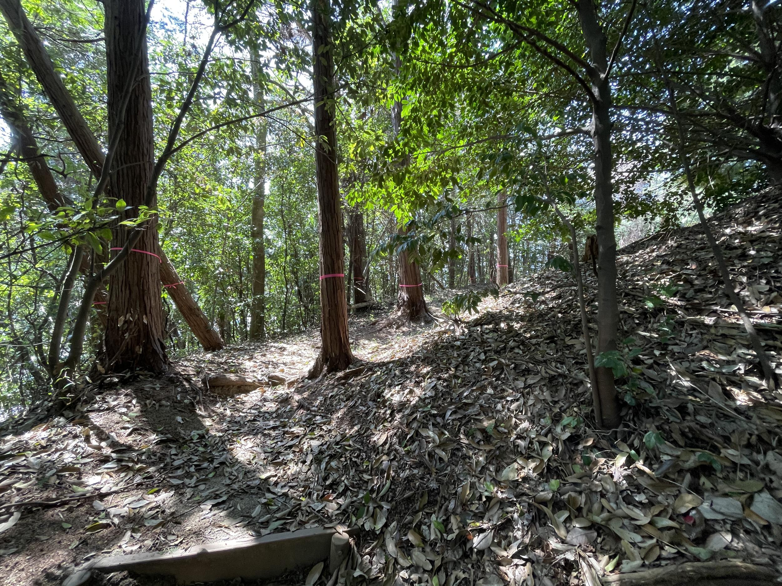 後円部外側に池、キトラ池という名前がありますが、室宮山古墳の周濠を拡張した池です。壁画で知られる飛鳥の古墳と同名ですが、同じく「亀虎」に由来するのかは不明。池の向こう岸の桜並木の向こうに見える小さな丘はネコ塚古墳と呼ばれる宮山古墳の陪塚です。間を横切る国道309号とネコ塚古墳の半分くらいを含め幅40mもあった周濠です。