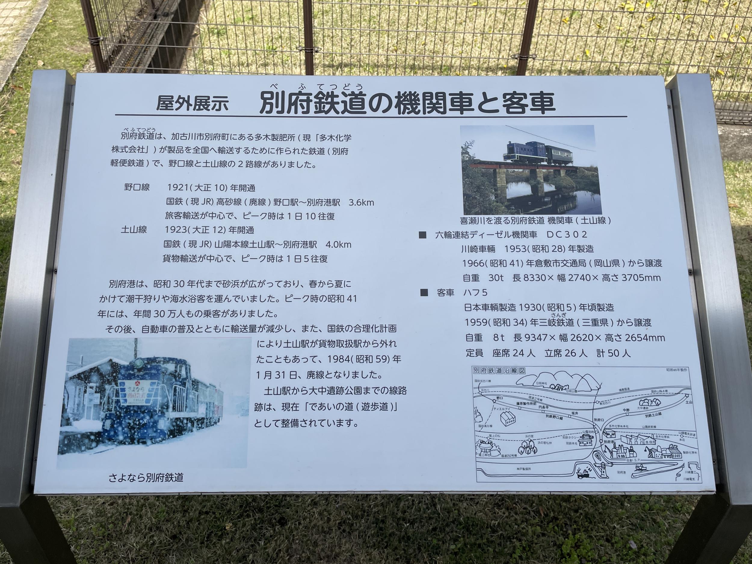播磨町郷土資料館の屋外展示、別府(べふ)鉄道の機関車と客車です。土山駅からの「であいのみち」は昭和59年に廃線となった別府鉄道土山線の線路跡と確認できました。別府港にある多木製肥所(現、多木化学、肥料、水処理薬剤の大手メーカー)の製品を積み出すための鉄道として大正10年国鉄高砂線(昭和59年廃線)の野口駅と別府港を結ぶ野口線が開業、大正12年に山陽本線土山駅までの土山線が開業しています。