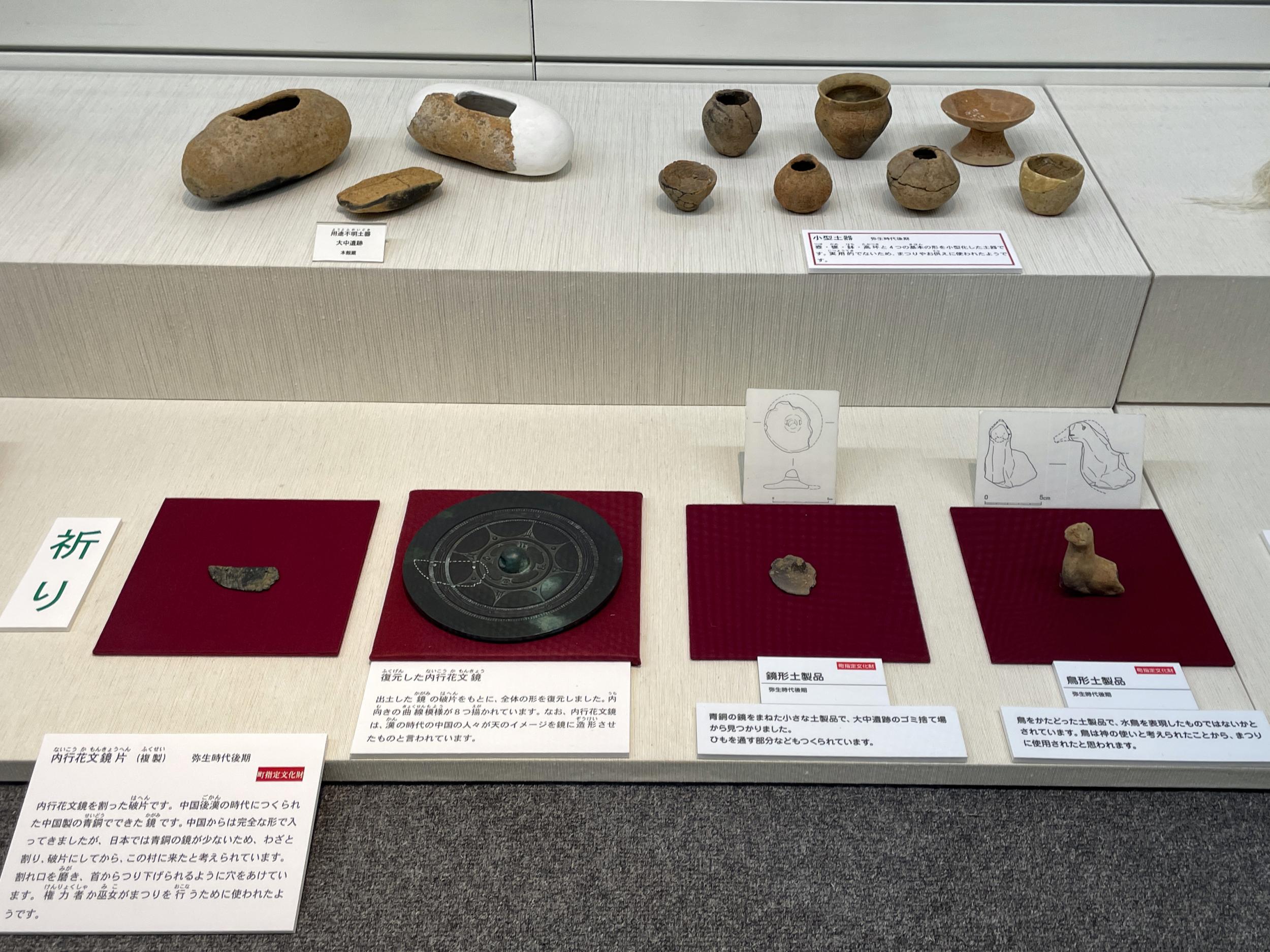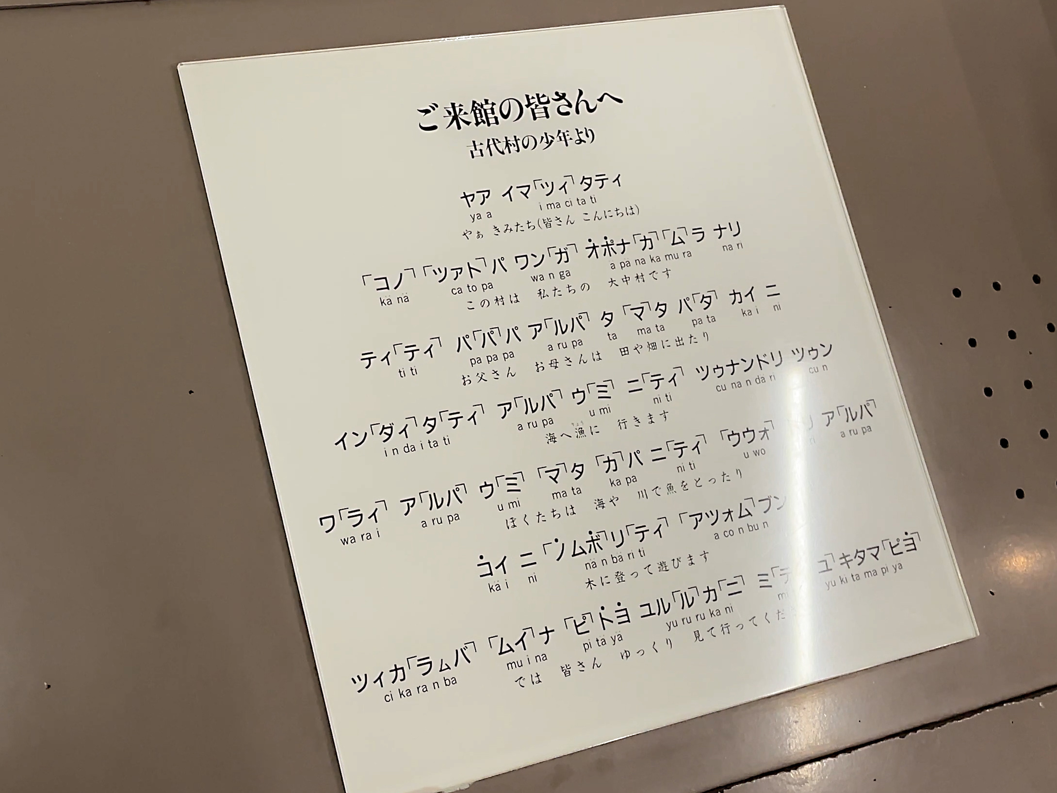 ジオラマの脇にボタンがあってオポナカムラの少年からの弥生語メッセージを聞くことができます。和楽webで現代語から弥生語への翻訳に挑戦しようという記事を見つけました。上代日本語(古墳時代頃から奈良時代の日本語)と弥生語が比較されており、クセの強い弥生語が古墳時代に現在に近い言葉に進化したようです。