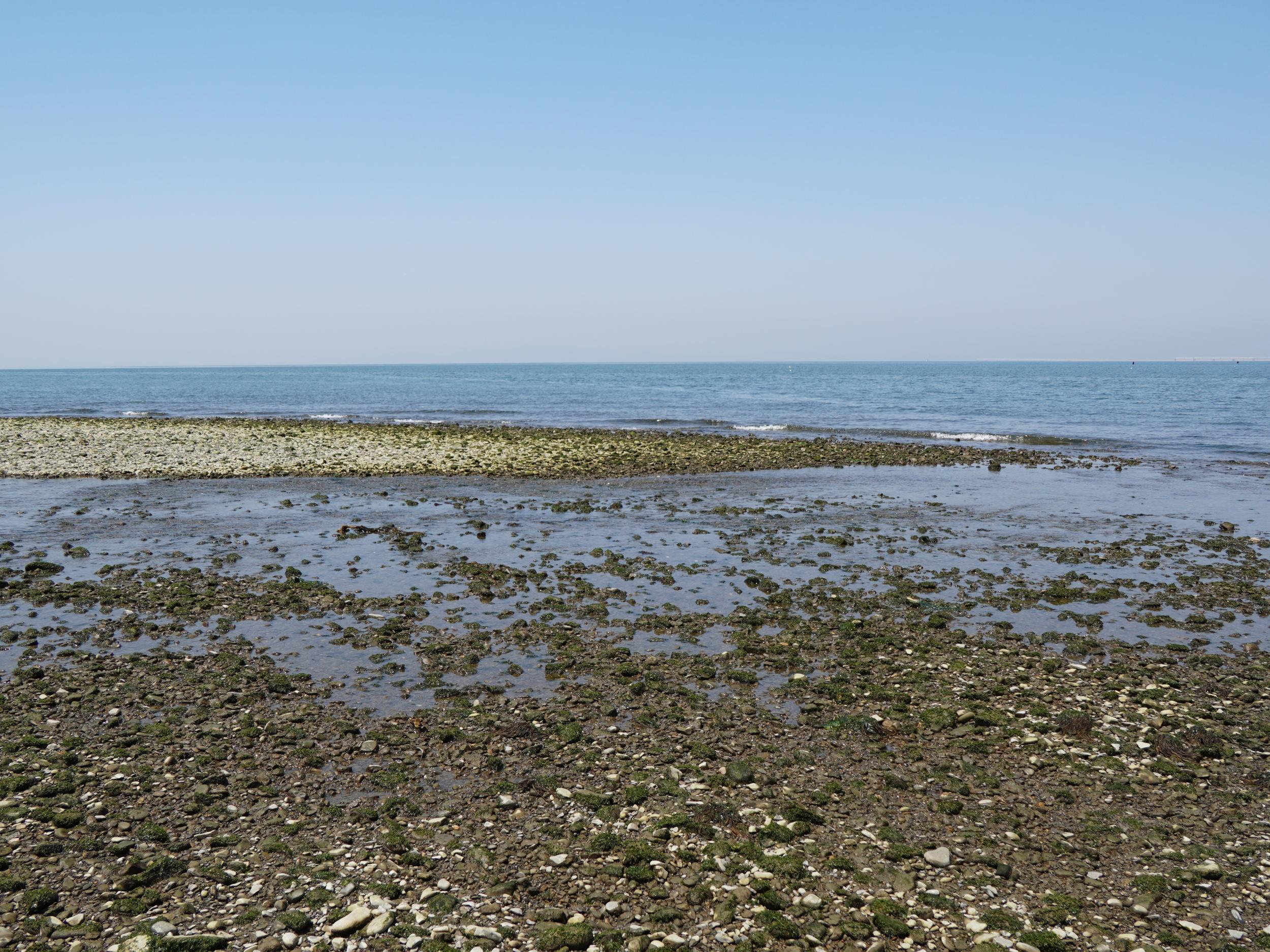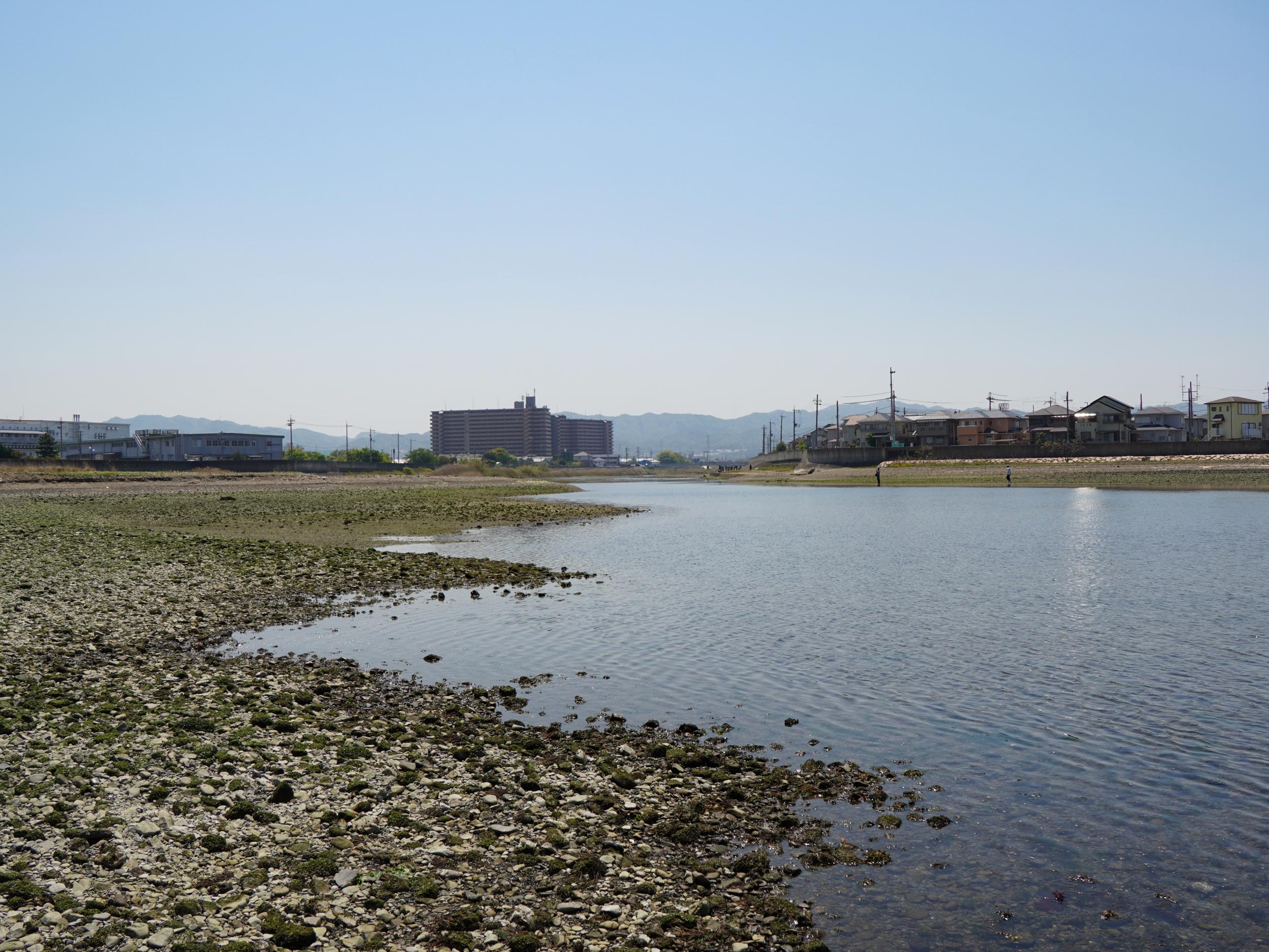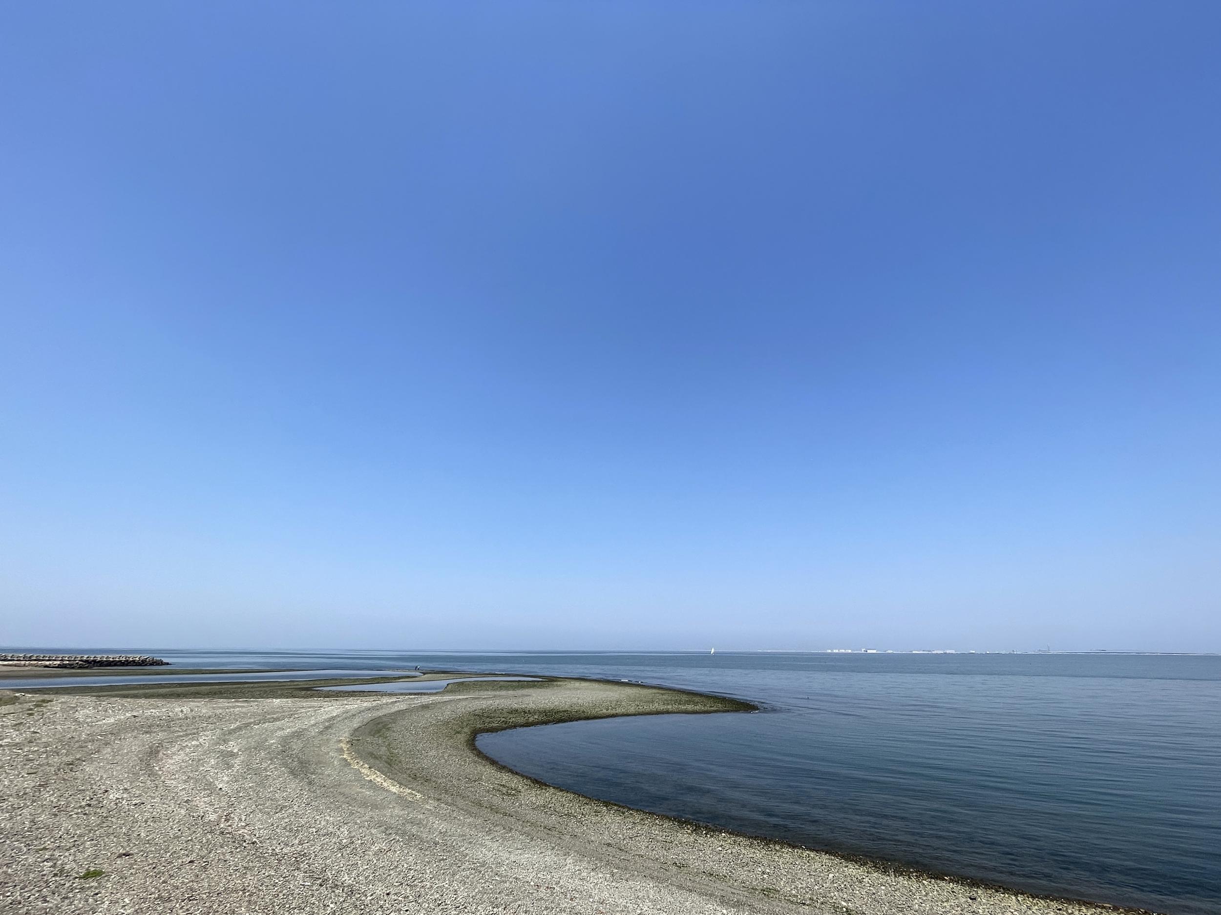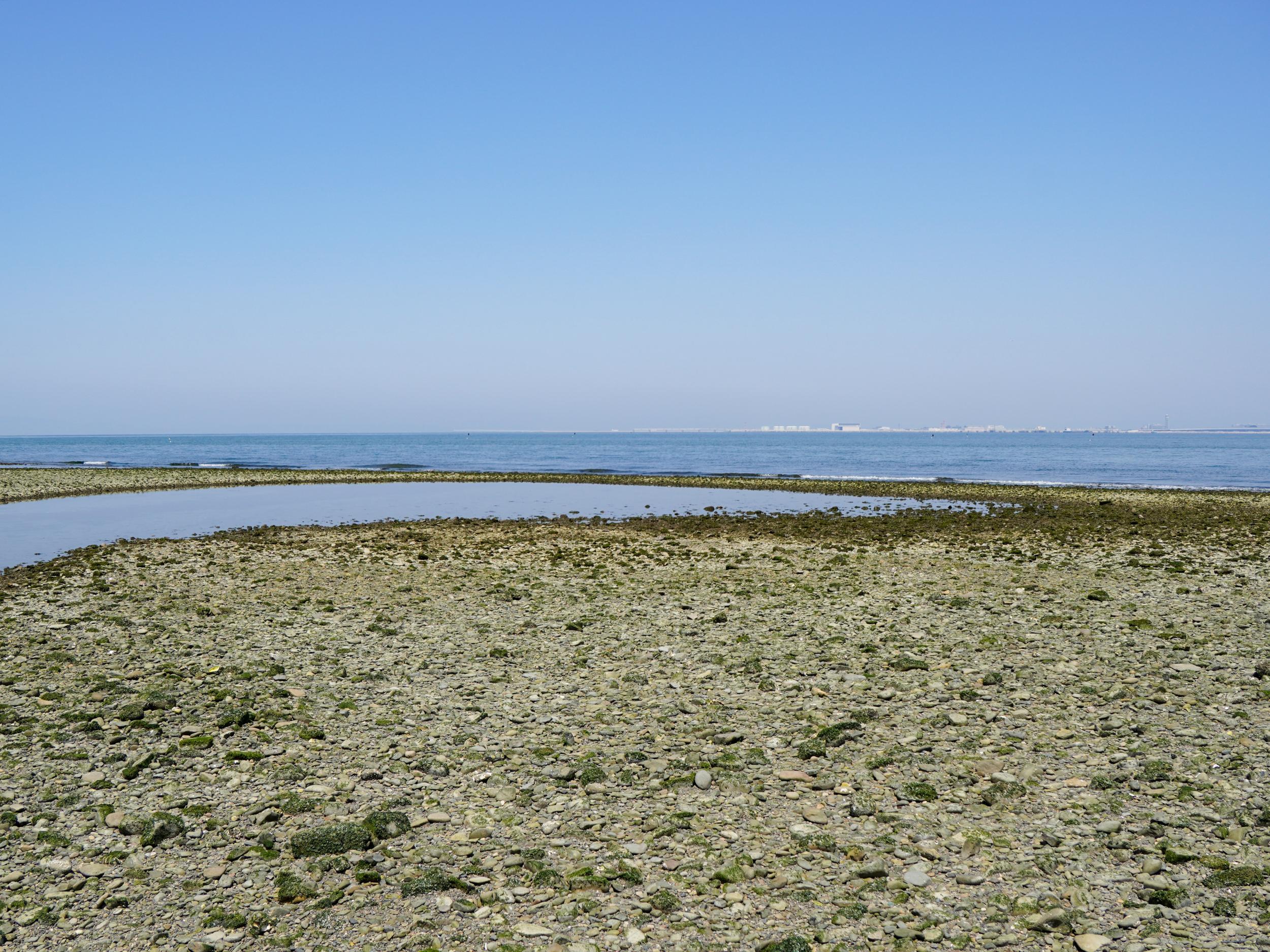 巨大潮溜まりの先、川と海の流れが僅かにつながっていました。ほぼ干潮のピークで関空島潮位は24cm、左岸河口まで歩いて渡れるくらいです。祝日の火曜日は13:52で-19cm、ほぼ確実に歩いて渡れるかと。