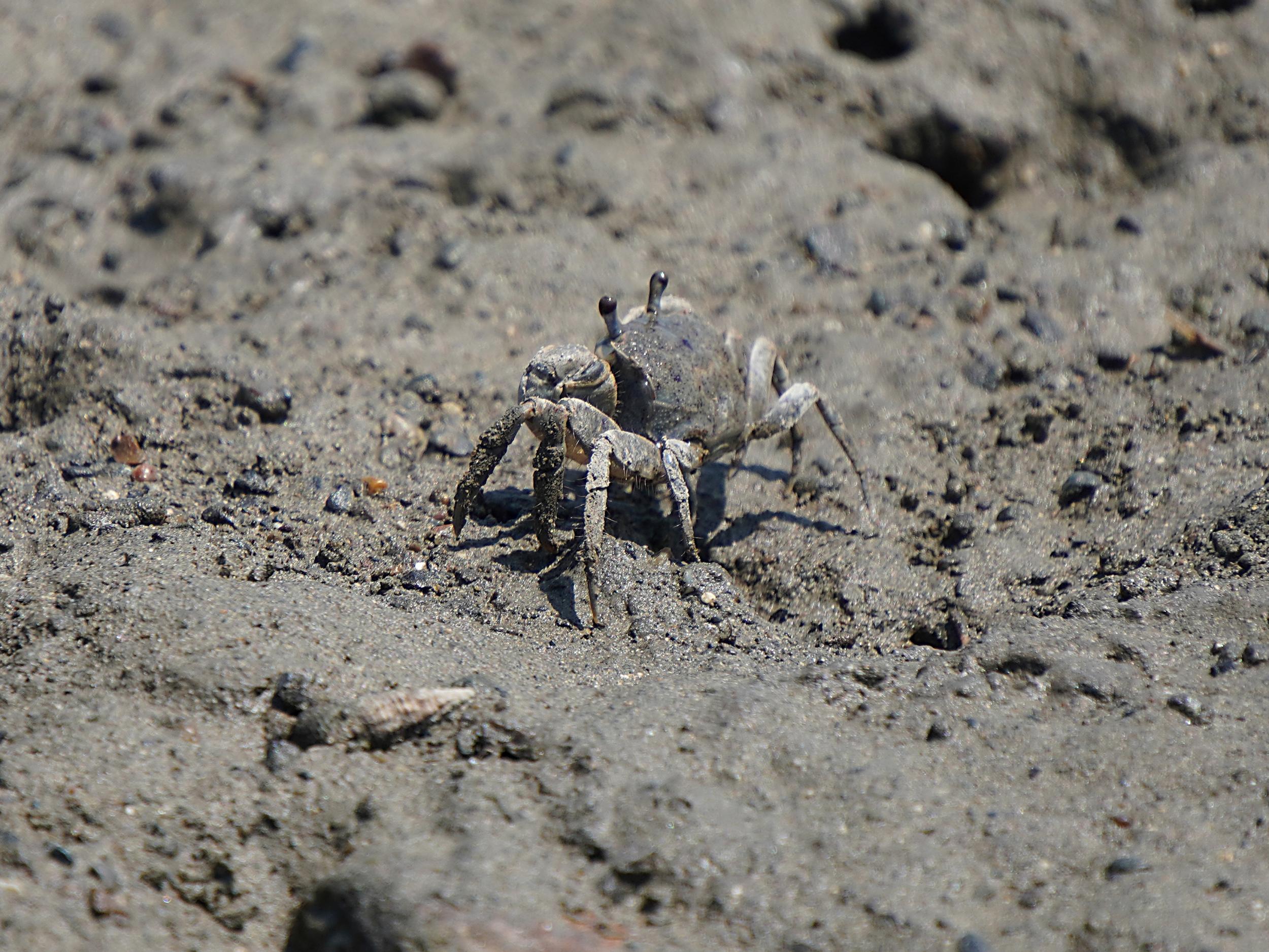 浜辺のところどころに砂団子が広がっています。一瞬動く影が見え、しばらくじっとスタンバイしたものの姿を表さず。