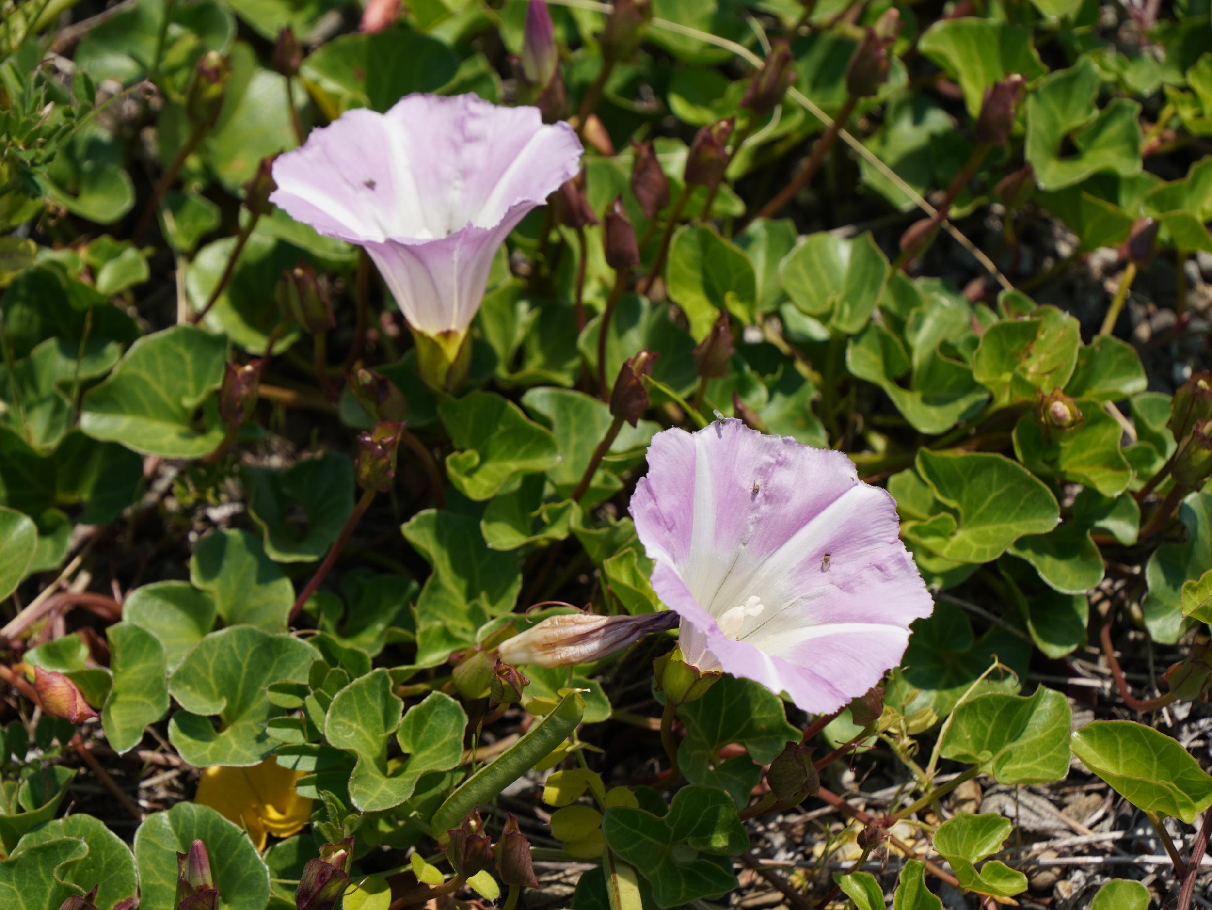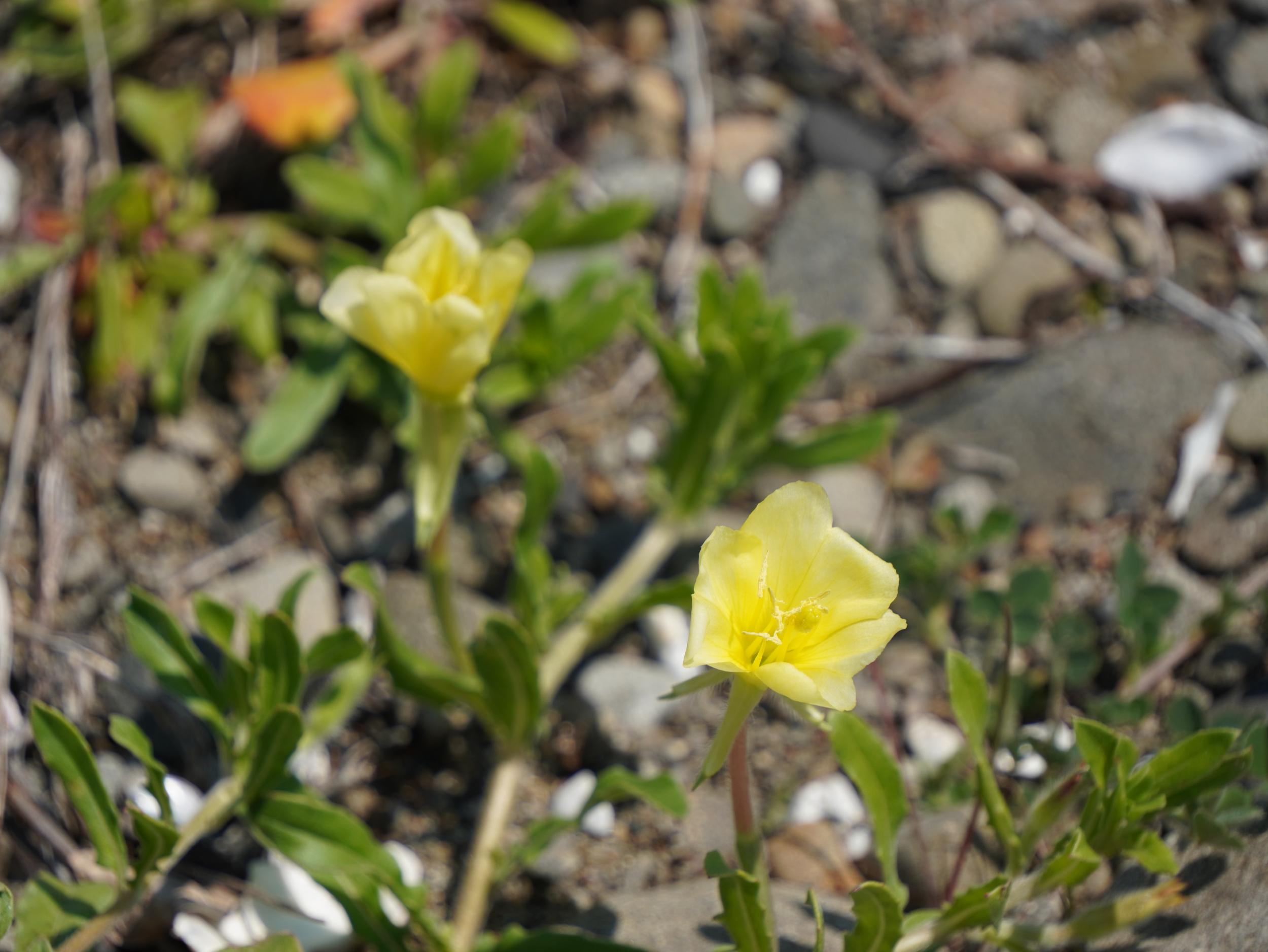 要注意外来生物のコマツヨイグサと在来種のハマヒルガオ。