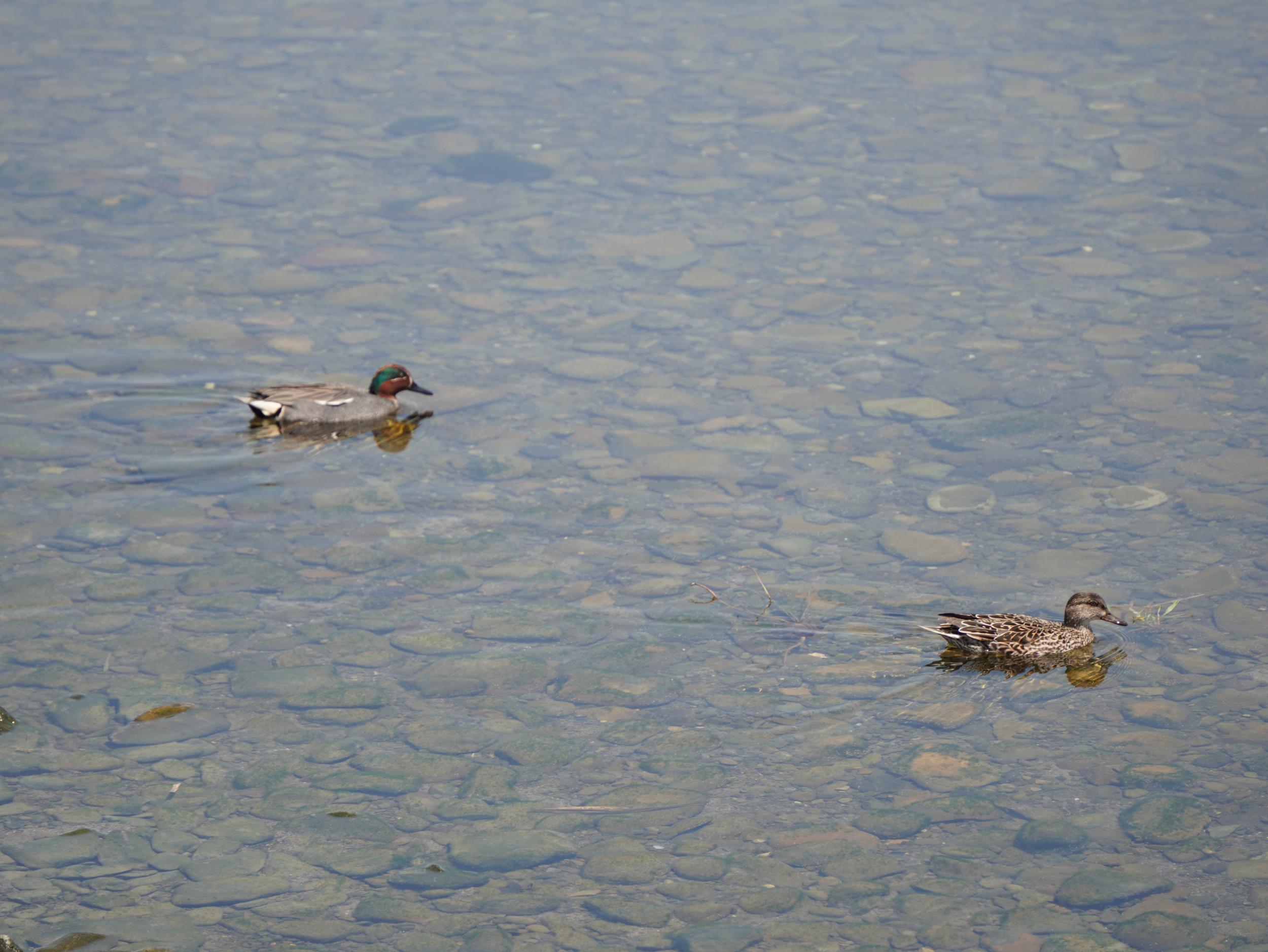 ファミマでハムカツサンドを買って左岸へ。毎年渡りのラストランナーとなるコガモです。