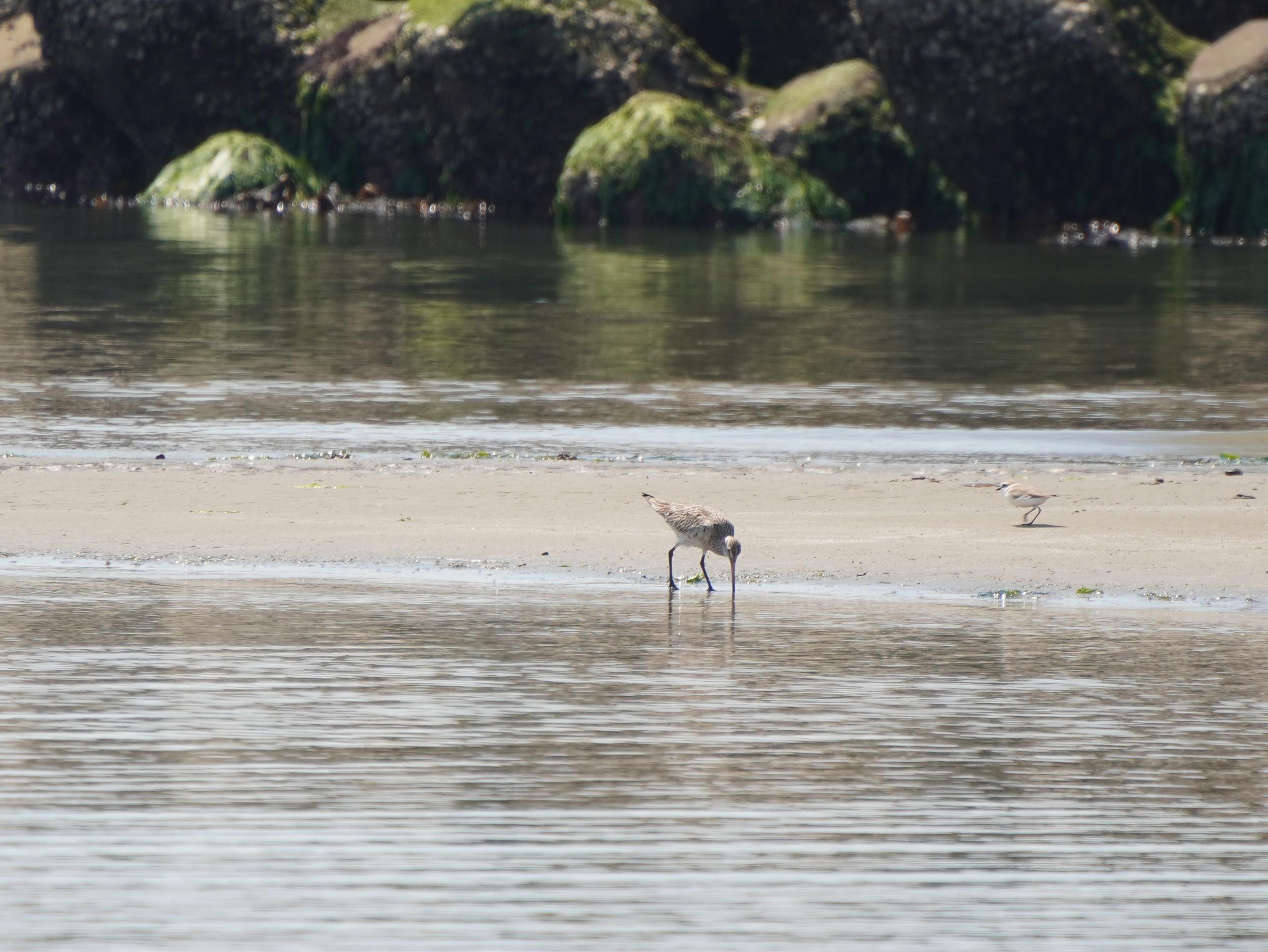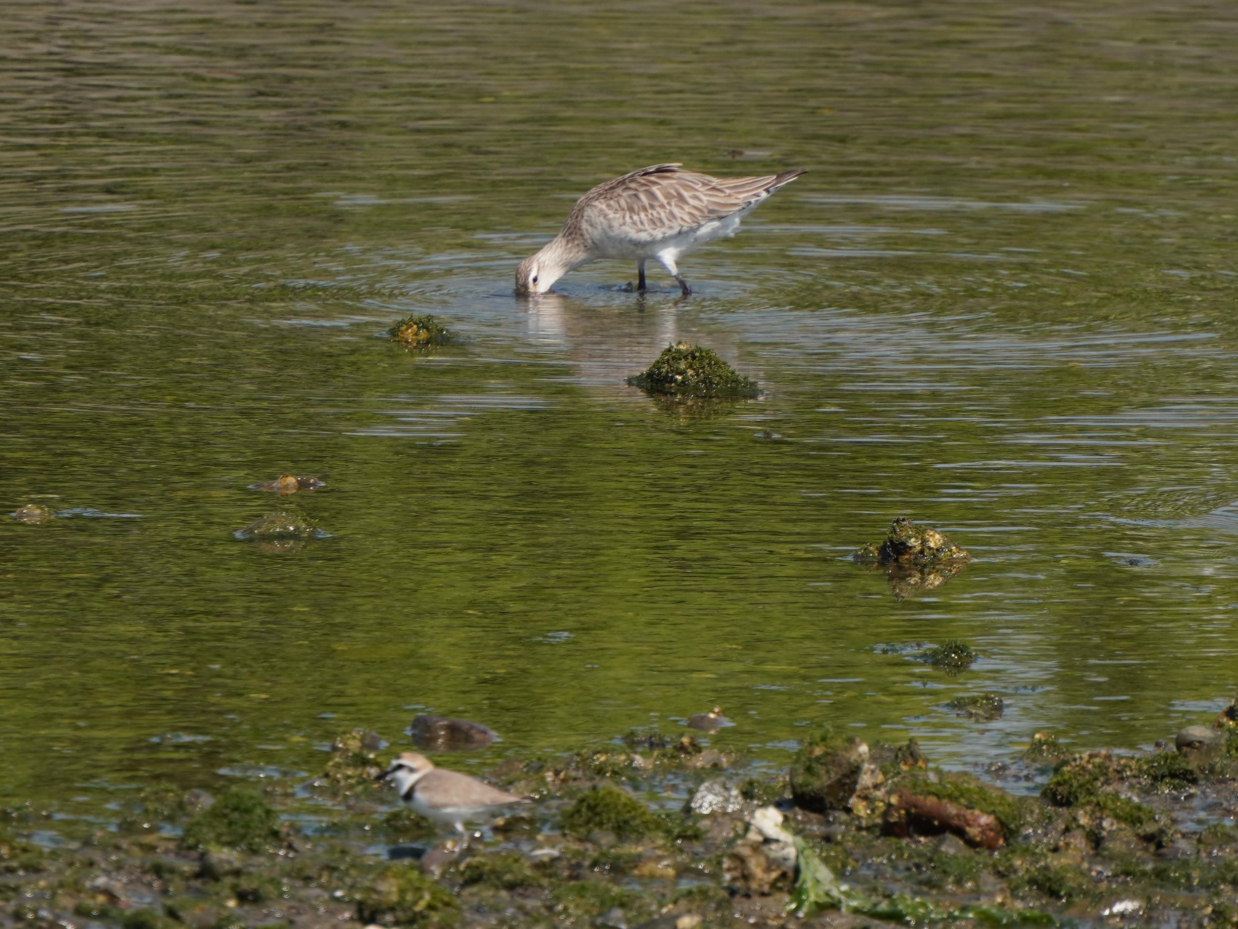 長くれ上に反ったくちばしをボコッと水底まで突っ込んでいるオオソリハシシギ。オオソリハシシギが飛び立つとシロチドリも追いかけて行きました。