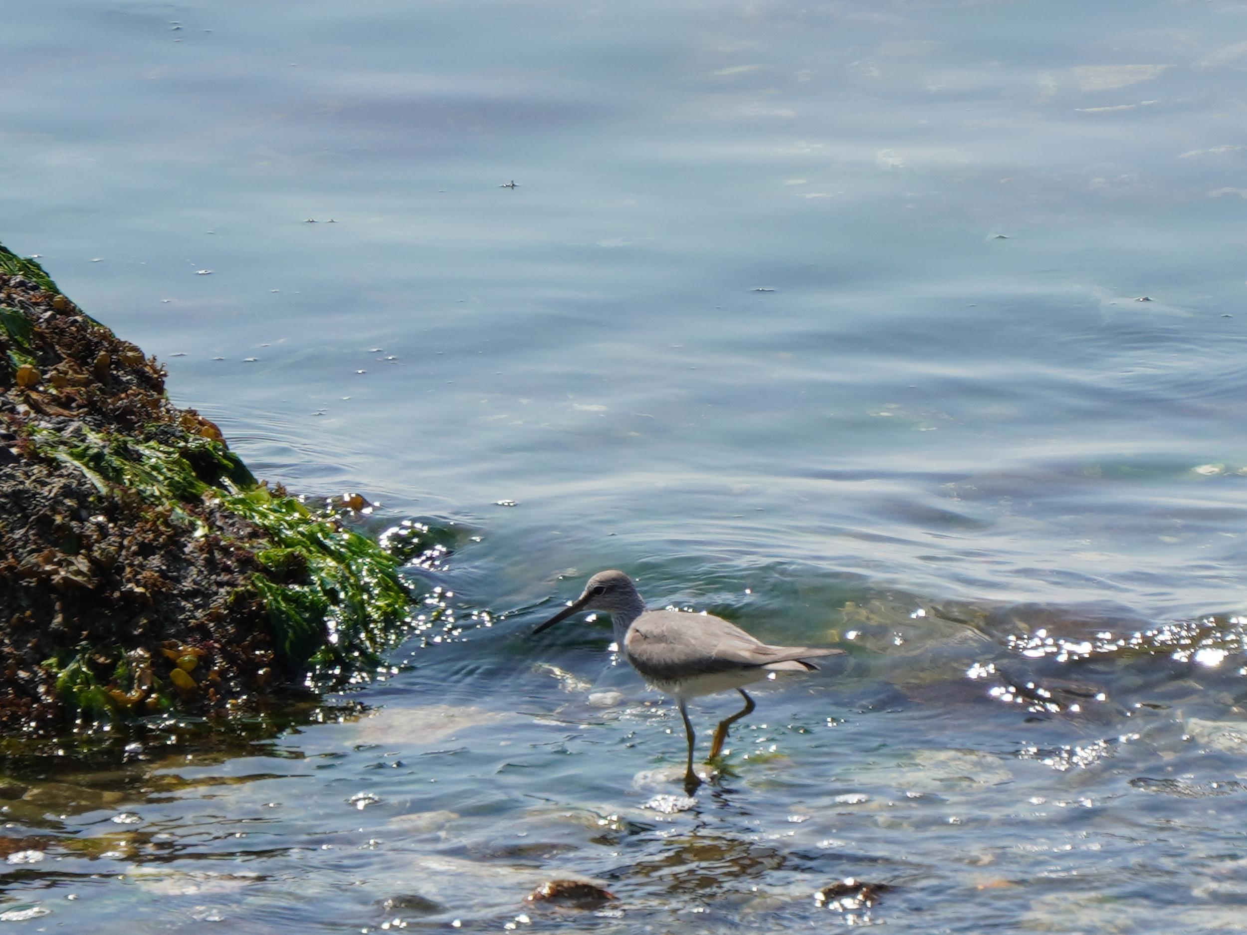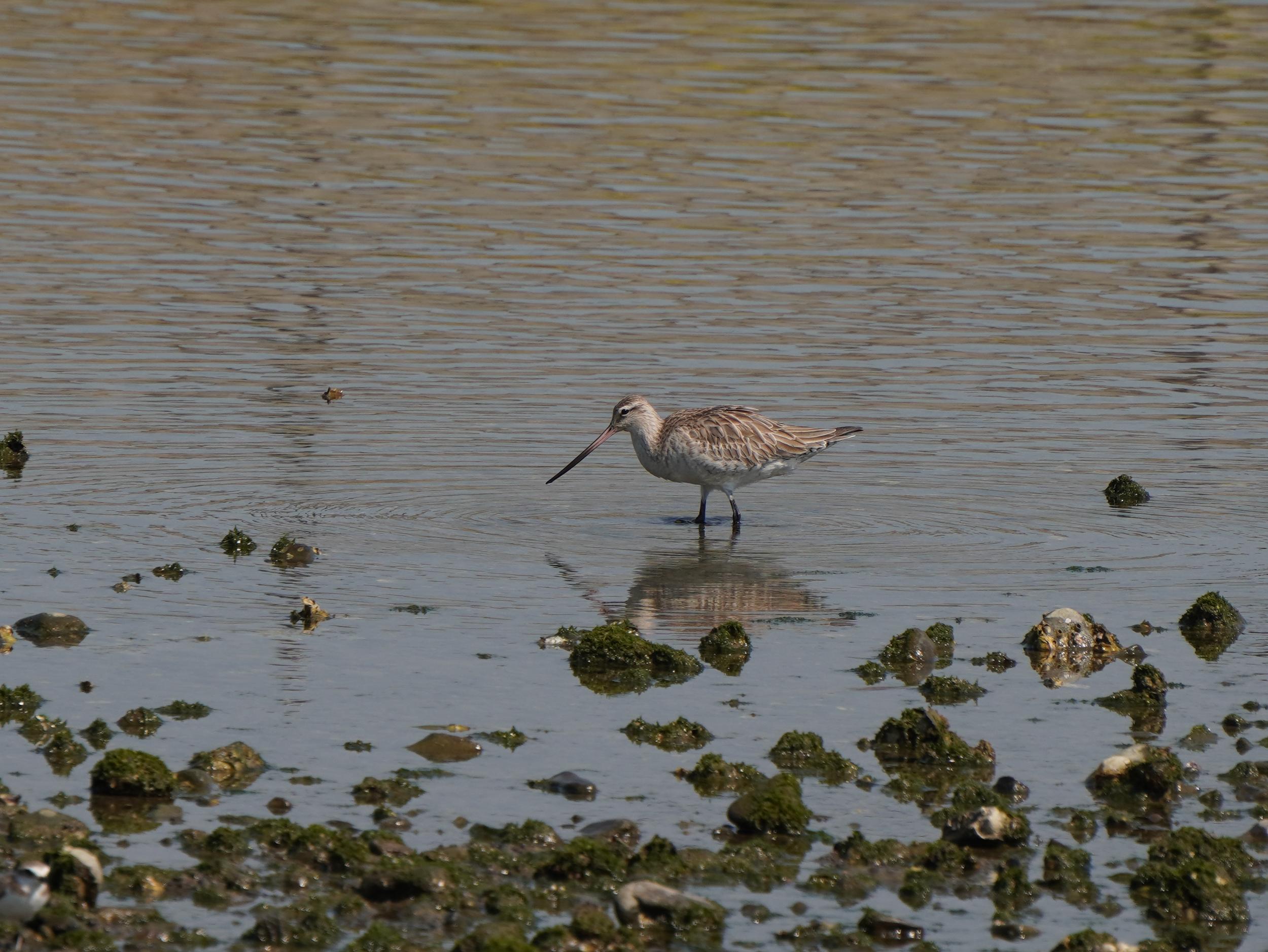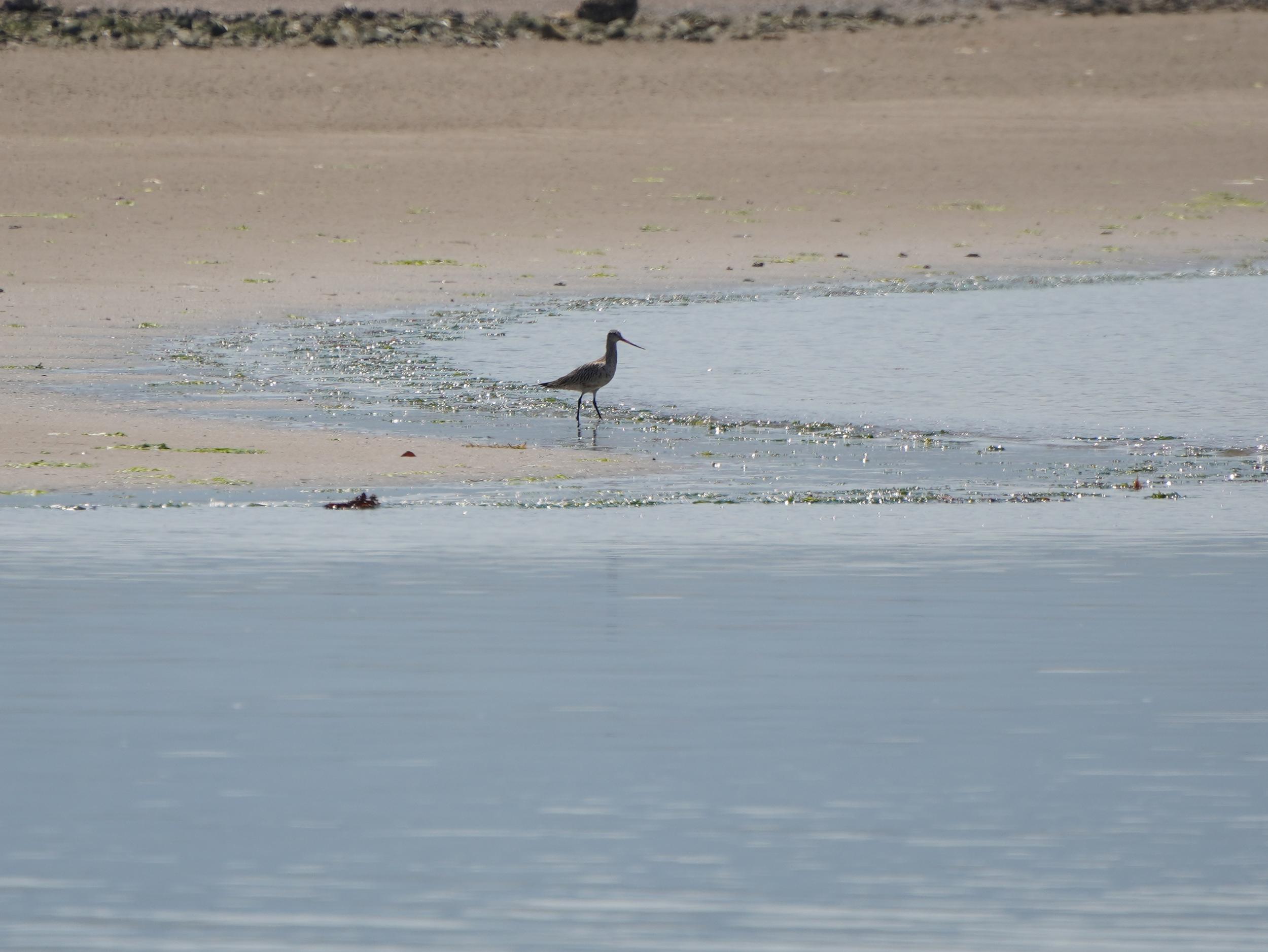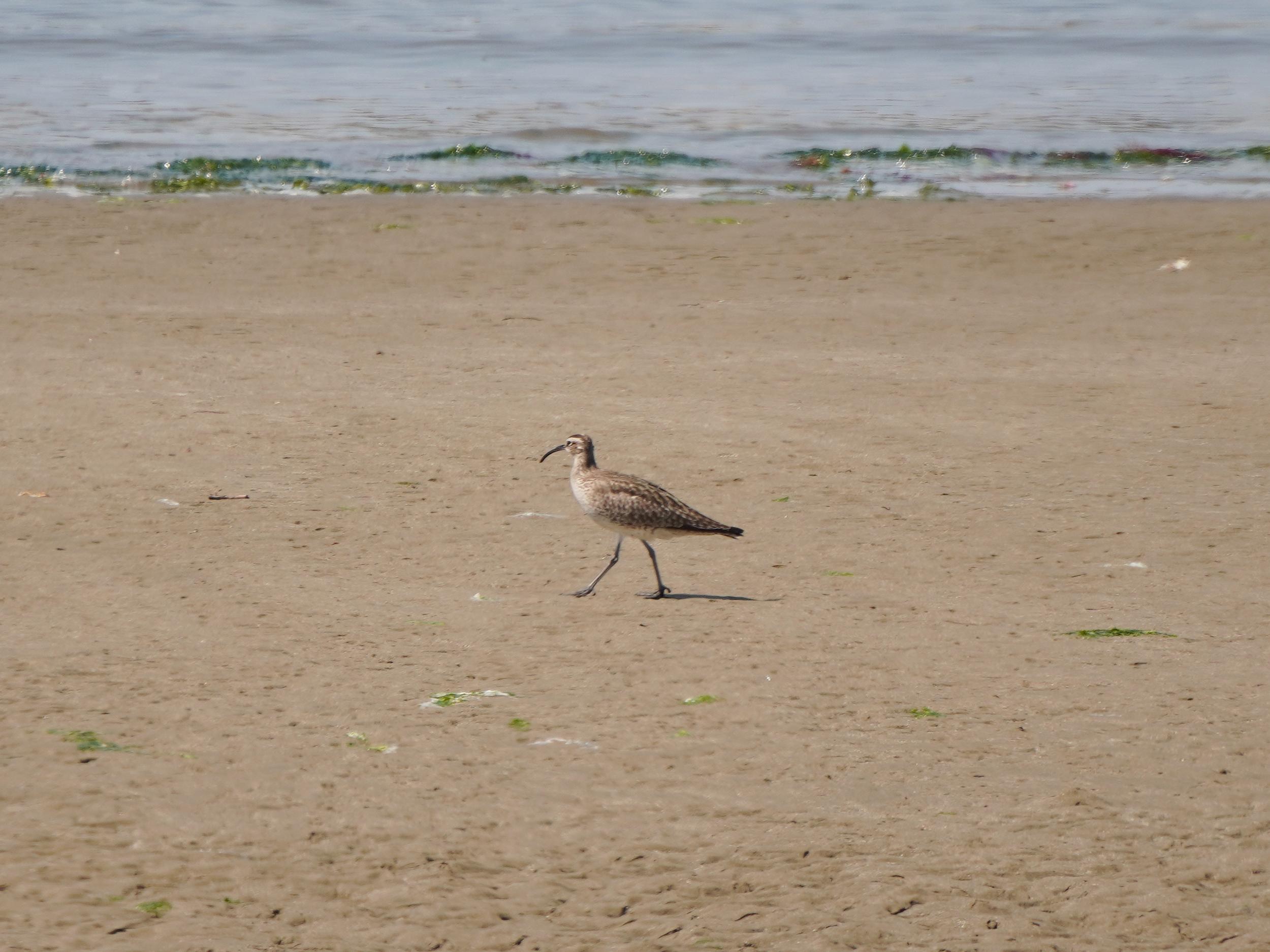 尾崎の浜(福島海岸)にポツンと大きめの鳥、ハムカツサンドを食べ終えてズームしてみると、くちばしの根元が赤いオオソリハシシギです。