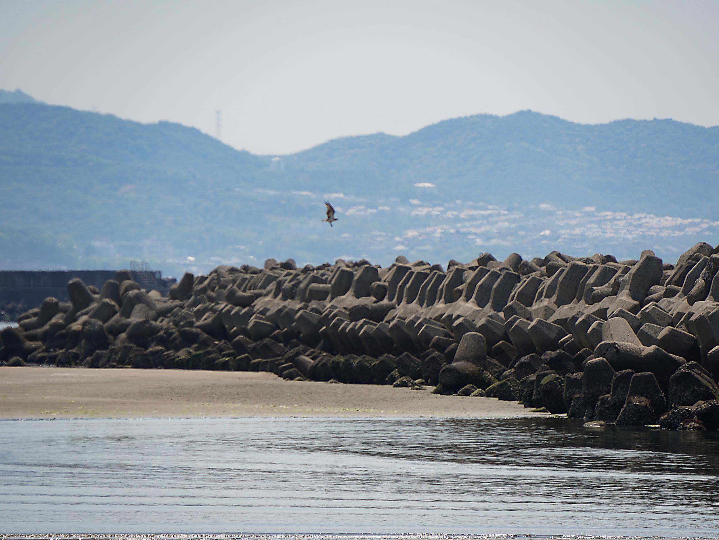 男里川左岸河口に戻ってくると、ミサゴも河口に戻ってきました。海面すれすれ飛行も獲物は見つけられなかったようです。