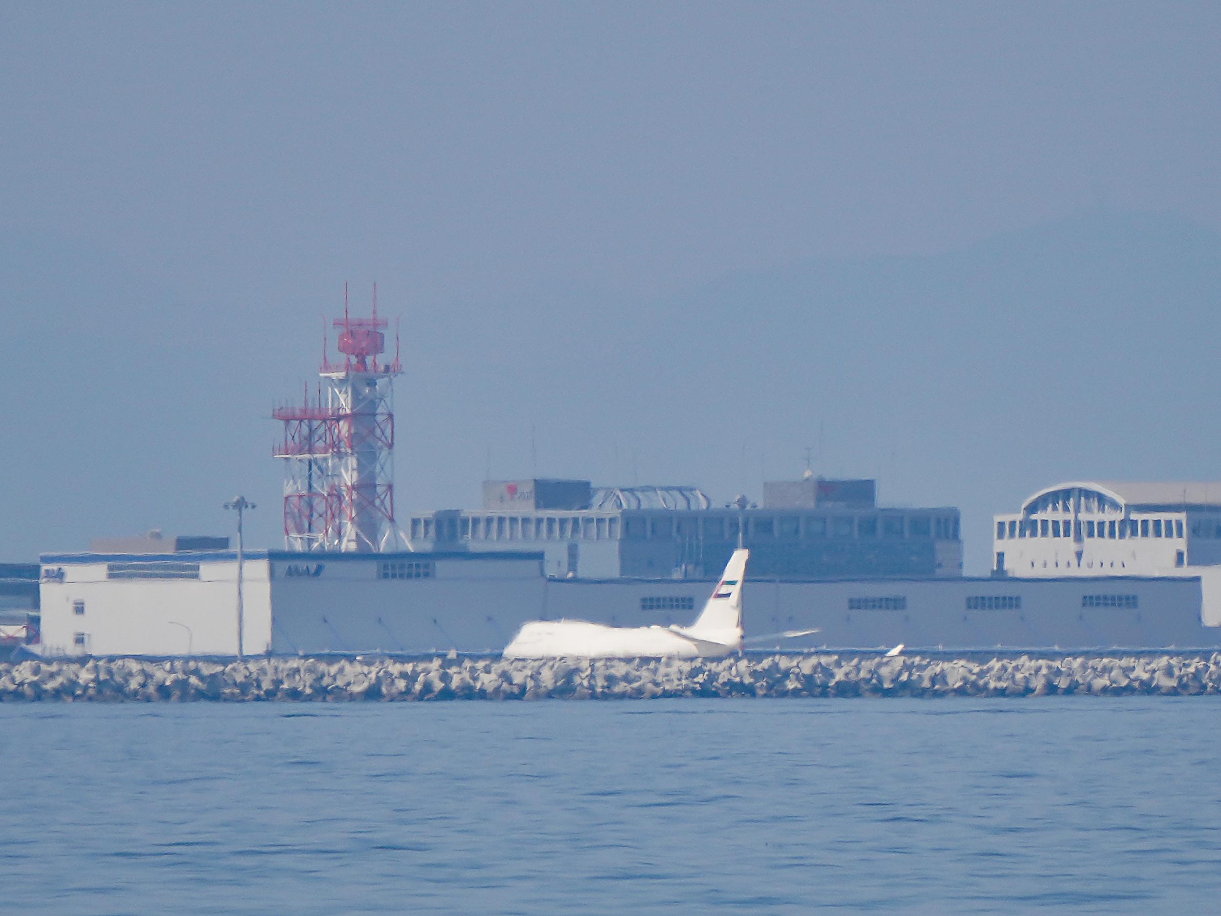 ターミナルから離れたところにジャンボが駐機していました。尾翼にはアラブの国旗らしきマーク。関空の出発便到着便をチェックしても見つからず、さんざんググってドバイ政府航空部門ドバイ・ロイヤル・エア・ウィングの王族や政府要人専用機と分かりました。万博がらみの来日かも。