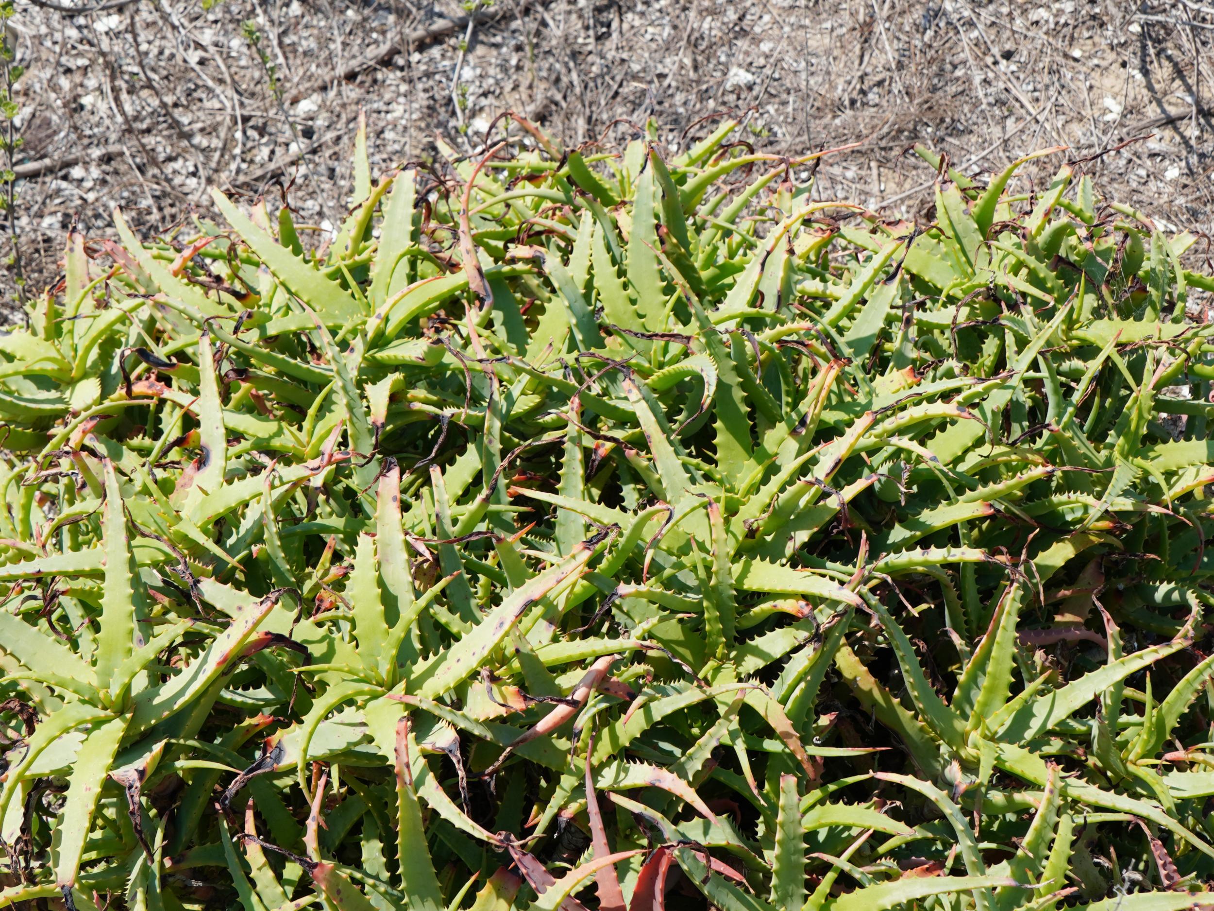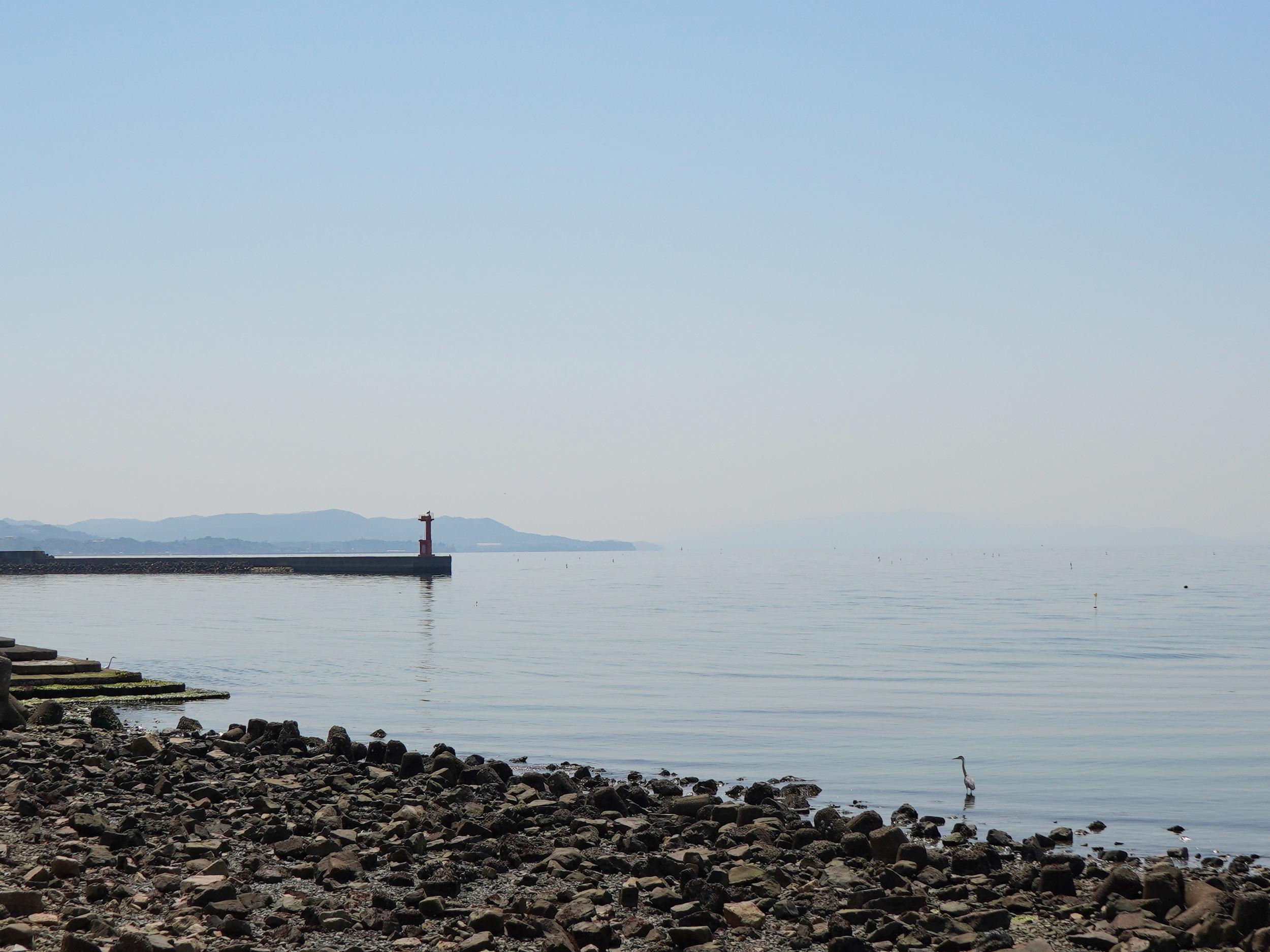 ベタ凪の大阪湾、黄砂で淡路島はほとんど見えません。足元にはアロエ。