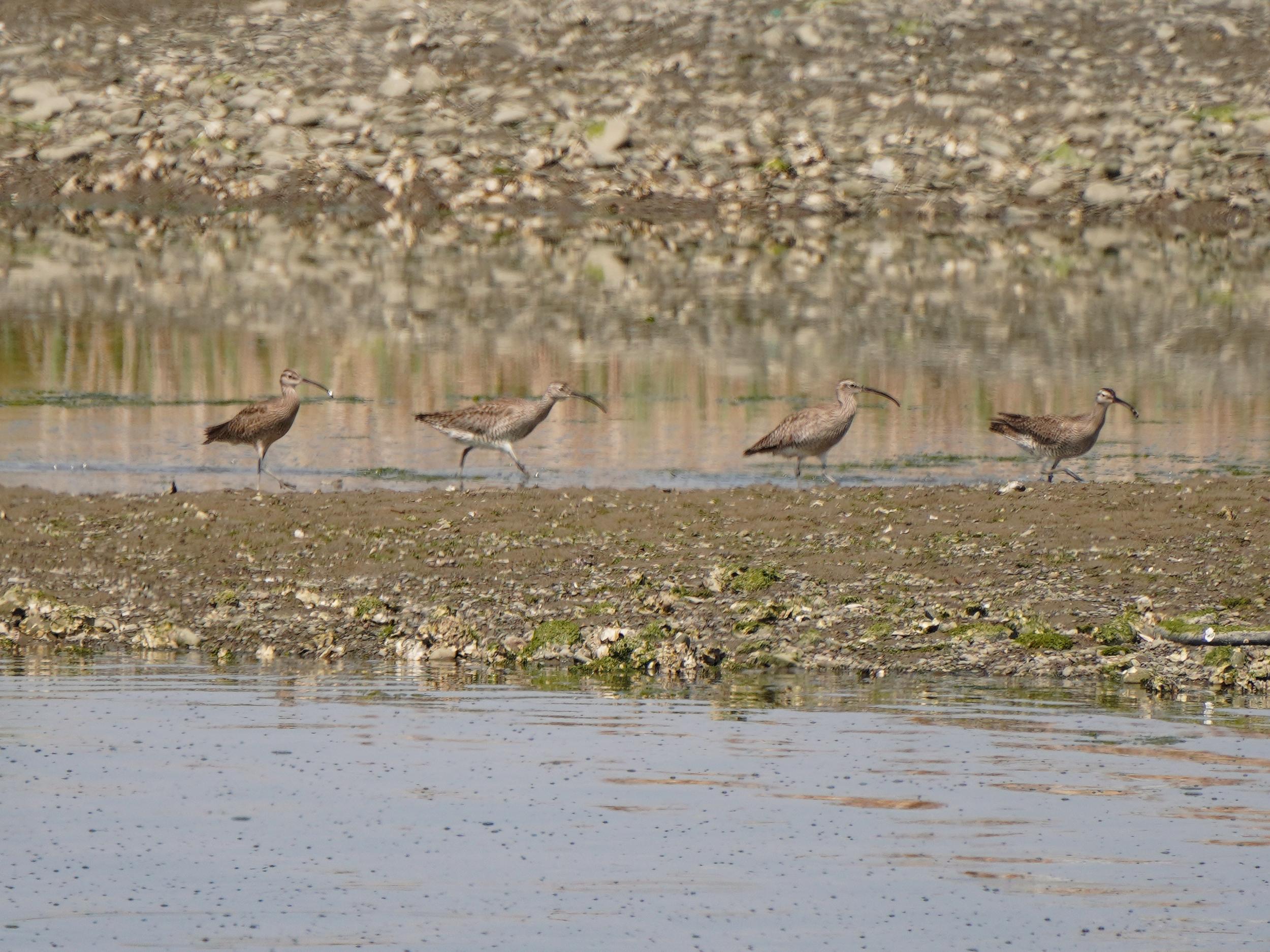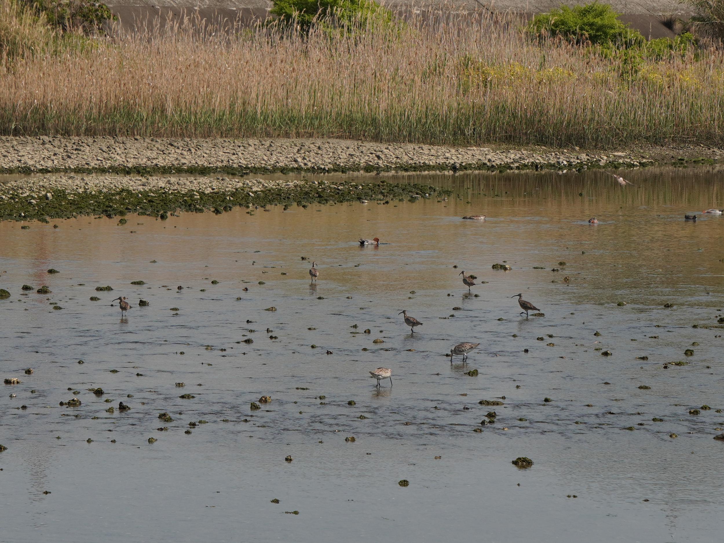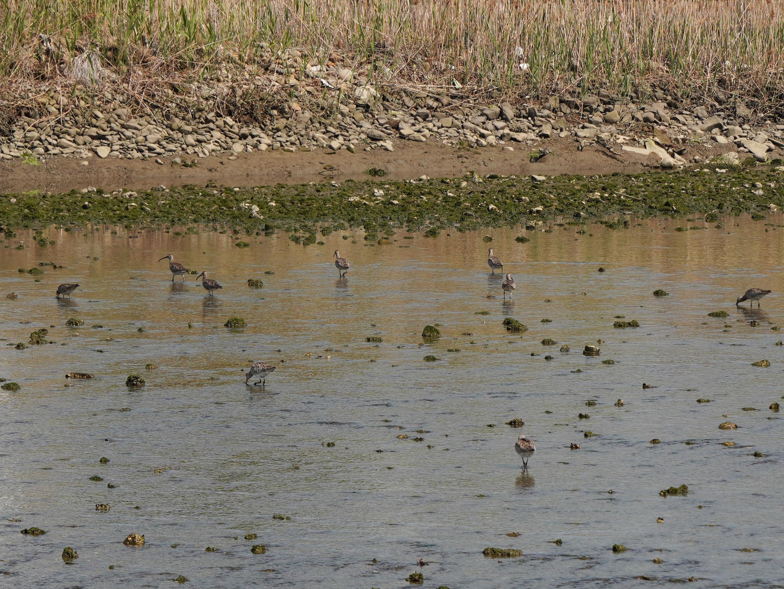 岸壁下の歩きにくい護岸用の石の道を歩いているとチュウシャクシギが8羽くらい。