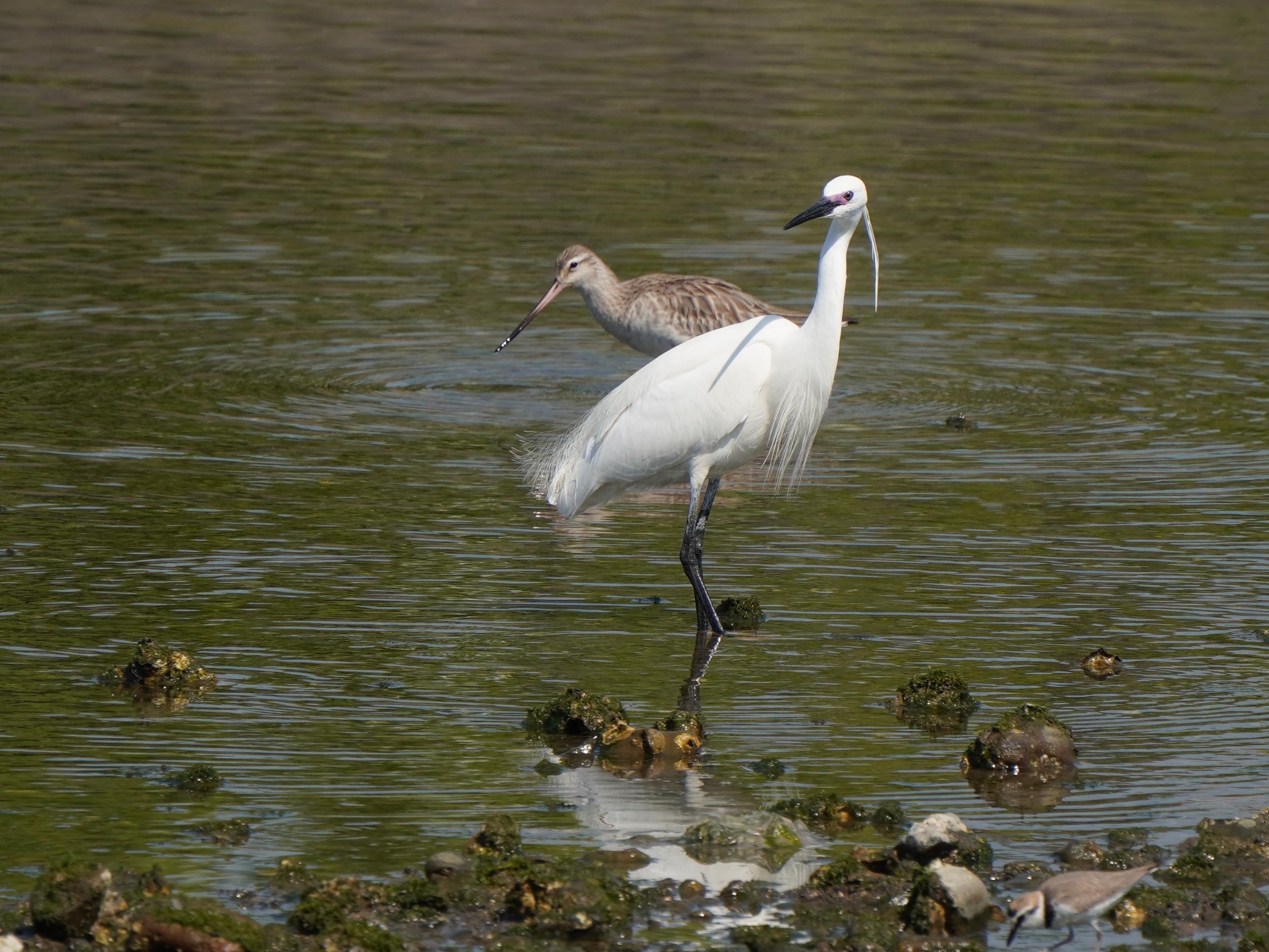 オオソリハシシギも間近。美形のダイサギとツーショット。