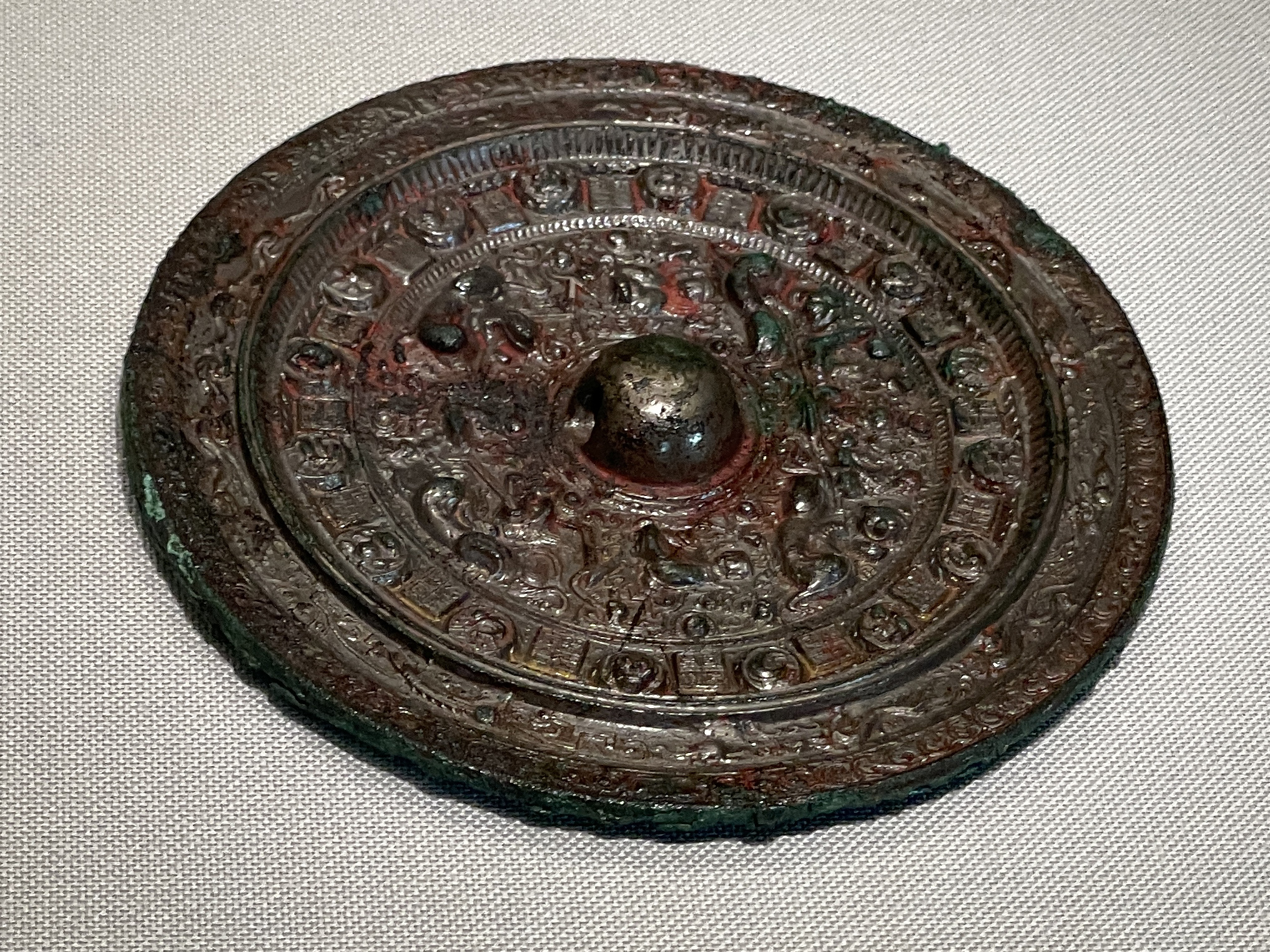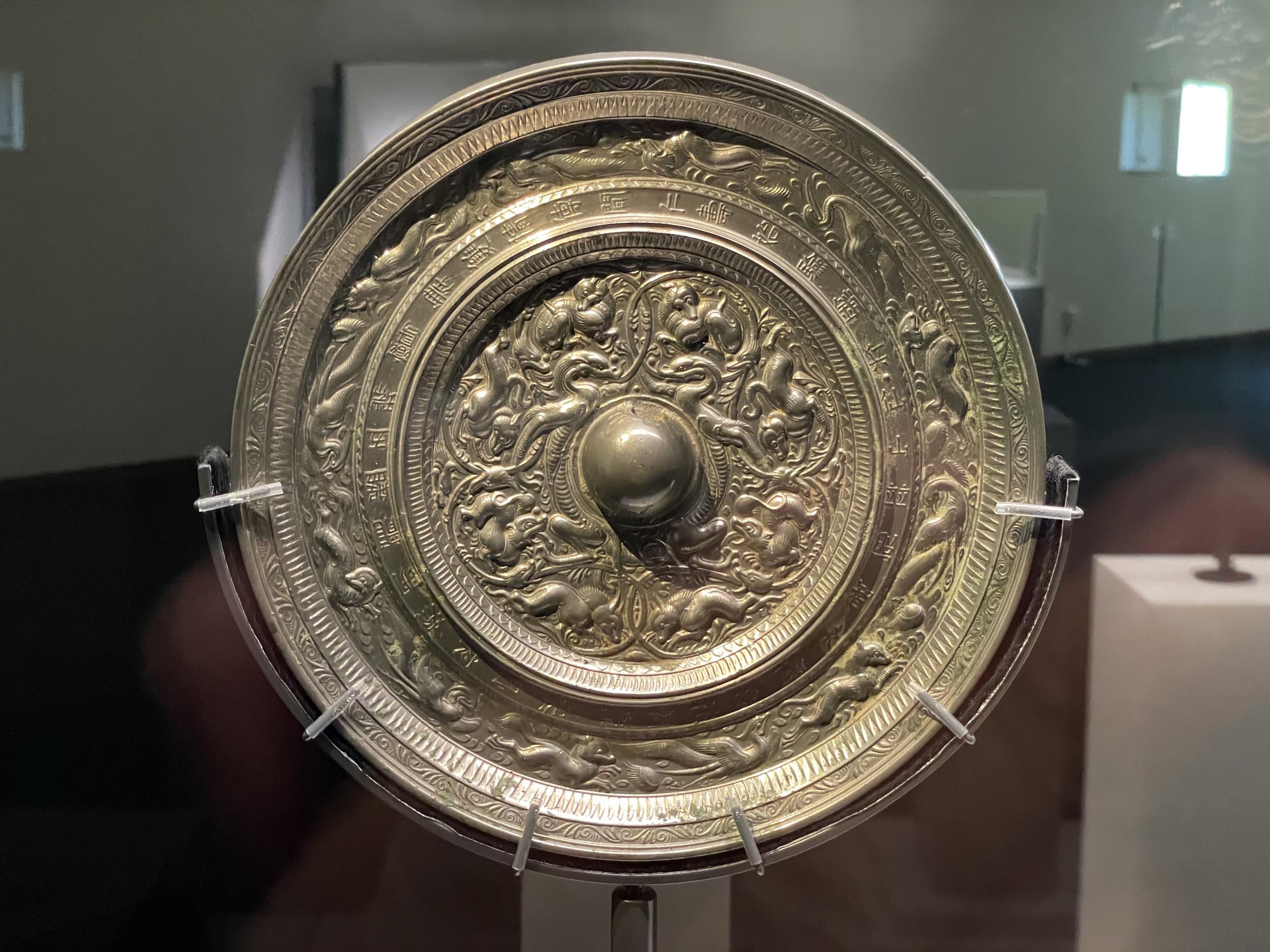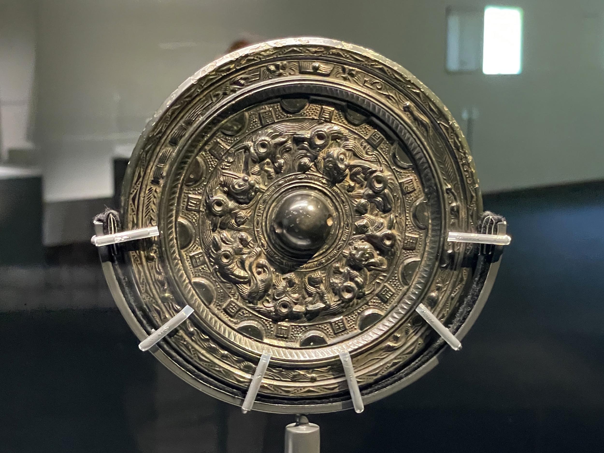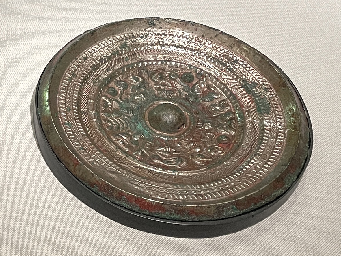 銀メダルの位置は仁寿狻猊鏡(じんじゅさんげいきょう、唐代7世紀)。白銀色は錫の含有量が多いことでもたらされると来村先生の動画で学びました。紐(中央の突起)のまわりに配置された8匹の狻猊(さんげい)は獅子のことらしい。