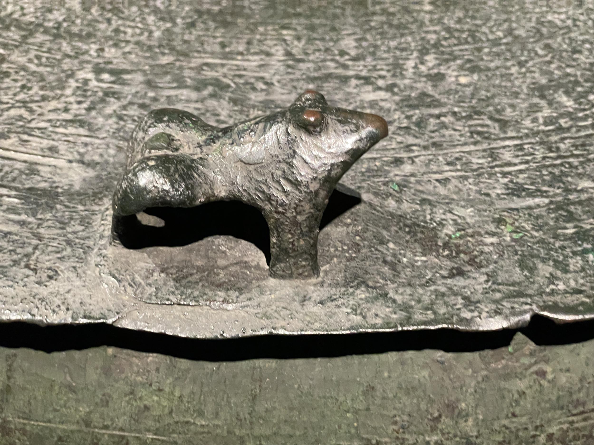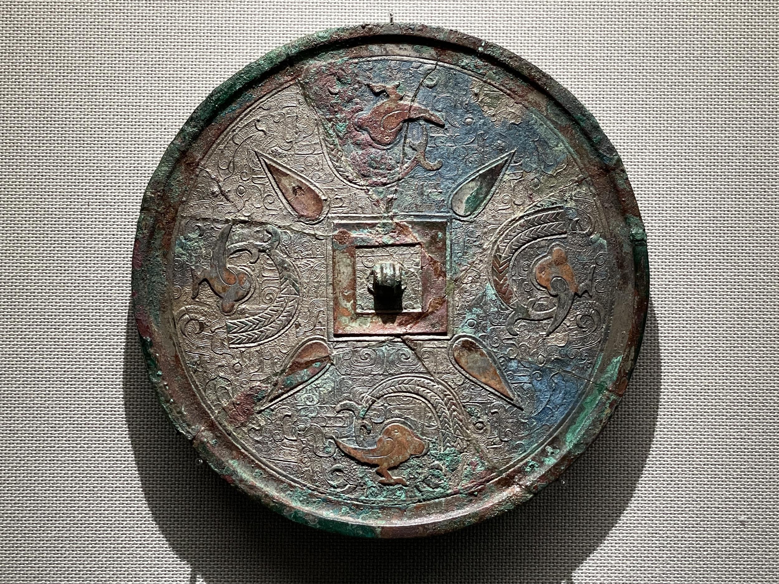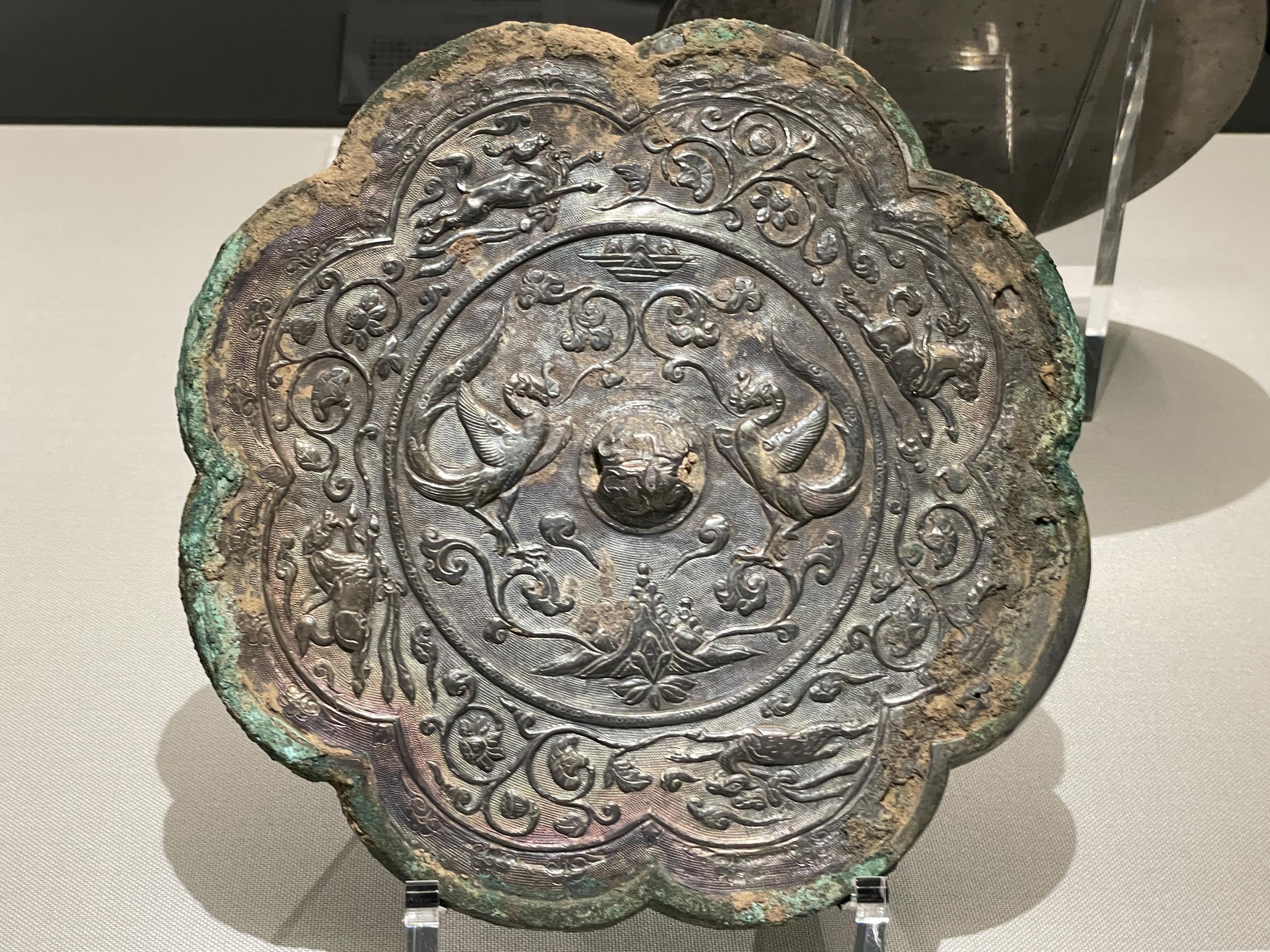 銀メダルの位置は仁寿狻猊鏡(じんじゅさんげいきょう、唐代7世紀)。白銀色は錫の含有量が多いことでもたらされると来村先生の動画で学びました。紐(中央の突起)のまわりに配置された8匹の狻猊(さんげい)は獅子のことらしい。