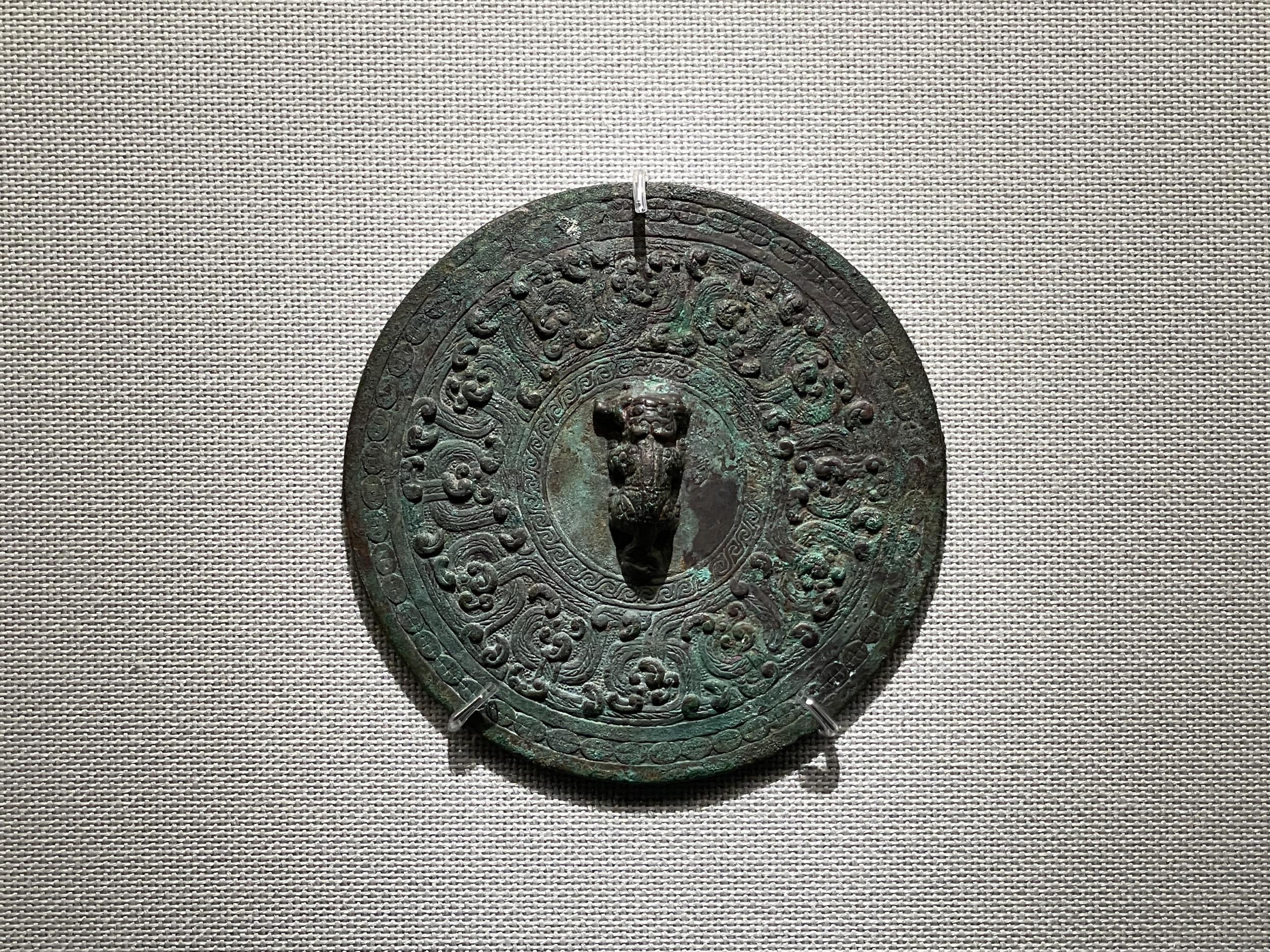 椿井大塚山古墳からも出土している内行花文鏡(後漢前期-AD1世紀)。神獣など具象的な図柄は描かれず抽象的な文様だけでまとめられたており、古代のデザイナーのセンスを感じさせます。