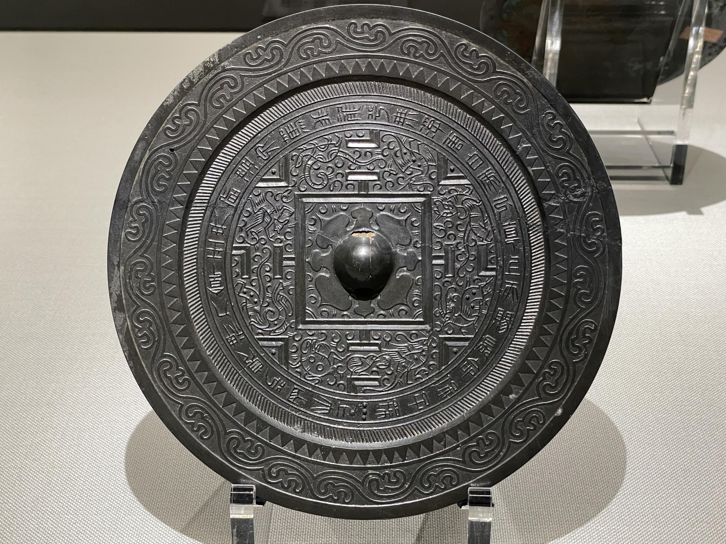 方格規矩四神神獣鏡(前漢末BC1-AD1世紀)、中央の方格(四角形)のまわりに規矩(TLV字状の幾何学模様)が配され、上に玄武、右に青龍、下に朱雀、左に白虎の線画、その外に隷書体の漢字が円を描いてます。紐の部分が僅かに欠けているものの艶々していて美しい。