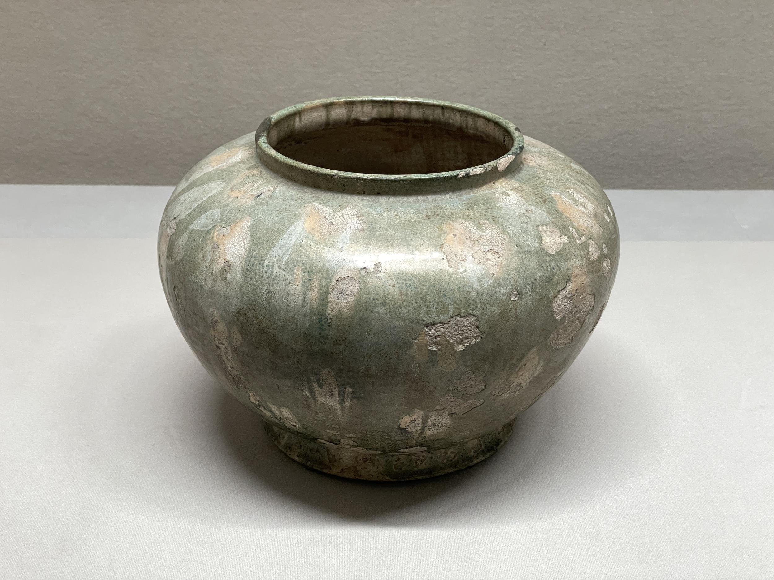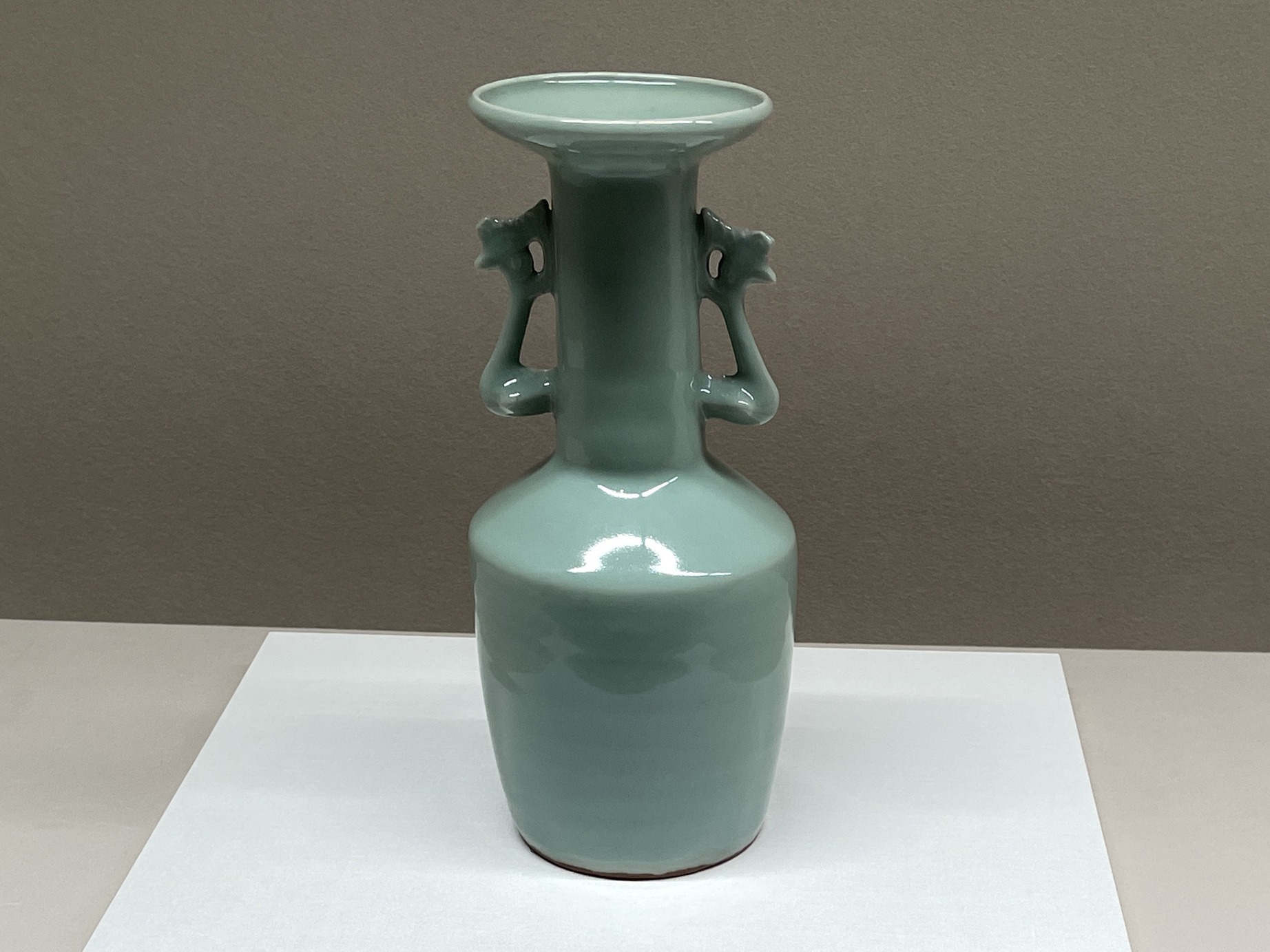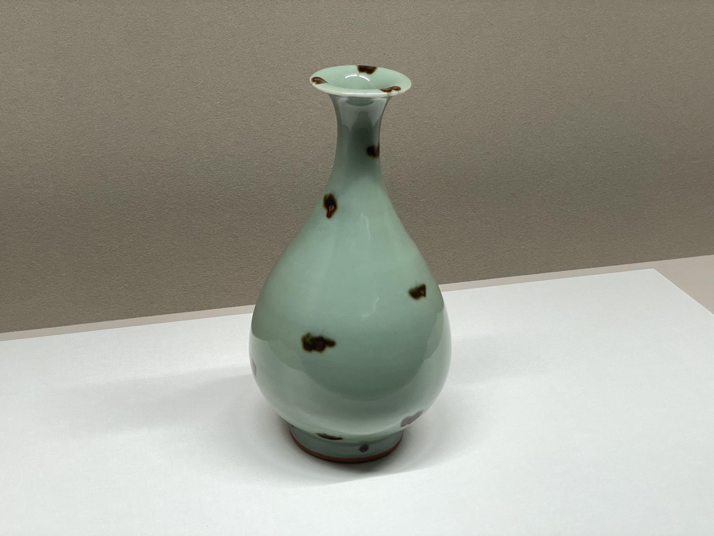国宝 飛青磁花生(とびせいじはないけ、元・14世紀 / 龍泉窯)、龍泉窯は浙江省龍泉市で盛んに青磁が生産された窯。鴻池家に伝来の品が安宅コレクションとなり住友グループを通じ大阪市に寄贈。本来酒器だったものが日本では花瓶として珍重されたらしい。キャッチフレーズは「完璧!」