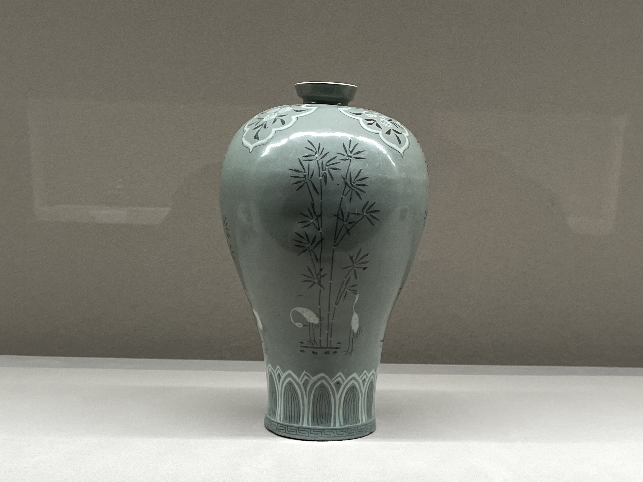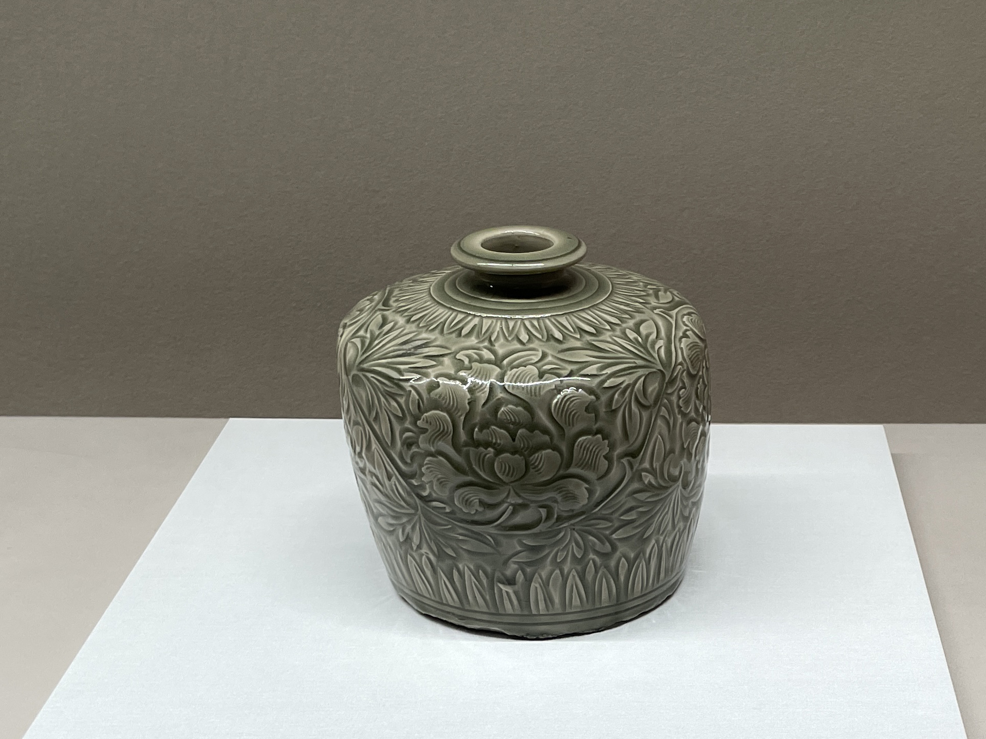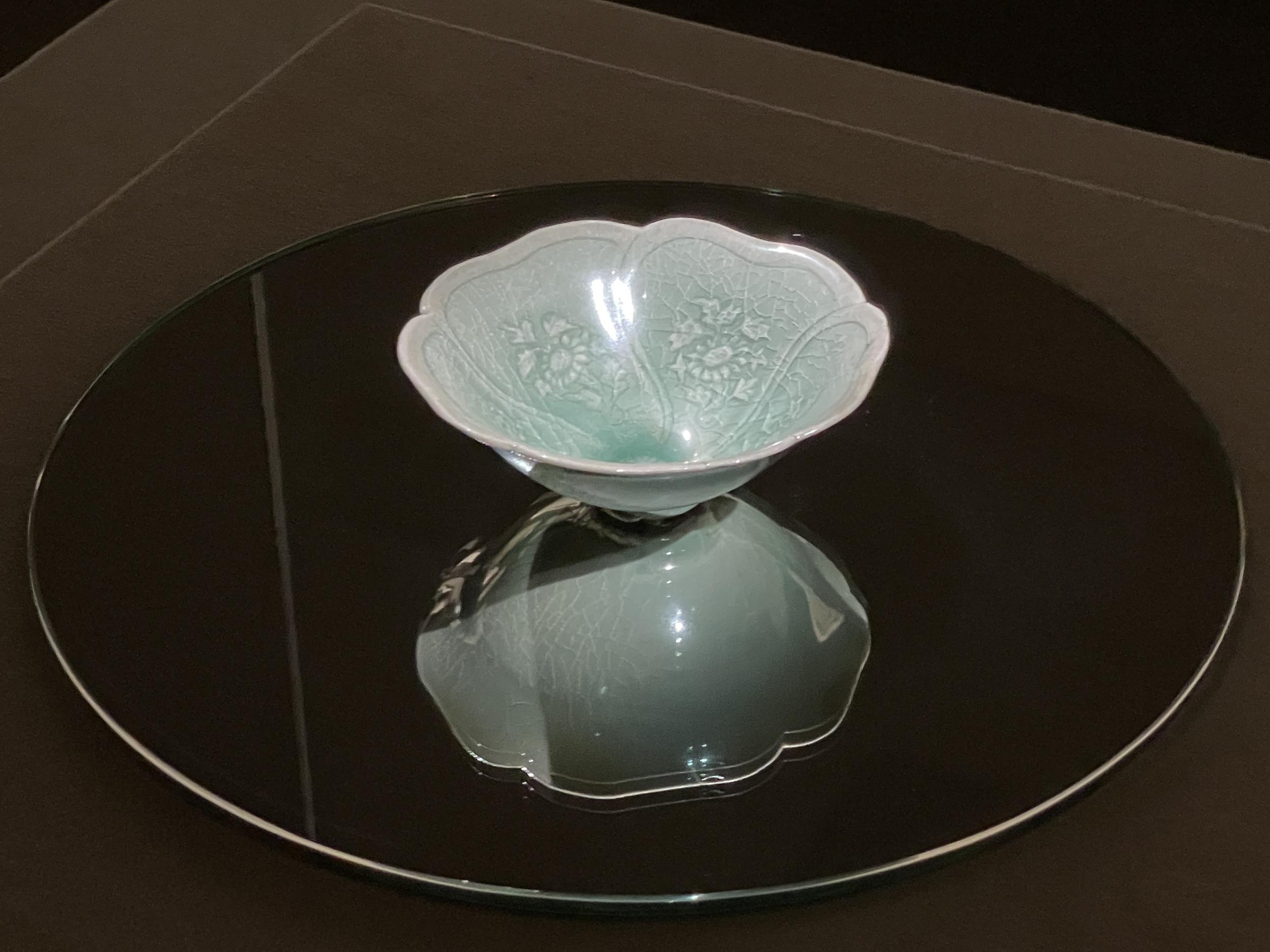 青磁象嵌同時宝相華唐草文水注(せいじぞうがんどうじほうそうげからくさもんすいちゅう、高麗・12世紀後半-13世紀前半)、真ん中に「ジャックと豆の木」のように蔦をよじ登る子どもが描かれた酒器で重要文化財 。作品毎にキャッチフレーズが記されていて鑑賞の参考になります。「童子は登るよ、どこまでも - So the boy keeps on Climbing」