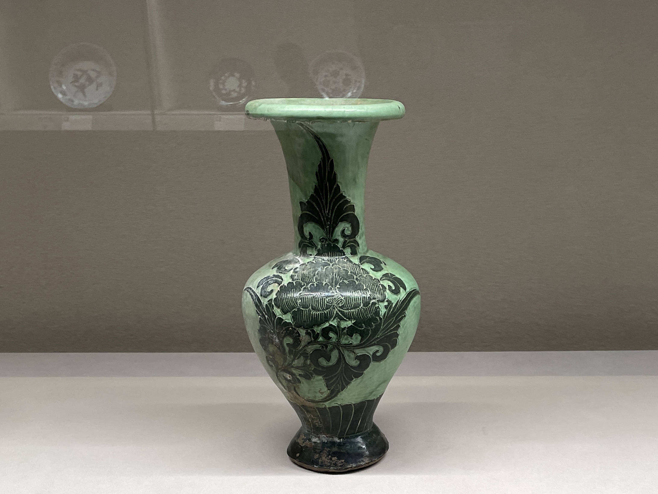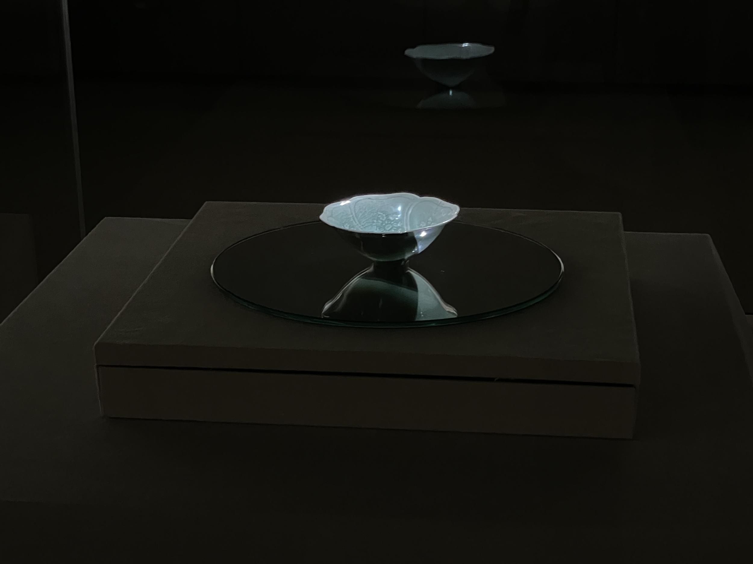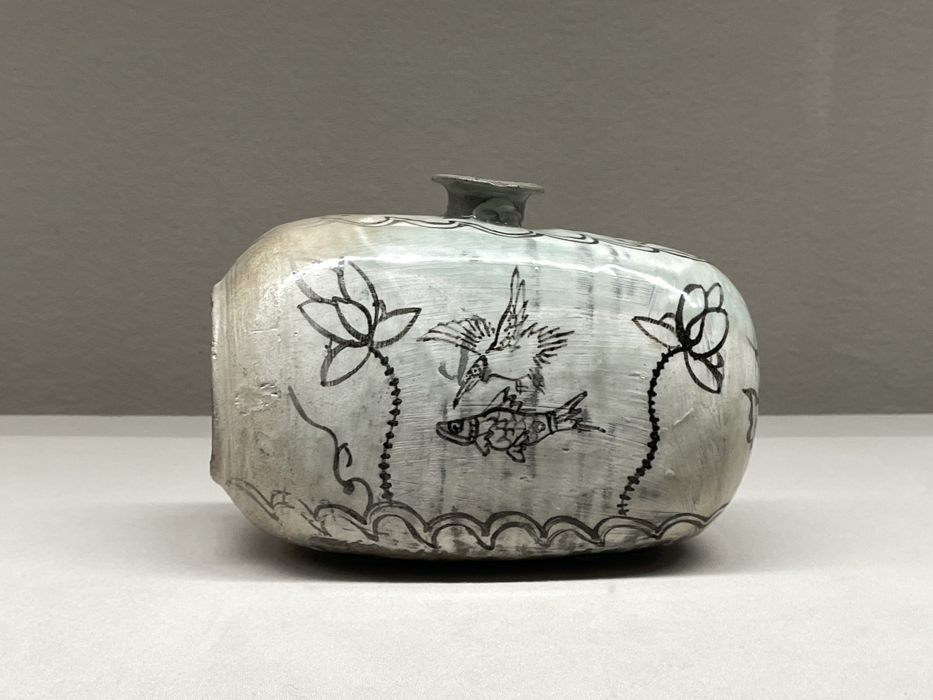 青磁象嵌同時宝相華唐草文水注(せいじぞうがんどうじほうそうげからくさもんすいちゅう、高麗・12世紀後半-13世紀前半)、真ん中に「ジャックと豆の木」のように蔦をよじ登る子どもが描かれた酒器で重要文化財 。作品毎にキャッチフレーズが記されていて鑑賞の参考になります。「童子は登るよ、どこまでも - So the boy keeps on Climbing」
