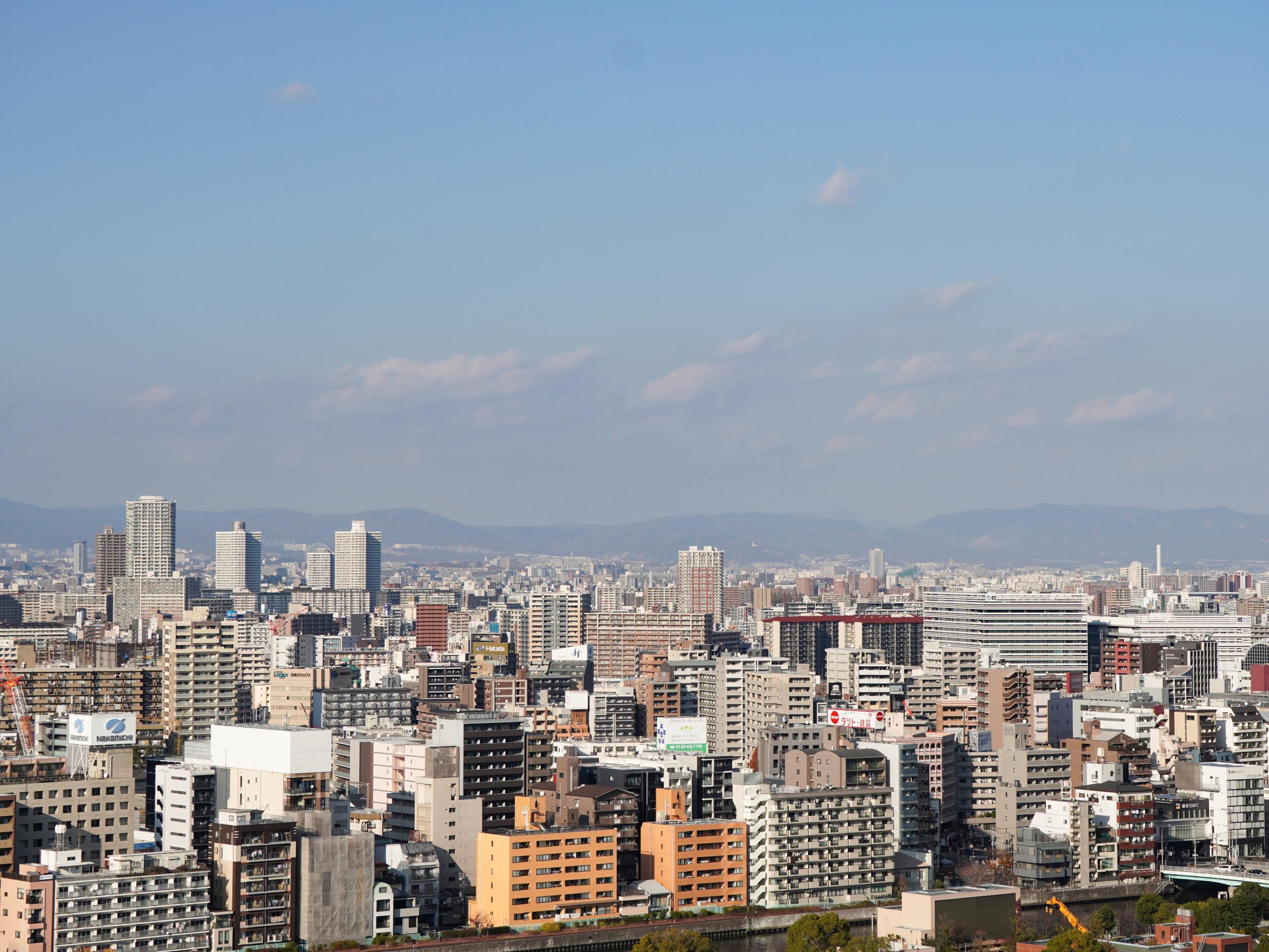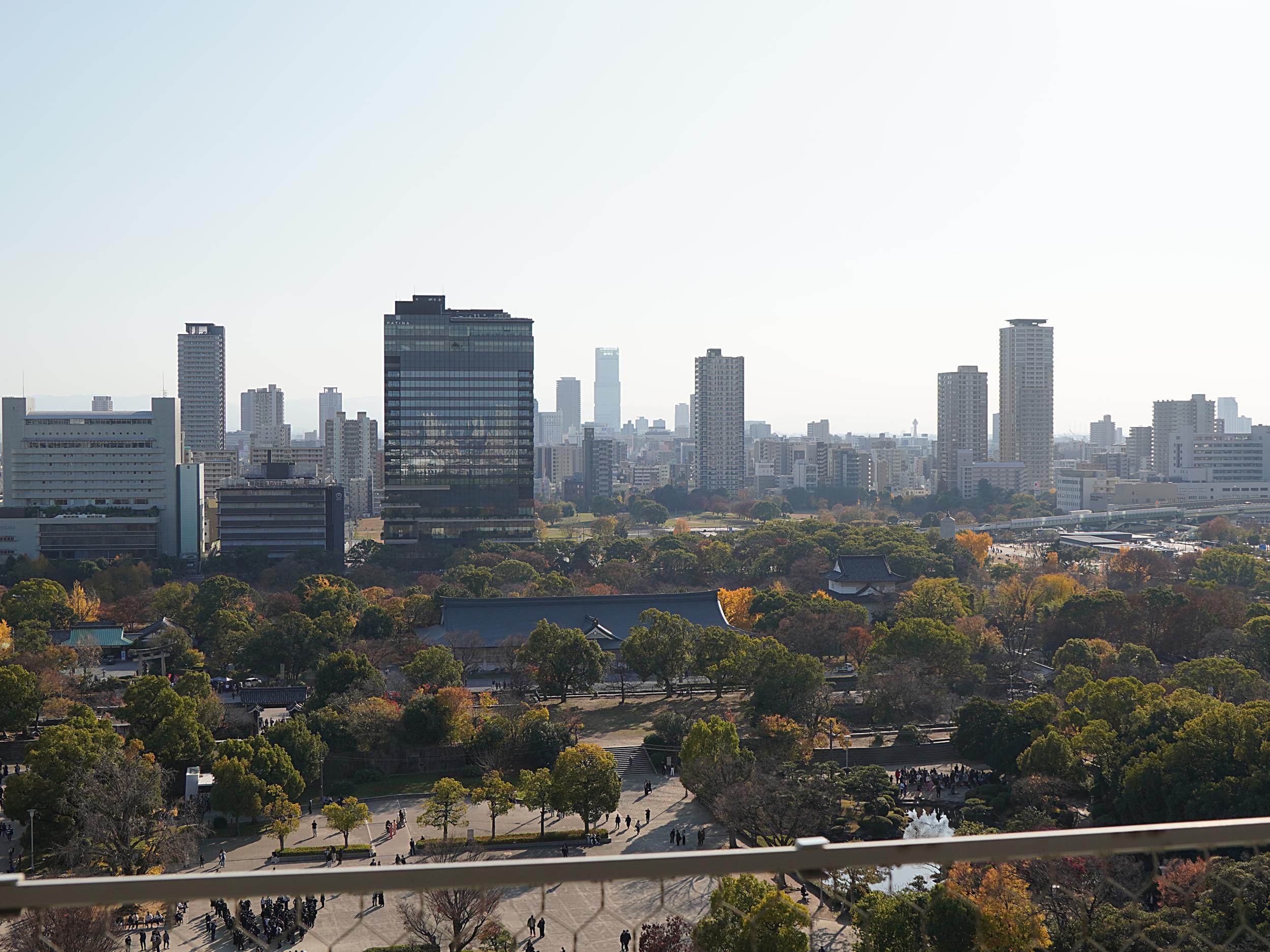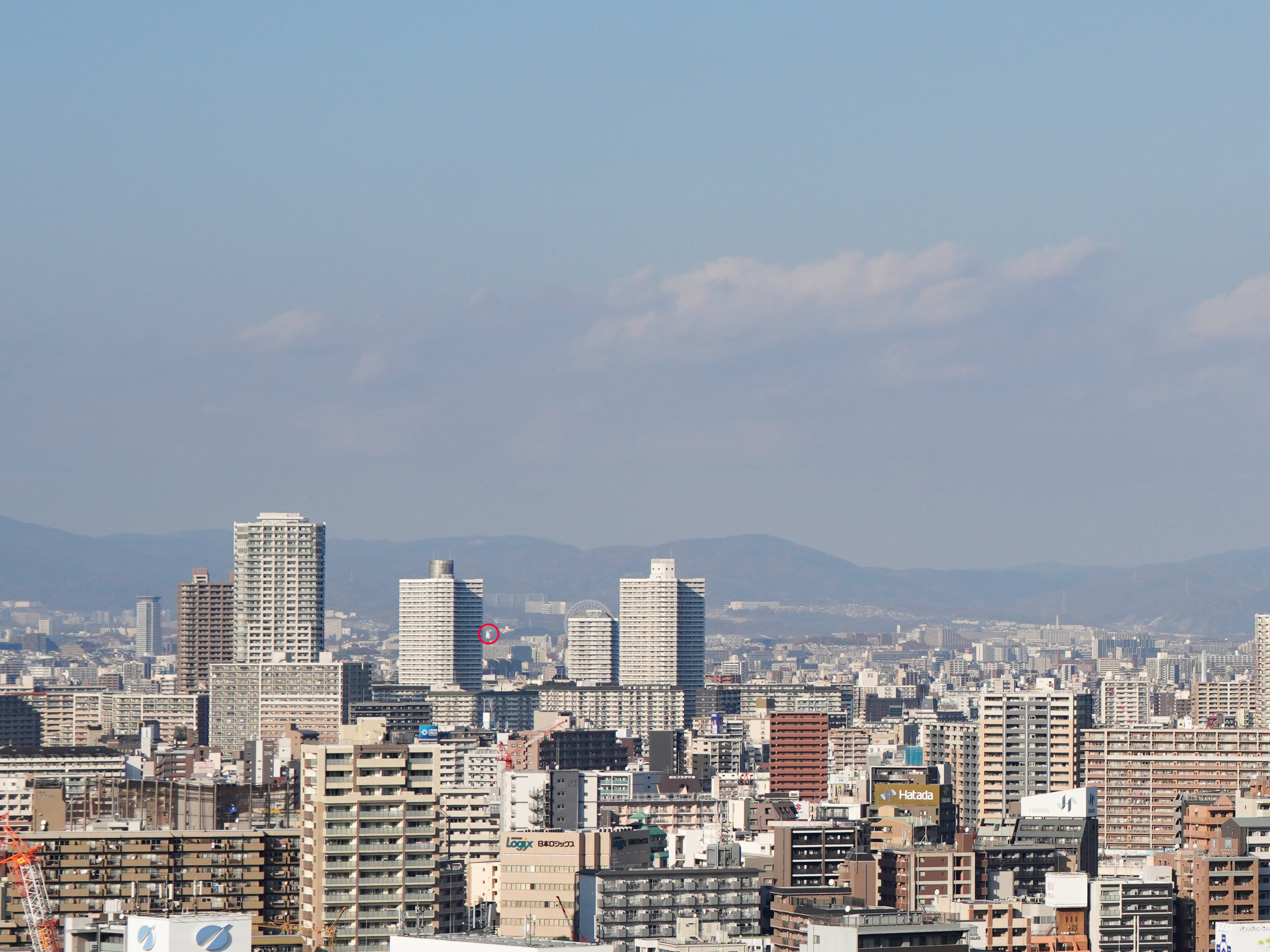 北側の景色です。よーく見ると太陽の塔が写ってました!まずエキスポシティのオオサカホイールが見つかるはず、その左手です。太陽の塔に赤い丸を付けてみました。