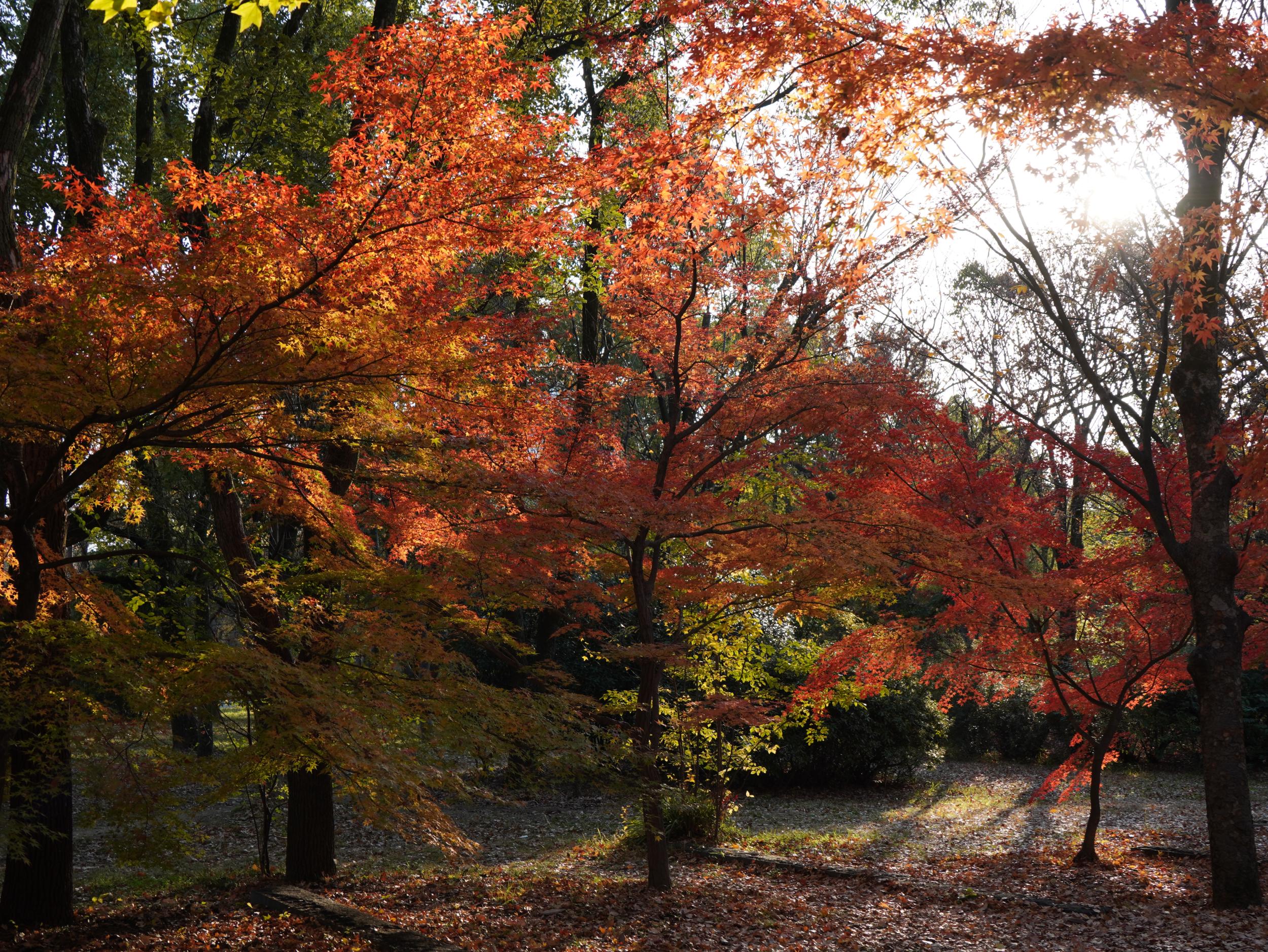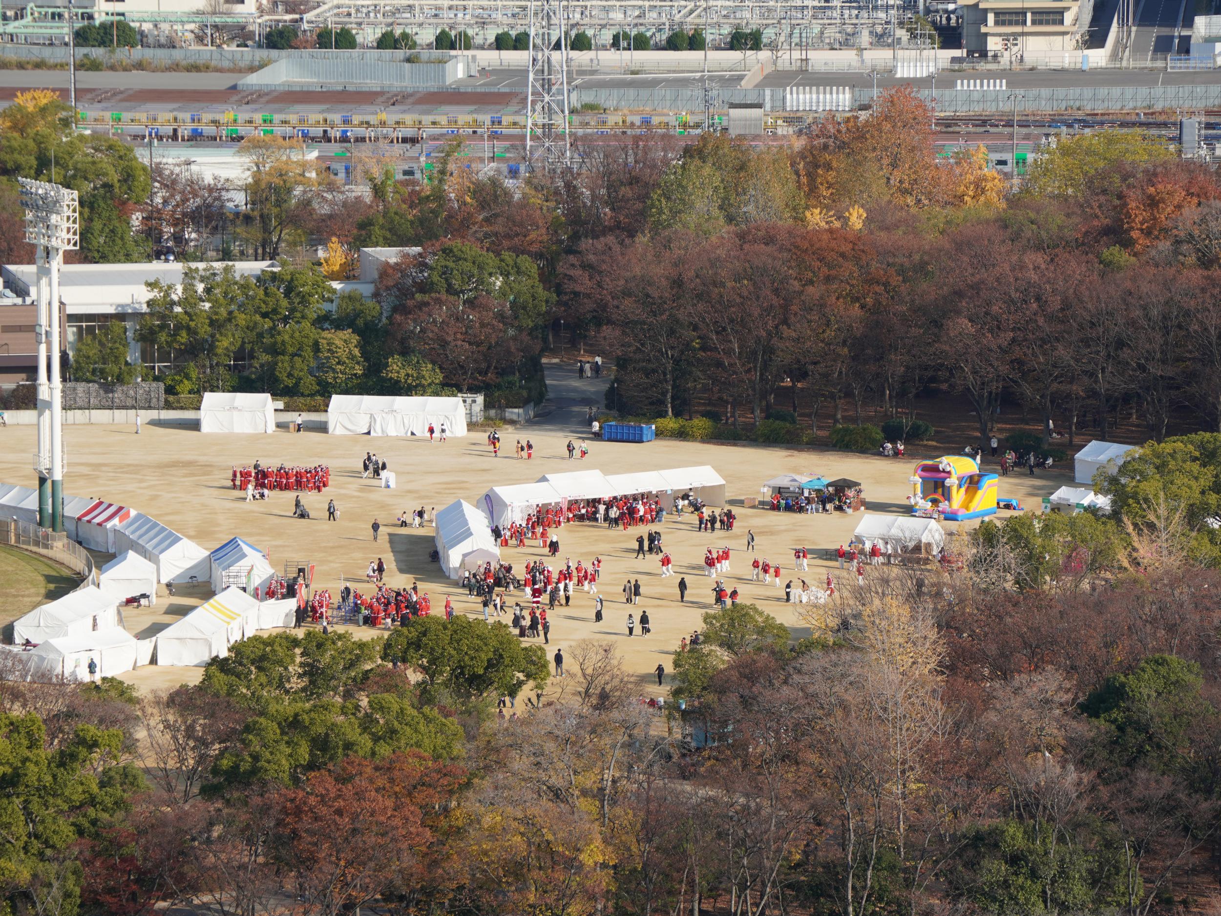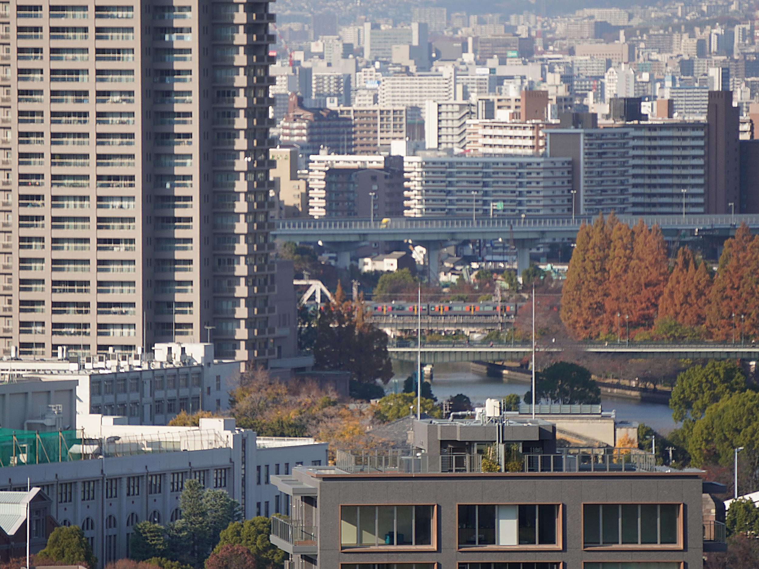 北側の景色です。よーく見ると太陽の塔が写ってました!まずエキスポシティのオオサカホイールが見つかるはず、その左手です。太陽の塔に赤い丸を付けてみました。
