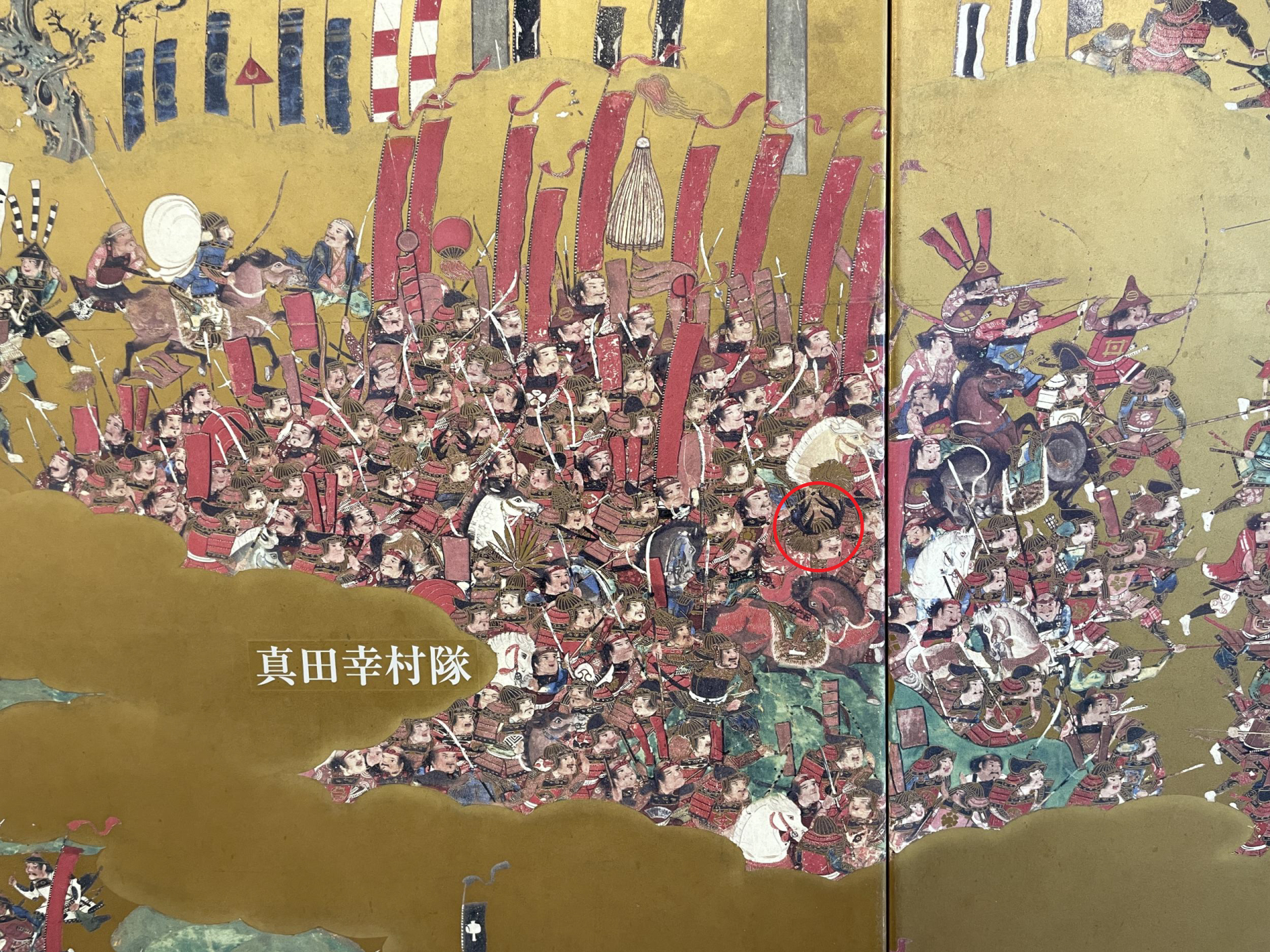 図屏風の武将たちの拡大パネルです。一心寺存牟堂で撮った写真に真田幸村を確認できたものの、徳川家康は見つけられず。